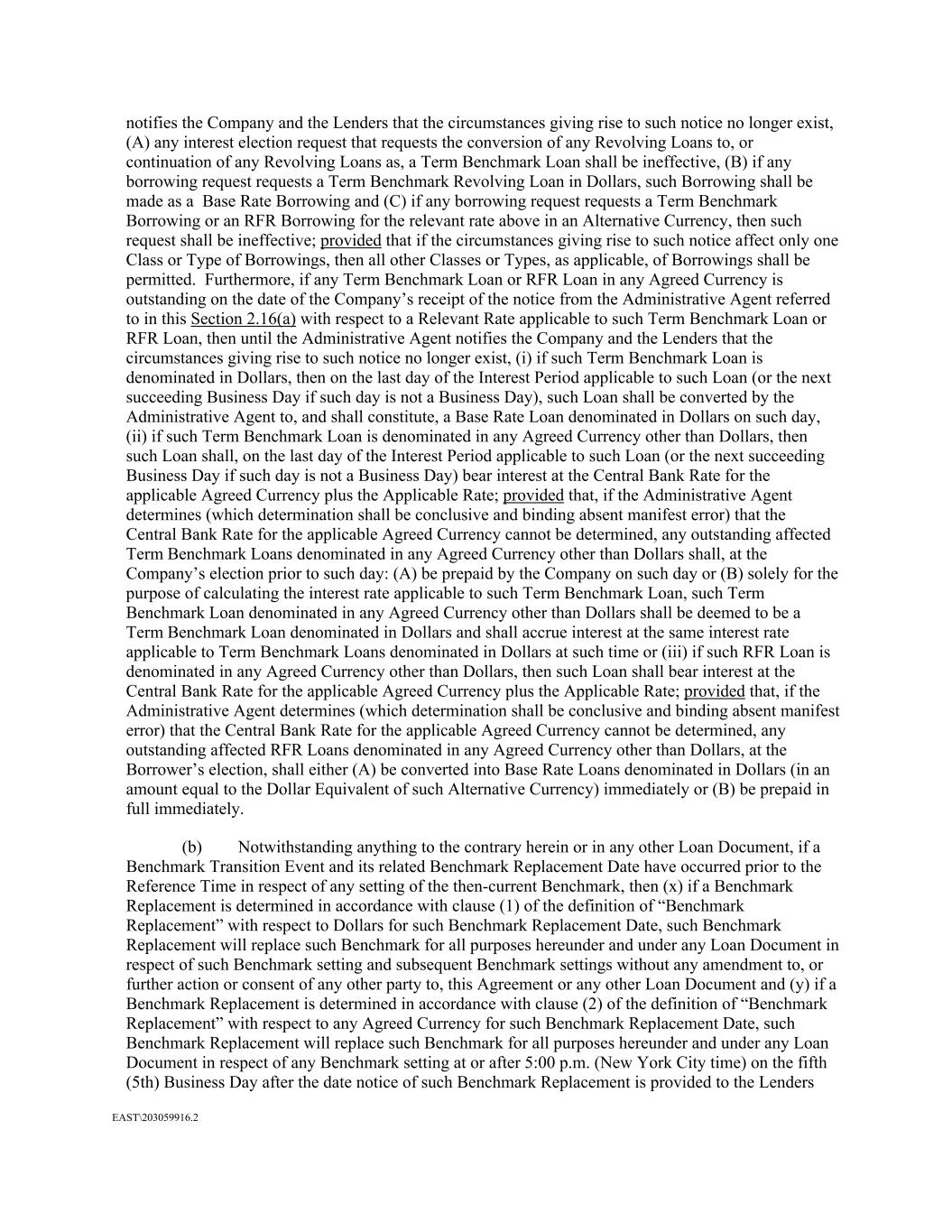 notifies the Company and the Lenders that the circumstances giving rise to such notice no longer exist, (A) any interest election request that requests the conversion of any Revolving Loans to, or continuation of any Revolving Loans as, a Term Benchmark Loan shall be ineffective, (B) if any borrowing request requests a Term Benchmark Revolving Loan in Dollars, such Borrowing shall be made as a Base Rate Borrowing and (C) if any borrowing request requests a Term Benchmark Borrowing or an RFR Borrowing for the relevant rate above in an Alternative Currency, then such request shall be ineffective; provided that if the circumstances giving rise to such notice affect only one Class or Type of Borrowings, then all other Classes or Types, as applicable, of Borrowings shall be permitted. Furthermore, if any Term Benchmark Loan or RFR Loan in any Agreed Currency is outstanding on the date of the Company’s receipt of the notice from the Administrative Agent referred to in this Section 2.16(a) with respect to a Relevant Rate applicable to such Term Benchmark Loan or RFR Loan, then until the Administrative Agent notifies the Company and the Lenders that the circumstances giving rise to such notice no longer exist, (i) if such Term Benchmark Loan is denominated in Dollars, then on the last day of the Interest Period applicable to such Loan (or the next succeeding Business Day if such day is not a Business Day), such Loan shall be converted by the Administrative Agent to, and shall constitute, a Base Rate Loan denominated in Dollars on such day, (ii) if such Term Benchmark Loan is denominated in any Agreed Currency other than Dollars, then such Loan shall, on the last day of the Interest Period applicable to such Loan (or the next succeeding Business Day if such day is not a Business Day) bear interest at the Central Bank Rate for the applicable Agreed Currency plus the Applicable Rate; provided that, if the Administrative Agent determines (which determination shall be conclusive and binding absent manifest error) that the Central Bank Rate for the applicable Agreed Currency cannot be determined, any outstanding affected Term Benchmark Loans denominated in any Agreed Currency other than Dollars shall, at the Company’s election prior to such day: (A) be prepaid by the Company on such day or (B) solely for the purpose of calculating the interest rate applicable to such Term Benchmark Loan, such Term Benchmark Loan denominated in any Agreed Currency other than Dollars shall be deemed to be a Term Benchmark Loan denominated in Dollars and shall accrue interest at the same interest rate applicable to Term Benchmark Loans denominated in Dollars at such time or (iii) if such RFR Loan is denominated in any Agreed Currency other than Dollars, then such Loan shall bear interest at the Central Bank Rate for the applicable Agreed Currency plus the Applicable Rate; provided that, if the Administrative Agent determines (which determination shall be conclusive and binding absent manifest error) that the Central Bank Rate for the applicable Agreed Currency cannot be determined, any outstanding affected RFR Loans denominated in any Agreed Currency other than Dollars, at the Borrower’s election, shall either (A) be converted into Base Rate Loans denominated in Dollars (in an amount equal to the Dollar Equivalent of such Alternative Currency) immediately or (B) be prepaid in full immediately. (b) Notwithstanding anything to the contrary herein or in any other Loan Document, if a Benchmark Transition Event and its related Benchmark Replacement Date have occurred prior to the Reference Time in respect of any setting of the then-current Benchmark, then (x) if a Benchmark Replacement is determined in accordance with clause (1) of the definition of “Benchmark Replacement” with respect to Dollars for such Benchmark Replacement Date, such Benchmark Replacement will replace such Benchmark for all purposes hereunder and under any Loan Document in respect of such Benchmark setting and subsequent Benchmark settings without any amendment to, or further action or consent of any other party to, this Agreement or any other Loan Document and (y) if a Benchmark Replacement is determined in accordance with clause (2) of the definition of “Benchmark Replacement” with respect to any Agreed Currency for such Benchmark Replacement Date, such Benchmark Replacement will replace such Benchmark for all purposes hereunder and under any Loan Document in respect of any Benchmark setting at or after 5:00 p.m. (New York City time) on the fifth (5th) Business Day after the date notice of such Benchmark Replacement is provided to the Lenders EAST\203059916.2