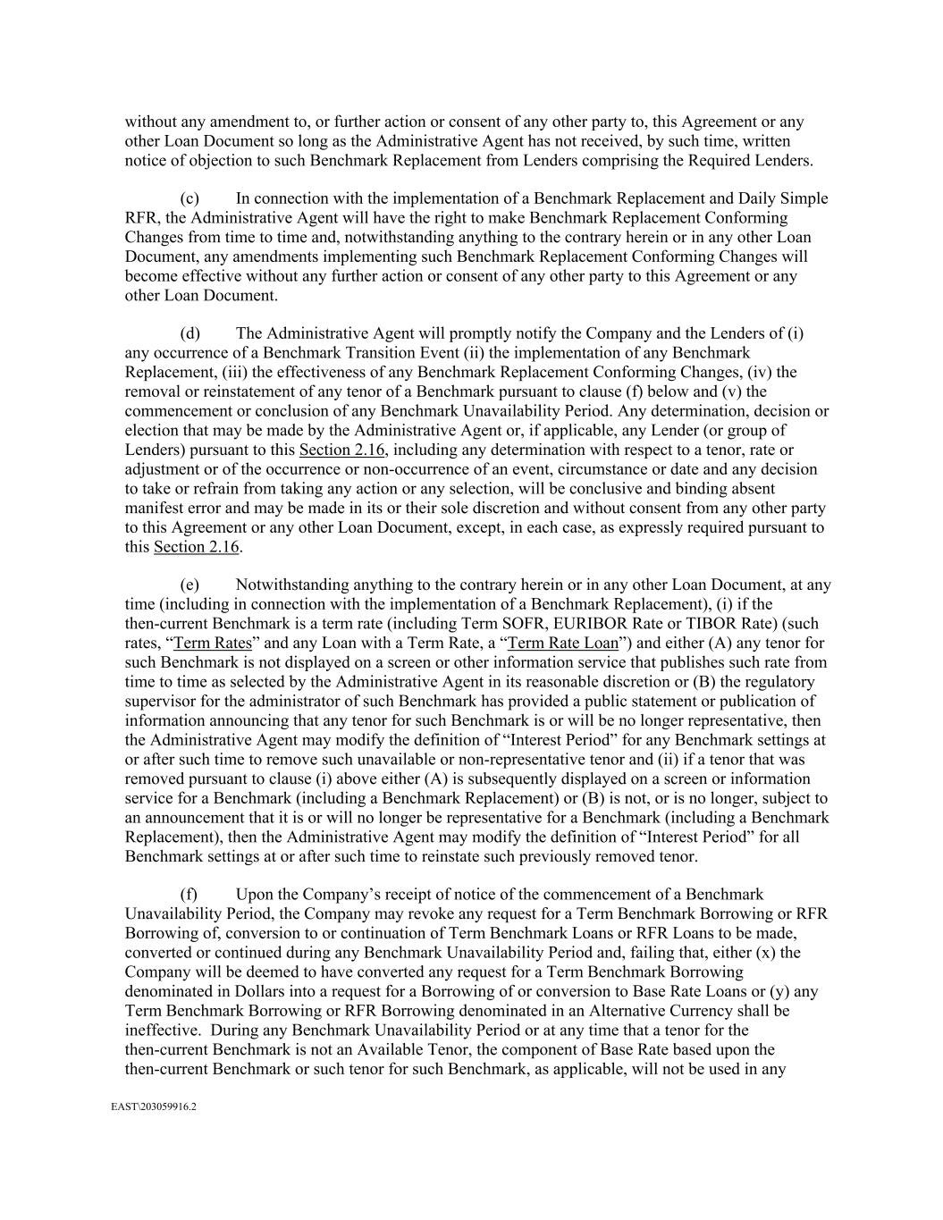 without any amendment to, or further action or consent of any other party to, this Agreement or any other Loan Document so long as the Administrative Agent has not received, by such time, written notice of objection to such Benchmark Replacement from Lenders comprising the Required Lenders. (c) In connection with the implementation of a Benchmark Replacement and Daily Simple RFR, the Administrative Agent will have the right to make Benchmark Replacement Conforming Changes from time to time and, notwithstanding anything to the contrary herein or in any other Loan Document, any amendments implementing such Benchmark Replacement Conforming Changes will become effective without any further action or consent of any other party to this Agreement or any other Loan Document. (d) The Administrative Agent will promptly notify the Company and the Lenders of (i) any occurrence of a Benchmark Transition Event (ii) the implementation of any Benchmark Replacement, (iii) the effectiveness of any Benchmark Replacement Conforming Changes, (iv) the removal or reinstatement of any tenor of a Benchmark pursuant to clause (f) below and (v) the commencement or conclusion of any Benchmark Unavailability Period. Any determination, decision or election that may be made by the Administrative Agent or, if applicable, any Lender (or group of Lenders) pursuant to this Section 2.16, including any determination with respect to a tenor, rate or adjustment or of the occurrence or non-occurrence of an event, circumstance or date and any decision to take or refrain from taking any action or any selection, will be conclusive and binding absent manifest error and may be made in its or their sole discretion and without consent from any other party to this Agreement or any other Loan Document, except, in each case, as expressly required pursuant to this Section 2.16. (e) Notwithstanding anything to the contrary herein or in any other Loan Document, at any time (including in connection with the implementation of a Benchmark Replacement), (i) if the then-current Benchmark is a term rate (including Term SOFR, EURIBOR Rate or TIBOR Rate) (such rates, “Term Rates” and any Loan with a Term Rate, a “Term Rate Loan”) and either (A) any tenor for such Benchmark is not displayed on a screen or other information service that publishes such rate from time to time as selected by the Administrative Agent in its reasonable discretion or (B) the regulatory supervisor for the administrator of such Benchmark has provided a public statement or publication of information announcing that any tenor for such Benchmark is or will be no longer representative, then the Administrative Agent may modify the definition of “Interest Period” for any Benchmark settings at or after such time to remove such unavailable or non-representative tenor and (ii) if a tenor that was removed pursuant to clause (i) above either (A) is subsequently displayed on a screen or information service for a Benchmark (including a Benchmark Replacement) or (B) is not, or is no longer, subject to an announcement that it is or will no longer be representative for a Benchmark (including a Benchmark Replacement), then the Administrative Agent may modify the definition of “Interest Period” for all Benchmark settings at or after such time to reinstate such previously removed tenor. (f) Upon the Company’s receipt of notice of the commencement of a Benchmark Unavailability Period, the Company may revoke any request for a Term Benchmark Borrowing or RFR Borrowing of, conversion to or continuation of Term Benchmark Loans or RFR Loans to be made, converted or continued during any Benchmark Unavailability Period and, failing that, either (x) the Company will be deemed to have converted any request for a Term Benchmark Borrowing denominated in Dollars into a request for a Borrowing of or conversion to Base Rate Loans or (y) any Term Benchmark Borrowing or RFR Borrowing denominated in an Alternative Currency shall be ineffective. During any Benchmark Unavailability Period or at any time that a tenor for the then-current Benchmark is not an Available Tenor, the component of Base Rate based upon the then-current Benchmark or such tenor for such Benchmark, as applicable, will not be used in any EAST\203059916.2