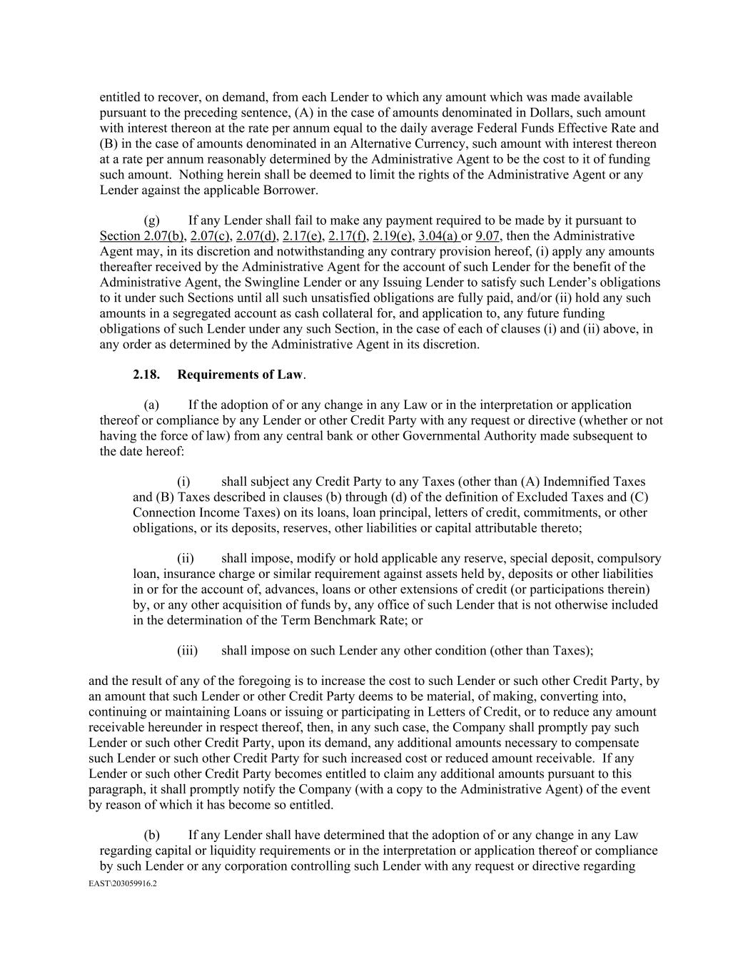 entitled to recover, on demand, from each Lender to which any amount which was made available pursuant to the preceding sentence, (A) in the case of amounts denominated in Dollars, such amount with interest thereon at the rate per annum equal to the daily average Federal Funds Effective Rate and (B) in the case of amounts denominated in an Alternative Currency, such amount with interest thereon at a rate per annum reasonably determined by the Administrative Agent to be the cost to it of funding such amount. Nothing herein shall be deemed to limit the rights of the Administrative Agent or any Lender against the applicable Borrower. (g) If any Lender shall fail to make any payment required to be made by it pursuant to Section 2.07(b), 2.07(c), 2.07(d), 2.17(e), 2.17(f), 2.19(e), 3.04(a) or 9.07, then the Administrative Agent may, in its discretion and notwithstanding any contrary provision hereof, (i) apply any amounts thereafter received by the Administrative Agent for the account of such Lender for the benefit of the Administrative Agent, the Swingline Lender or any Issuing Lender to satisfy such Lender’s obligations to it under such Sections until all such unsatisfied obligations are fully paid, and/or (ii) hold any such amounts in a segregated account as cash collateral for, and application to, any future funding obligations of such Lender under any such Section, in the case of each of clauses (i) and (ii) above, in any order as determined by the Administrative Agent in its discretion. 2.18. Requirements of Law. (a) If the adoption of or any change in any Law or in the interpretation or application thereof or compliance by any Lender or other Credit Party with any request or directive (whether or not having the force of law) from any central bank or other Governmental Authority made subsequent to the date hereof: (i) shall subject any Credit Party to any Taxes (other than (A) Indemnified Taxes and (B) Taxes described in clauses (b) through (d) of the definition of Excluded Taxes and (C) Connection Income Taxes) on its loans, loan principal, letters of credit, commitments, or other obligations, or its deposits, reserves, other liabilities or capital attributable thereto; (ii) shall impose, modify or hold applicable any reserve, special deposit, compulsory loan, insurance charge or similar requirement against assets held by, deposits or other liabilities in or for the account of, advances, loans or other extensions of credit (or participations therein) by, or any other acquisition of funds by, any office of such Lender that is not otherwise included in the determination of the Term Benchmark Rate; or (iii) shall impose on such Lender any other condition (other than Taxes); and the result of any of the foregoing is to increase the cost to such Lender or such other Credit Party, by an amount that such Lender or other Credit Party deems to be material, of making, converting into, continuing or maintaining Loans or issuing or participating in Letters of Credit, or to reduce any amount receivable hereunder in respect thereof, then, in any such case, the Company shall promptly pay such Lender or such other Credit Party, upon its demand, any additional amounts necessary to compensate such Lender or such other Credit Party for such increased cost or reduced amount receivable. If any Lender or such other Credit Party becomes entitled to claim any additional amounts pursuant to this paragraph, it shall promptly notify the Company (with a copy to the Administrative Agent) of the event by reason of which it has become so entitled. (b) If any Lender shall have determined that the adoption of or any change in any Law regarding capital or liquidity requirements or in the interpretation or application thereof or compliance by such Lender or any corporation controlling such Lender with any request or directive regarding EAST\203059916.2