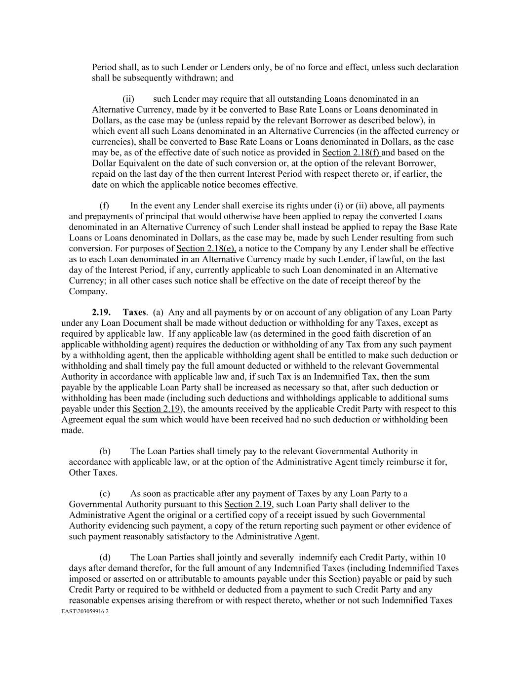 Period shall, as to such Lender or Lenders only, be of no force and effect, unless such declaration shall be subsequently withdrawn; and (ii) such Lender may require that all outstanding Loans denominated in an Alternative Currency, made by it be converted to Base Rate Loans or Loans denominated in Dollars, as the case may be (unless repaid by the relevant Borrower as described below), in which event all such Loans denominated in an Alternative Currencies (in the affected currency or currencies), shall be converted to Base Rate Loans or Loans denominated in Dollars, as the case may be, as of the effective date of such notice as provided in Section 2.18(f) and based on the Dollar Equivalent on the date of such conversion or, at the option of the relevant Borrower, repaid on the last day of the then current Interest Period with respect thereto or, if earlier, the date on which the applicable notice becomes effective. (f) In the event any Lender shall exercise its rights under (i) or (ii) above, all payments and prepayments of principal that would otherwise have been applied to repay the converted Loans denominated in an Alternative Currency of such Lender shall instead be applied to repay the Base Rate Loans or Loans denominated in Dollars, as the case may be, made by such Lender resulting from such conversion. For purposes of Section 2.18(e), a notice to the Company by any Lender shall be effective as to each Loan denominated in an Alternative Currency made by such Lender, if lawful, on the last day of the Interest Period, if any, currently applicable to such Loan denominated in an Alternative Currency; in all other cases such notice shall be effective on the date of receipt thereof by the Company. 2.19. Taxes. (a) Any and all payments by or on account of any obligation of any Loan Party under any Loan Document shall be made without deduction or withholding for any Taxes, except as required by applicable law. If any applicable law (as determined in the good faith discretion of an applicable withholding agent) requires the deduction or withholding of any Tax from any such payment by a withholding agent, then the applicable withholding agent shall be entitled to make such deduction or withholding and shall timely pay the full amount deducted or withheld to the relevant Governmental Authority in accordance with applicable law and, if such Tax is an Indemnified Tax, then the sum payable by the applicable Loan Party shall be increased as necessary so that, after such deduction or withholding has been made (including such deductions and withholdings applicable to additional sums payable under this Section 2.19), the amounts received by the applicable Credit Party with respect to this Agreement equal the sum which would have been received had no such deduction or withholding been made. (b) The Loan Parties shall timely pay to the relevant Governmental Authority in accordance with applicable law, or at the option of the Administrative Agent timely reimburse it for, Other Taxes. (c) As soon as practicable after any payment of Taxes by any Loan Party to a Governmental Authority pursuant to this Section 2.19, such Loan Party shall deliver to the Administrative Agent the original or a certified copy of a receipt issued by such Governmental Authority evidencing such payment, a copy of the return reporting such payment or other evidence of such payment reasonably satisfactory to the Administrative Agent. (d) The Loan Parties shall jointly and severally indemnify each Credit Party, within 10 days after demand therefor, for the full amount of any Indemnified Taxes (including Indemnified Taxes imposed or asserted on or attributable to amounts payable under this Section) payable or paid by such Credit Party or required to be withheld or deducted from a payment to such Credit Party and any reasonable expenses arising therefrom or with respect thereto, whether or not such Indemnified Taxes EAST\203059916.2