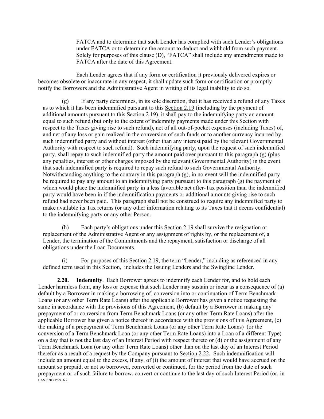 FATCA and to determine that such Lender has complied with such Lender’s obligations under FATCA or to determine the amount to deduct and withhold from such payment. Solely for purposes of this clause (D), “FATCA” shall include any amendments made to FATCA after the date of this Agreement. Each Lender agrees that if any form or certification it previously delivered expires or becomes obsolete or inaccurate in any respect, it shall update such form or certification or promptly notify the Borrowers and the Administrative Agent in writing of its legal inability to do so. (g) If any party determines, in its sole discretion, that it has received a refund of any Taxes as to which it has been indemnified pursuant to this Section 2.19 (including by the payment of additional amounts pursuant to this Section 2.19), it shall pay to the indemnifying party an amount equal to such refund (but only to the extent of indemnity payments made under this Section with respect to the Taxes giving rise to such refund), net of all out-of-pocket expenses (including Taxes) of, and net of any loss or gain realized in the conversion of such funds or to another currency incurred by, such indemnified party and without interest (other than any interest paid by the relevant Governmental Authority with respect to such refund). Such indemnifying party, upon the request of such indemnified party, shall repay to such indemnified party the amount paid over pursuant to this paragraph (g) (plus any penalties, interest or other charges imposed by the relevant Governmental Authority) in the event that such indemnified party is required to repay such refund to such Governmental Authority. Notwithstanding anything to the contrary in this paragraph (g), in no event will the indemnified party be required to pay any amount to an indemnifying party pursuant to this paragraph (g) the payment of which would place the indemnified party in a less favorable net after-Tax position than the indemnified party would have been in if the indemnification payments or additional amounts giving rise to such refund had never been paid. This paragraph shall not be construed to require any indemnified party to make available its Tax returns (or any other information relating to its Taxes that it deems confidential) to the indemnifying party or any other Person. (h) Each party’s obligations under this Section 2.19 shall survive the resignation or replacement of the Administrative Agent or any assignment of rights by, or the replacement of, a Lender, the termination of the Commitments and the repayment, satisfaction or discharge of all obligations under the Loan Documents. (i) For purposes of this Section 2.19, the term “Lender,” including as referenced in any defined term used in this Section, includes the Issuing Lenders and the Swingline Lender. 2.20. Indemnity. Each Borrower agrees to indemnify each Lender for, and to hold each Lender harmless from, any loss or expense that such Lender may sustain or incur as a consequence of (a) default by a Borrower in making a borrowing of, conversion into or continuation of Term Benchmark Loans (or any other Term Rate Loans) after the applicable Borrower has given a notice requesting the same in accordance with the provisions of this Agreement, (b) default by a Borrower in making any prepayment of or conversion from Term Benchmark Loans (or any other Term Rate Loans) after the applicable Borrower has given a notice thereof in accordance with the provisions of this Agreement, (c) the making of a prepayment of Term Benchmark Loans (or any other Term Rate Loans) (or the conversion of a Term Benchmark Loan (or any other Term Rate Loans) into a Loan of a different Type) on a day that is not the last day of an Interest Period with respect thereto or (d) or the assignment of any Term Benchmark Loan (or any other Term Rate Loans) other than on the last day of an Interest Period therefor as a result of a request by the Company pursuant to Section 2.22. Such indemnification will include an amount equal to the excess, if any, of (i) the amount of interest that would have accrued on the amount so prepaid, or not so borrowed, converted or continued, for the period from the date of such prepayment or of such failure to borrow, convert or continue to the last day of such Interest Period (or, in EAST\203059916.2