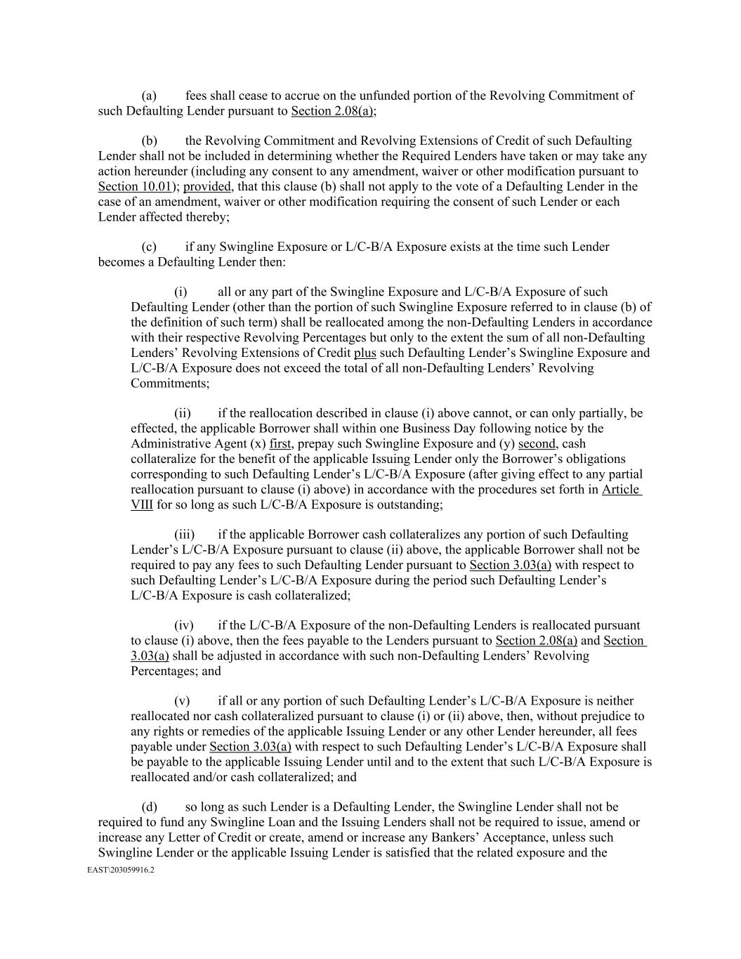 (a) fees shall cease to accrue on the unfunded portion of the Revolving Commitment of such Defaulting Lender pursuant to Section 2.08(a); (b) the Revolving Commitment and Revolving Extensions of Credit of such Defaulting Lender shall not be included in determining whether the Required Lenders have taken or may take any action hereunder (including any consent to any amendment, waiver or other modification pursuant to Section 10.01); provided, that this clause (b) shall not apply to the vote of a Defaulting Lender in the case of an amendment, waiver or other modification requiring the consent of such Lender or each Lender affected thereby; (c) if any Swingline Exposure or L/C-B/A Exposure exists at the time such Lender becomes a Defaulting Lender then: (i) all or any part of the Swingline Exposure and L/C-B/A Exposure of such Defaulting Lender (other than the portion of such Swingline Exposure referred to in clause (b) of the definition of such term) shall be reallocated among the non-Defaulting Lenders in accordance with their respective Revolving Percentages but only to the extent the sum of all non-Defaulting Lenders’ Revolving Extensions of Credit plus such Defaulting Lender’s Swingline Exposure and L/C-B/A Exposure does not exceed the total of all non-Defaulting Lenders’ Revolving Commitments; (ii) if the reallocation described in clause (i) above cannot, or can only partially, be effected, the applicable Borrower shall within one Business Day following notice by the Administrative Agent (x) first, prepay such Swingline Exposure and (y) second, cash collateralize for the benefit of the applicable Issuing Lender only the Borrower’s obligations corresponding to such Defaulting Lender’s L/C-B/A Exposure (after giving effect to any partial reallocation pursuant to clause (i) above) in accordance with the procedures set forth in Article VIII for so long as such L/C-B/A Exposure is outstanding; (iii) if the applicable Borrower cash collateralizes any portion of such Defaulting Lender’s L/C-B/A Exposure pursuant to clause (ii) above, the applicable Borrower shall not be required to pay any fees to such Defaulting Lender pursuant to Section 3.03(a) with respect to such Defaulting Lender’s L/C-B/A Exposure during the period such Defaulting Lender’s L/C-B/A Exposure is cash collateralized; (iv) if the L/C-B/A Exposure of the non-Defaulting Lenders is reallocated pursuant to clause (i) above, then the fees payable to the Lenders pursuant to Section 2.08(a) and Section 3.03(a) shall be adjusted in accordance with such non-Defaulting Lenders’ Revolving Percentages; and (v) if all or any portion of such Defaulting Lender’s L/C-B/A Exposure is neither reallocated nor cash collateralized pursuant to clause (i) or (ii) above, then, without prejudice to any rights or remedies of the applicable Issuing Lender or any other Lender hereunder, all fees payable under Section 3.03(a) with respect to such Defaulting Lender’s L/C-B/A Exposure shall be payable to the applicable Issuing Lender until and to the extent that such L/C-B/A Exposure is reallocated and/or cash collateralized; and (d) so long as such Lender is a Defaulting Lender, the Swingline Lender shall not be required to fund any Swingline Loan and the Issuing Lenders shall not be required to issue, amend or increase any Letter of Credit or create, amend or increase any Bankers’ Acceptance, unless such Swingline Lender or the applicable Issuing Lender is satisfied that the related exposure and the EAST\203059916.2