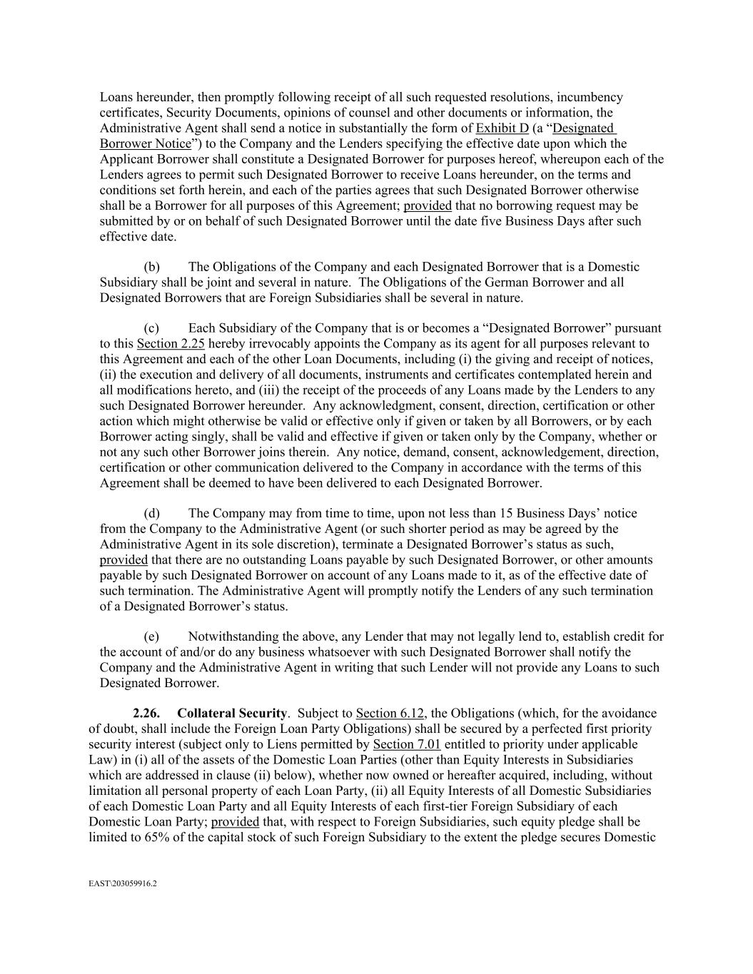 Loans hereunder, then promptly following receipt of all such requested resolutions, incumbency certificates, Security Documents, opinions of counsel and other documents or information, the Administrative Agent shall send a notice in substantially the form of Exhibit D (a “Designated Borrower Notice”) to the Company and the Lenders specifying the effective date upon which the Applicant Borrower shall constitute a Designated Borrower for purposes hereof, whereupon each of the Lenders agrees to permit such Designated Borrower to receive Loans hereunder, on the terms and conditions set forth herein, and each of the parties agrees that such Designated Borrower otherwise shall be a Borrower for all purposes of this Agreement; provided that no borrowing request may be submitted by or on behalf of such Designated Borrower until the date five Business Days after such effective date. (b) The Obligations of the Company and each Designated Borrower that is a Domestic Subsidiary shall be joint and several in nature. The Obligations of the German Borrower and all Designated Borrowers that are Foreign Subsidiaries shall be several in nature. (c) Each Subsidiary of the Company that is or becomes a “Designated Borrower” pursuant to this Section 2.25 hereby irrevocably appoints the Company as its agent for all purposes relevant to this Agreement and each of the other Loan Documents, including (i) the giving and receipt of notices, (ii) the execution and delivery of all documents, instruments and certificates contemplated herein and all modifications hereto, and (iii) the receipt of the proceeds of any Loans made by the Lenders to any such Designated Borrower hereunder. Any acknowledgment, consent, direction, certification or other action which might otherwise be valid or effective only if given or taken by all Borrowers, or by each Borrower acting singly, shall be valid and effective if given or taken only by the Company, whether or not any such other Borrower joins therein. Any notice, demand, consent, acknowledgement, direction, certification or other communication delivered to the Company in accordance with the terms of this Agreement shall be deemed to have been delivered to each Designated Borrower. (d) The Company may from time to time, upon not less than 15 Business Days’ notice from the Company to the Administrative Agent (or such shorter period as may be agreed by the Administrative Agent in its sole discretion), terminate a Designated Borrower’s status as such, provided that there are no outstanding Loans payable by such Designated Borrower, or other amounts payable by such Designated Borrower on account of any Loans made to it, as of the effective date of such termination. The Administrative Agent will promptly notify the Lenders of any such termination of a Designated Borrower’s status. (e) Notwithstanding the above, any Lender that may not legally lend to, establish credit for the account of and/or do any business whatsoever with such Designated Borrower shall notify the Company and the Administrative Agent in writing that such Lender will not provide any Loans to such Designated Borrower. 2.26. Collateral Security. Subject to Section 6.12, the Obligations (which, for the avoidance of doubt, shall include the Foreign Loan Party Obligations) shall be secured by a perfected first priority security interest (subject only to Liens permitted by Section 7.01 entitled to priority under applicable Law) in (i) all of the assets of the Domestic Loan Parties (other than Equity Interests in Subsidiaries which are addressed in clause (ii) below), whether now owned or hereafter acquired, including, without limitation all personal property of each Loan Party, (ii) all Equity Interests of all Domestic Subsidiaries of each Domestic Loan Party and all Equity Interests of each first-tier Foreign Subsidiary of each Domestic Loan Party; provided that, with respect to Foreign Subsidiaries, such equity pledge shall be limited to 65% of the capital stock of such Foreign Subsidiary to the extent the pledge secures Domestic EAST\203059916.2