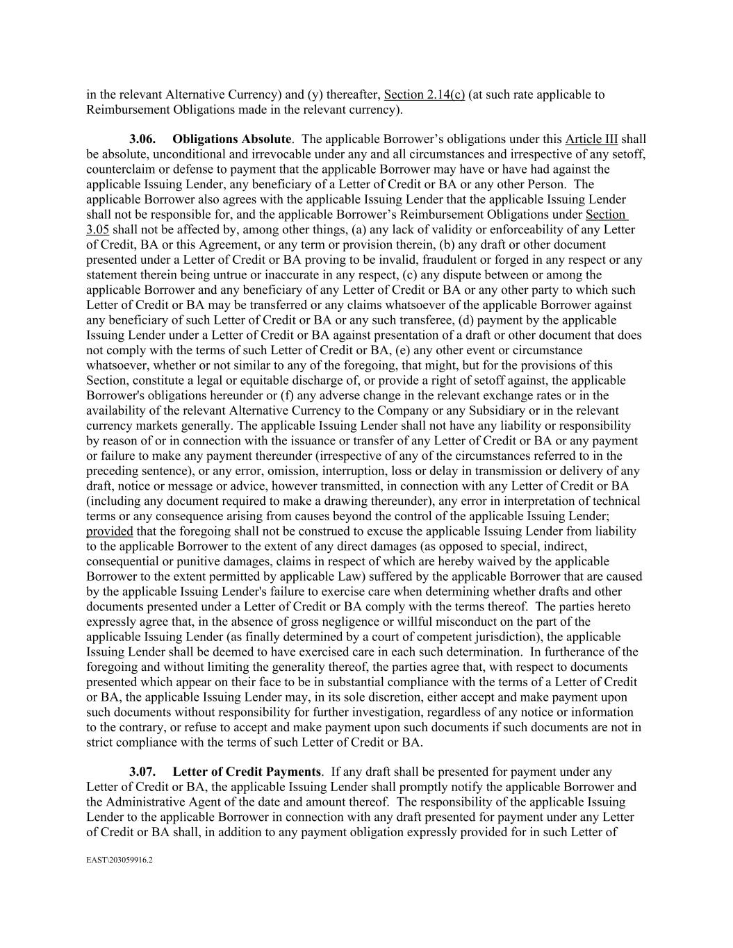 in the relevant Alternative Currency) and (y) thereafter, Section 2.14(c) (at such rate applicable to Reimbursement Obligations made in the relevant currency). 3.06. Obligations Absolute. The applicable Borrower’s obligations under this Article III shall be absolute, unconditional and irrevocable under any and all circumstances and irrespective of any setoff, counterclaim or defense to payment that the applicable Borrower may have or have had against the applicable Issuing Lender, any beneficiary of a Letter of Credit or BA or any other Person. The applicable Borrower also agrees with the applicable Issuing Lender that the applicable Issuing Lender shall not be responsible for, and the applicable Borrower’s Reimbursement Obligations under Section 3.05 shall not be affected by, among other things, (a) any lack of validity or enforceability of any Letter of Credit, BA or this Agreement, or any term or provision therein, (b) any draft or other document presented under a Letter of Credit or BA proving to be invalid, fraudulent or forged in any respect or any statement therein being untrue or inaccurate in any respect, (c) any dispute between or among the applicable Borrower and any beneficiary of any Letter of Credit or BA or any other party to which such Letter of Credit or BA may be transferred or any claims whatsoever of the applicable Borrower against any beneficiary of such Letter of Credit or BA or any such transferee, (d) payment by the applicable Issuing Lender under a Letter of Credit or BA against presentation of a draft or other document that does not comply with the terms of such Letter of Credit or BA, (e) any other event or circumstance whatsoever, whether or not similar to any of the foregoing, that might, but for the provisions of this Section, constitute a legal or equitable discharge of, or provide a right of setoff against, the applicable Borrower's obligations hereunder or (f) any adverse change in the relevant exchange rates or in the availability of the relevant Alternative Currency to the Company or any Subsidiary or in the relevant currency markets generally. The applicable Issuing Lender shall not have any liability or responsibility by reason of or in connection with the issuance or transfer of any Letter of Credit or BA or any payment or failure to make any payment thereunder (irrespective of any of the circumstances referred to in the preceding sentence), or any error, omission, interruption, loss or delay in transmission or delivery of any draft, notice or message or advice, however transmitted, in connection with any Letter of Credit or BA (including any document required to make a drawing thereunder), any error in interpretation of technical terms or any consequence arising from causes beyond the control of the applicable Issuing Lender; provided that the foregoing shall not be construed to excuse the applicable Issuing Lender from liability to the applicable Borrower to the extent of any direct damages (as opposed to special, indirect, consequential or punitive damages, claims in respect of which are hereby waived by the applicable Borrower to the extent permitted by applicable Law) suffered by the applicable Borrower that are caused by the applicable Issuing Lender's failure to exercise care when determining whether drafts and other documents presented under a Letter of Credit or BA comply with the terms thereof. The parties hereto expressly agree that, in the absence of gross negligence or willful misconduct on the part of the applicable Issuing Lender (as finally determined by a court of competent jurisdiction), the applicable Issuing Lender shall be deemed to have exercised care in each such determination. In furtherance of the foregoing and without limiting the generality thereof, the parties agree that, with respect to documents presented which appear on their face to be in substantial compliance with the terms of a Letter of Credit or BA, the applicable Issuing Lender may, in its sole discretion, either accept and make payment upon such documents without responsibility for further investigation, regardless of any notice or information to the contrary, or refuse to accept and make payment upon such documents if such documents are not in strict compliance with the terms of such Letter of Credit or BA. 3.07. Letter of Credit Payments. If any draft shall be presented for payment under any Letter of Credit or BA, the applicable Issuing Lender shall promptly notify the applicable Borrower and the Administrative Agent of the date and amount thereof. The responsibility of the applicable Issuing Lender to the applicable Borrower in connection with any draft presented for payment under any Letter of Credit or BA shall, in addition to any payment obligation expressly provided for in such Letter of EAST\203059916.2