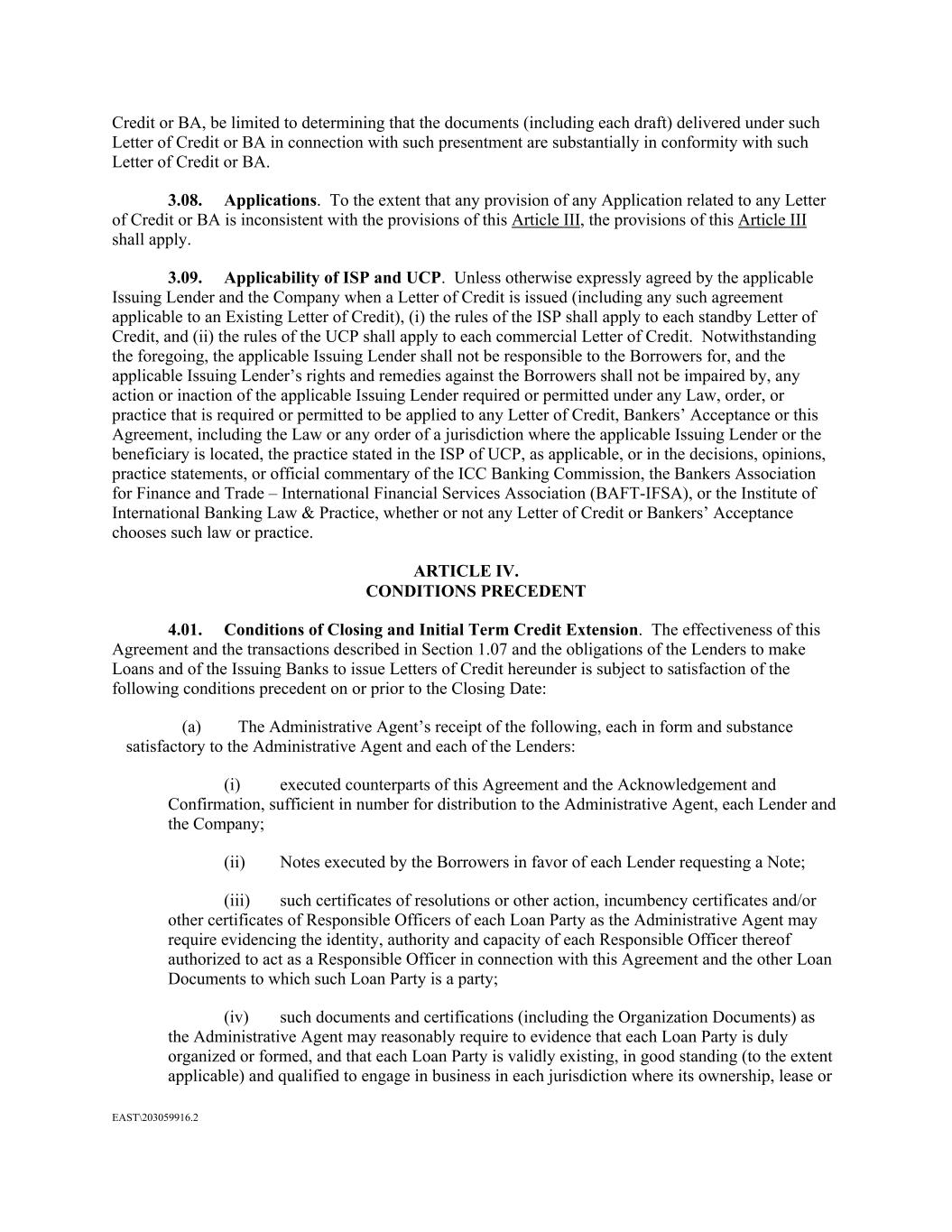 Credit or BA, be limited to determining that the documents (including each draft) delivered under such Letter of Credit or BA in connection with such presentment are substantially in conformity with such Letter of Credit or BA. 3.08. Applications. To the extent that any provision of any Application related to any Letter of Credit or BA is inconsistent with the provisions of this Article III, the provisions of this Article III shall apply. 3.09. Applicability of ISP and UCP. Unless otherwise expressly agreed by the applicable Issuing Lender and the Company when a Letter of Credit is issued (including any such agreement applicable to an Existing Letter of Credit), (i) the rules of the ISP shall apply to each standby Letter of Credit, and (ii) the rules of the UCP shall apply to each commercial Letter of Credit. Notwithstanding the foregoing, the applicable Issuing Lender shall not be responsible to the Borrowers for, and the applicable Issuing Lender’s rights and remedies against the Borrowers shall not be impaired by, any action or inaction of the applicable Issuing Lender required or permitted under any Law, order, or practice that is required or permitted to be applied to any Letter of Credit, Bankers’ Acceptance or this Agreement, including the Law or any order of a jurisdiction where the applicable Issuing Lender or the beneficiary is located, the practice stated in the ISP of UCP, as applicable, or in the decisions, opinions, practice statements, or official commentary of the ICC Banking Commission, the Bankers Association for Finance and Trade – International Financial Services Association (BAFT-IFSA), or the Institute of International Banking Law & Practice, whether or not any Letter of Credit or Bankers’ Acceptance chooses such law or practice. ARTICLE IV. CONDITIONS PRECEDENT 4.01. Conditions of Closing and Initial Term Credit Extension. The effectiveness of this Agreement and the transactions described in Section 1.07 and the obligations of the Lenders to make Loans and of the Issuing Banks to issue Letters of Credit hereunder is subject to satisfaction of the following conditions precedent on or prior to the Closing Date: (a) The Administrative Agent’s receipt of the following, each in form and substance satisfactory to the Administrative Agent and each of the Lenders: (i) executed counterparts of this Agreement and the Acknowledgement and Confirmation, sufficient in number for distribution to the Administrative Agent, each Lender and the Company; (ii) Notes executed by the Borrowers in favor of each Lender requesting a Note; (iii) such certificates of resolutions or other action, incumbency certificates and/or other certificates of Responsible Officers of each Loan Party as the Administrative Agent may require evidencing the identity, authority and capacity of each Responsible Officer thereof authorized to act as a Responsible Officer in connection with this Agreement and the other Loan Documents to which such Loan Party is a party; (iv) such documents and certifications (including the Organization Documents) as the Administrative Agent may reasonably require to evidence that each Loan Party is duly organized or formed, and that each Loan Party is validly existing, in good standing (to the extent applicable) and qualified to engage in business in each jurisdiction where its ownership, lease or EAST\203059916.2