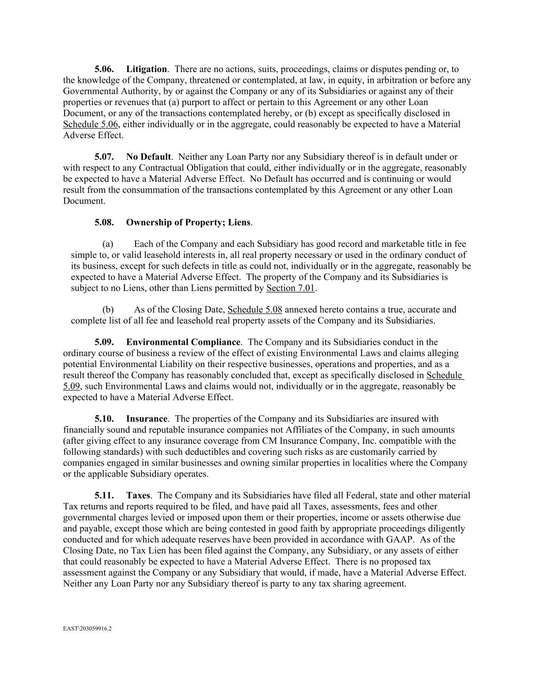 5.06. Litigation. There are no actions, suits, proceedings, claims or disputes pending or, to the knowledge of the Company, threatened or contemplated, at law, in equity, in arbitration or before any Governmental Authority, by or against the Company or any of its Subsidiaries or against any of their properties or revenues that (a) purport to affect or pertain to this Agreement or any other Loan Document, or any of the transactions contemplated hereby, or (b) except as specifically disclosed in Schedule 5.06, either individually or in the aggregate, could reasonably be expected to have a Material Adverse Effect. 5.07. No Default. Neither any Loan Party nor any Subsidiary thereof is in default under or with respect to any Contractual Obligation that could, either individually or in the aggregate, reasonably be expected to have a Material Adverse Effect. No Default has occurred and is continuing or would result from the consummation of the transactions contemplated by this Agreement or any other Loan Document. 5.08. Ownership of Property; Liens. (a) Each of the Company and each Subsidiary has good record and marketable title in fee simple to, or valid leasehold interests in, all real property necessary or used in the ordinary conduct of its business, except for such defects in title as could not, individually or in the aggregate, reasonably be expected to have a Material Adverse Effect. The property of the Company and its Subsidiaries is subject to no Liens, other than Liens permitted by Section 7.01. (b) As of the Closing Date, Schedule 5.08 annexed hereto contains a true, accurate and complete list of all fee and leasehold real property assets of the Company and its Subsidiaries. 5.09. Environmental Compliance. The Company and its Subsidiaries conduct in the ordinary course of business a review of the effect of existing Environmental Laws and claims alleging potential Environmental Liability on their respective businesses, operations and properties, and as a result thereof the Company has reasonably concluded that, except as specifically disclosed in Schedule 5.09, such Environmental Laws and claims would not, individually or in the aggregate, reasonably be expected to have a Material Adverse Effect. 5.10. Insurance. The properties of the Company and its Subsidiaries are insured with financially sound and reputable insurance companies not Affiliates of the Company, in such amounts (after giving effect to any insurance coverage from CM Insurance Company, Inc. compatible with the following standards) with such deductibles and covering such risks as are customarily carried by companies engaged in similar businesses and owning similar properties in localities where the Company or the applicable Subsidiary operates. 5.11. Taxes. The Company and its Subsidiaries have filed all Federal, state and other material Tax returns and reports required to be filed, and have paid all Taxes, assessments, fees and other governmental charges levied or imposed upon them or their properties, income or assets otherwise due and payable, except those which are being contested in good faith by appropriate proceedings diligently conducted and for which adequate reserves have been provided in accordance with GAAP. As of the Closing Date, no Tax Lien has been filed against the Company, any Subsidiary, or any assets of either that could reasonably be expected to have a Material Adverse Effect. There is no proposed tax assessment against the Company or any Subsidiary that would, if made, have a Material Adverse Effect. Neither any Loan Party nor any Subsidiary thereof is party to any tax sharing agreement. EAST\203059916.2