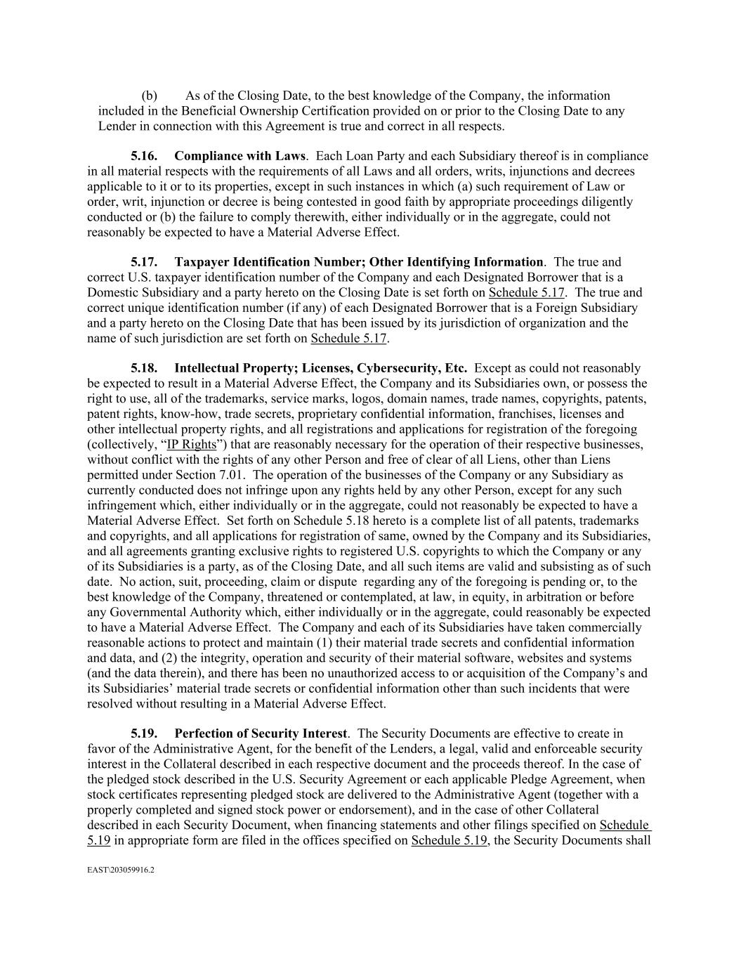 (b) As of the Closing Date, to the best knowledge of the Company, the information included in the Beneficial Ownership Certification provided on or prior to the Closing Date to any Lender in connection with this Agreement is true and correct in all respects. 5.16. Compliance with Laws. Each Loan Party and each Subsidiary thereof is in compliance in all material respects with the requirements of all Laws and all orders, writs, injunctions and decrees applicable to it or to its properties, except in such instances in which (a) such requirement of Law or order, writ, injunction or decree is being contested in good faith by appropriate proceedings diligently conducted or (b) the failure to comply therewith, either individually or in the aggregate, could not reasonably be expected to have a Material Adverse Effect. 5.17. Taxpayer Identification Number; Other Identifying Information. The true and correct U.S. taxpayer identification number of the Company and each Designated Borrower that is a Domestic Subsidiary and a party hereto on the Closing Date is set forth on Schedule 5.17. The true and correct unique identification number (if any) of each Designated Borrower that is a Foreign Subsidiary and a party hereto on the Closing Date that has been issued by its jurisdiction of organization and the name of such jurisdiction are set forth on Schedule 5.17. 5.18. Intellectual Property; Licenses, Cybersecurity, Etc. Except as could not reasonably be expected to result in a Material Adverse Effect, the Company and its Subsidiaries own, or possess the right to use, all of the trademarks, service marks, logos, domain names, trade names, copyrights, patents, patent rights, know-how, trade secrets, proprietary confidential information, franchises, licenses and other intellectual property rights, and all registrations and applications for registration of the foregoing (collectively, “IP Rights”) that are reasonably necessary for the operation of their respective businesses, without conflict with the rights of any other Person and free of clear of all Liens, other than Liens permitted under Section 7.01. The operation of the businesses of the Company or any Subsidiary as currently conducted does not infringe upon any rights held by any other Person, except for any such infringement which, either individually or in the aggregate, could not reasonably be expected to have a Material Adverse Effect. Set forth on Schedule 5.18 hereto is a complete list of all patents, trademarks and copyrights, and all applications for registration of same, owned by the Company and its Subsidiaries, and all agreements granting exclusive rights to registered U.S. copyrights to which the Company or any of its Subsidiaries is a party, as of the Closing Date, and all such items are valid and subsisting as of such date. No action, suit, proceeding, claim or dispute regarding any of the foregoing is pending or, to the best knowledge of the Company, threatened or contemplated, at law, in equity, in arbitration or before any Governmental Authority which, either individually or in the aggregate, could reasonably be expected to have a Material Adverse Effect. The Company and each of its Subsidiaries have taken commercially reasonable actions to protect and maintain (1) their material trade secrets and confidential information and data, and (2) the integrity, operation and security of their material software, websites and systems (and the data therein), and there has been no unauthorized access to or acquisition of the Company’s and its Subsidiaries’ material trade secrets or confidential information other than such incidents that were resolved without resulting in a Material Adverse Effect. 5.19. Perfection of Security Interest. The Security Documents are effective to create in favor of the Administrative Agent, for the benefit of the Lenders, a legal, valid and enforceable security interest in the Collateral described in each respective document and the proceeds thereof. In the case of the pledged stock described in the U.S. Security Agreement or each applicable Pledge Agreement, when stock certificates representing pledged stock are delivered to the Administrative Agent (together with a properly completed and signed stock power or endorsement), and in the case of other Collateral described in each Security Document, when financing statements and other filings specified on Schedule 5.19 in appropriate form are filed in the offices specified on Schedule 5.19, the Security Documents shall EAST\203059916.2