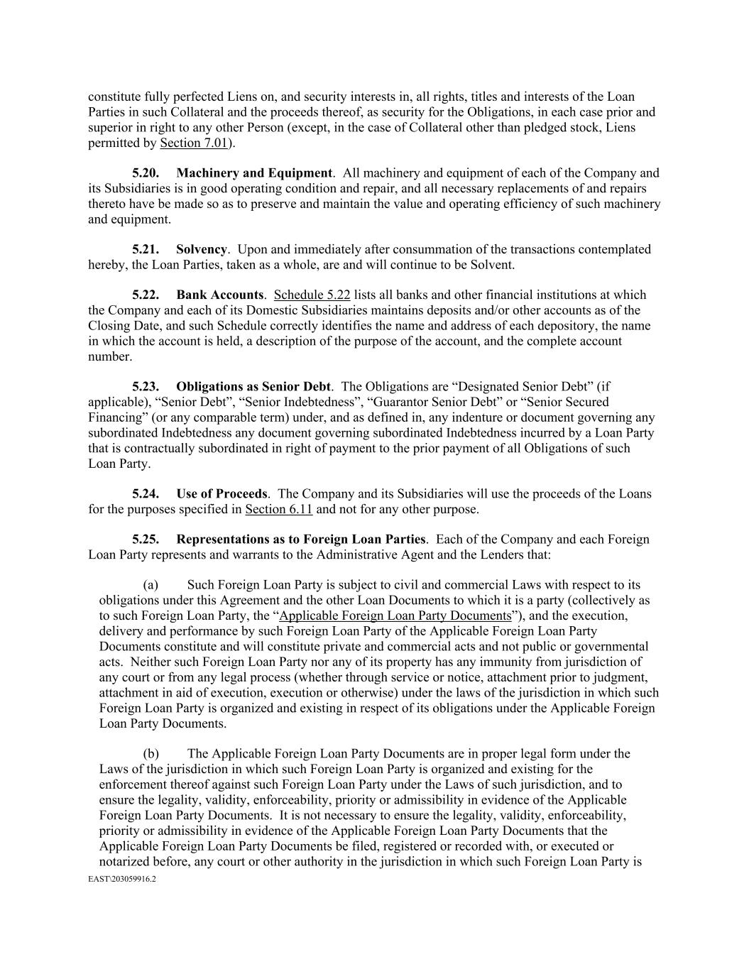 constitute fully perfected Liens on, and security interests in, all rights, titles and interests of the Loan Parties in such Collateral and the proceeds thereof, as security for the Obligations, in each case prior and superior in right to any other Person (except, in the case of Collateral other than pledged stock, Liens permitted by Section 7.01). 5.20. Machinery and Equipment. All machinery and equipment of each of the Company and its Subsidiaries is in good operating condition and repair, and all necessary replacements of and repairs thereto have be made so as to preserve and maintain the value and operating efficiency of such machinery and equipment. 5.21. Solvency. Upon and immediately after consummation of the transactions contemplated hereby, the Loan Parties, taken as a whole, are and will continue to be Solvent. 5.22. Bank Accounts. Schedule 5.22 lists all banks and other financial institutions at which the Company and each of its Domestic Subsidiaries maintains deposits and/or other accounts as of the Closing Date, and such Schedule correctly identifies the name and address of each depository, the name in which the account is held, a description of the purpose of the account, and the complete account number. 5.23. Obligations as Senior Debt. The Obligations are “Designated Senior Debt” (if applicable), “Senior Debt”, “Senior Indebtedness”, “Guarantor Senior Debt” or “Senior Secured Financing” (or any comparable term) under, and as defined in, any indenture or document governing any subordinated Indebtedness any document governing subordinated Indebtedness incurred by a Loan Party that is contractually subordinated in right of payment to the prior payment of all Obligations of such Loan Party. 5.24. Use of Proceeds. The Company and its Subsidiaries will use the proceeds of the Loans for the purposes specified in Section 6.11 and not for any other purpose. 5.25. Representations as to Foreign Loan Parties. Each of the Company and each Foreign Loan Party represents and warrants to the Administrative Agent and the Lenders that: (a) Such Foreign Loan Party is subject to civil and commercial Laws with respect to its obligations under this Agreement and the other Loan Documents to which it is a party (collectively as to such Foreign Loan Party, the “Applicable Foreign Loan Party Documents”), and the execution, delivery and performance by such Foreign Loan Party of the Applicable Foreign Loan Party Documents constitute and will constitute private and commercial acts and not public or governmental acts. Neither such Foreign Loan Party nor any of its property has any immunity from jurisdiction of any court or from any legal process (whether through service or notice, attachment prior to judgment, attachment in aid of execution, execution or otherwise) under the laws of the jurisdiction in which such Foreign Loan Party is organized and existing in respect of its obligations under the Applicable Foreign Loan Party Documents. (b) The Applicable Foreign Loan Party Documents are in proper legal form under the Laws of the jurisdiction in which such Foreign Loan Party is organized and existing for the enforcement thereof against such Foreign Loan Party under the Laws of such jurisdiction, and to ensure the legality, validity, enforceability, priority or admissibility in evidence of the Applicable Foreign Loan Party Documents. It is not necessary to ensure the legality, validity, enforceability, priority or admissibility in evidence of the Applicable Foreign Loan Party Documents that the Applicable Foreign Loan Party Documents be filed, registered or recorded with, or executed or notarized before, any court or other authority in the jurisdiction in which such Foreign Loan Party is EAST\203059916.2