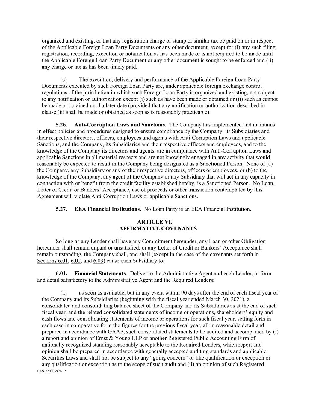 organized and existing, or that any registration charge or stamp or similar tax be paid on or in respect of the Applicable Foreign Loan Party Documents or any other document, except for (i) any such filing, registration, recording, execution or notarization as has been made or is not required to be made until the Applicable Foreign Loan Party Document or any other document is sought to be enforced and (ii) any charge or tax as has been timely paid. (c) The execution, delivery and performance of the Applicable Foreign Loan Party Documents executed by such Foreign Loan Party are, under applicable foreign exchange control regulations of the jurisdiction in which such Foreign Loan Party is organized and existing, not subject to any notification or authorization except (i) such as have been made or obtained or (ii) such as cannot be made or obtained until a later date (provided that any notification or authorization described in clause (ii) shall be made or obtained as soon as is reasonably practicable). 5.26. Anti-Corruption Laws and Sanctions. The Company has implemented and maintains in effect policies and procedures designed to ensure compliance by the Company, its Subsidiaries and their respective directors, officers, employees and agents with Anti-Corruption Laws and applicable Sanctions, and the Company, its Subsidiaries and their respective officers and employees, and to the knowledge of the Company its directors and agents, are in compliance with Anti-Corruption Laws and applicable Sanctions in all material respects and are not knowingly engaged in any activity that would reasonably be expected to result in the Company being designated as a Sanctioned Person. None of (a) the Company, any Subsidiary or any of their respective directors, officers or employees, or (b) to the knowledge of the Company, any agent of the Company or any Subsidiary that will act in any capacity in connection with or benefit from the credit facility established hereby, is a Sanctioned Person. No Loan, Letter of Credit or Bankers’ Acceptance, use of proceeds or other transaction contemplated by this Agreement will violate Anti-Corruption Laws or applicable Sanctions. 5.27. EEA Financial Institutions. No Loan Party is an EEA Financial Institution. ARTICLE VI. AFFIRMATIVE COVENANTS So long as any Lender shall have any Commitment hereunder, any Loan or other Obligation hereunder shall remain unpaid or unsatisfied, or any Letter of Credit or Bankers’ Acceptance shall remain outstanding, the Company shall, and shall (except in the case of the covenants set forth in Sections 6.01, 6.02, and 6.03) cause each Subsidiary to: 6.01. Financial Statements. Deliver to the Administrative Agent and each Lender, in form and detail satisfactory to the Administrative Agent and the Required Lenders: (a) as soon as available, but in any event within 90 days after the end of each fiscal year of the Company and its Subsidiaries (beginning with the fiscal year ended March 30, 2021), a consolidated and consolidating balance sheet of the Company and its Subsidiaries as at the end of such fiscal year, and the related consolidated statements of income or operations, shareholders’ equity and cash flows and consolidating statements of income or operations for such fiscal year, setting forth in each case in comparative form the figures for the previous fiscal year, all in reasonable detail and prepared in accordance with GAAP, such consolidated statements to be audited and accompanied by (i) a report and opinion of Ernst & Young LLP or another Registered Public Accounting Firm of nationally recognized standing reasonably acceptable to the Required Lenders, which report and opinion shall be prepared in accordance with generally accepted auditing standards and applicable Securities Laws and shall not be subject to any “going concern” or like qualification or exception or any qualification or exception as to the scope of such audit and (ii) an opinion of such Registered EAST\203059916.2