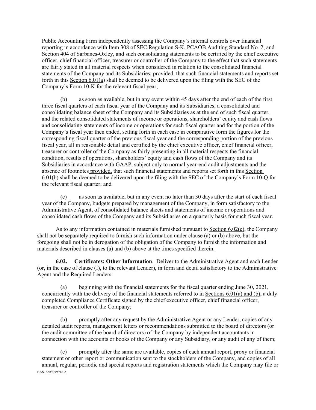 Public Accounting Firm independently assessing the Company’s internal controls over financial reporting in accordance with Item 308 of SEC Regulation S-K, PCAOB Auditing Standard No. 2, and Section 404 of Sarbanes-Oxley, and such consolidating statements to be certified by the chief executive officer, chief financial officer, treasurer or controller of the Company to the effect that such statements are fairly stated in all material respects when considered in relation to the consolidated financial statements of the Company and its Subsidiaries; provided, that such financial statements and reports set forth in this Section 6.01(a) shall be deemed to be delivered upon the filing with the SEC of the Company’s Form 10-K for the relevant fiscal year; (b) as soon as available, but in any event within 45 days after the end of each of the first three fiscal quarters of each fiscal year of the Company and its Subsidiaries, a consolidated and consolidating balance sheet of the Company and its Subsidiaries as at the end of such fiscal quarter, and the related consolidated statements of income or operations, shareholders’ equity and cash flows and consolidating statements of income or operations for such fiscal quarter and for the portion of the Company’s fiscal year then ended, setting forth in each case in comparative form the figures for the corresponding fiscal quarter of the previous fiscal year and the corresponding portion of the previous fiscal year, all in reasonable detail and certified by the chief executive officer, chief financial officer, treasurer or controller of the Company as fairly presenting in all material respects the financial condition, results of operations, shareholders’ equity and cash flows of the Company and its Subsidiaries in accordance with GAAP, subject only to normal year-end audit adjustments and the absence of footnotes provided, that such financial statements and reports set forth in this Section 6.01(b) shall be deemed to be delivered upon the filing with the SEC of the Company’s Form 10-Q for the relevant fiscal quarter; and (c) as soon as available, but in any event no later than 30 days after the start of each fiscal year of the Company, budgets prepared by management of the Company, in form satisfactory to the Administrative Agent, of consolidated balance sheets and statements of income or operations and consolidated cash flows of the Company and its Subsidiaries on a quarterly basis for such fiscal year. As to any information contained in materials furnished pursuant to Section 6.02(c), the Company shall not be separately required to furnish such information under clause (a) or (b) above, but the foregoing shall not be in derogation of the obligation of the Company to furnish the information and materials described in clauses (a) and (b) above at the times specified therein. 6.02. Certificates; Other Information. Deliver to the Administrative Agent and each Lender (or, in the case of clause (f), to the relevant Lender), in form and detail satisfactory to the Administrative Agent and the Required Lenders: (a) beginning with the financial statements for the fiscal quarter ending June 30, 2021, concurrently with the delivery of the financial statements referred to in Sections 6.01(a) and (b), a duly completed Compliance Certificate signed by the chief executive officer, chief financial officer, treasurer or controller of the Company; (b) promptly after any request by the Administrative Agent or any Lender, copies of any detailed audit reports, management letters or recommendations submitted to the board of directors (or the audit committee of the board of directors) of the Company by independent accountants in connection with the accounts or books of the Company or any Subsidiary, or any audit of any of them; (c) promptly after the same are available, copies of each annual report, proxy or financial statement or other report or communication sent to the stockholders of the Company, and copies of all annual, regular, periodic and special reports and registration statements which the Company may file or EAST\203059916.2