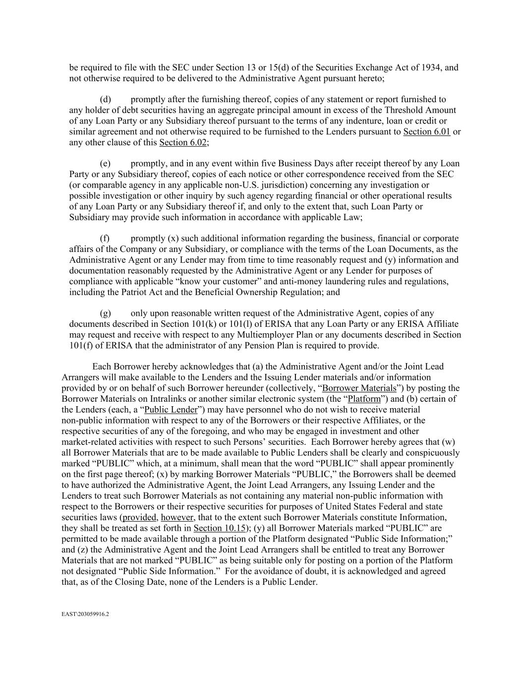 be required to file with the SEC under Section 13 or 15(d) of the Securities Exchange Act of 1934, and not otherwise required to be delivered to the Administrative Agent pursuant hereto; (d) promptly after the furnishing thereof, copies of any statement or report furnished to any holder of debt securities having an aggregate principal amount in excess of the Threshold Amount of any Loan Party or any Subsidiary thereof pursuant to the terms of any indenture, loan or credit or similar agreement and not otherwise required to be furnished to the Lenders pursuant to Section 6.01 or any other clause of this Section 6.02; (e) promptly, and in any event within five Business Days after receipt thereof by any Loan Party or any Subsidiary thereof, copies of each notice or other correspondence received from the SEC (or comparable agency in any applicable non-U.S. jurisdiction) concerning any investigation or possible investigation or other inquiry by such agency regarding financial or other operational results of any Loan Party or any Subsidiary thereof if, and only to the extent that, such Loan Party or Subsidiary may provide such information in accordance with applicable Law; (f) promptly (x) such additional information regarding the business, financial or corporate affairs of the Company or any Subsidiary, or compliance with the terms of the Loan Documents, as the Administrative Agent or any Lender may from time to time reasonably request and (y) information and documentation reasonably requested by the Administrative Agent or any Lender for purposes of compliance with applicable “know your customer” and anti-money laundering rules and regulations, including the Patriot Act and the Beneficial Ownership Regulation; and (g) only upon reasonable written request of the Administrative Agent, copies of any documents described in Section 101(k) or 101(l) of ERISA that any Loan Party or any ERISA Affiliate may request and receive with respect to any Multiemployer Plan or any documents described in Section 101(f) of ERISA that the administrator of any Pension Plan is required to provide. Each Borrower hereby acknowledges that (a) the Administrative Agent and/or the Joint Lead Arrangers will make available to the Lenders and the Issuing Lender materials and/or information provided by or on behalf of such Borrower hereunder (collectively, “Borrower Materials”) by posting the Borrower Materials on Intralinks or another similar electronic system (the “Platform”) and (b) certain of the Lenders (each, a “Public Lender”) may have personnel who do not wish to receive material non-public information with respect to any of the Borrowers or their respective Affiliates, or the respective securities of any of the foregoing, and who may be engaged in investment and other market-related activities with respect to such Persons’ securities. Each Borrower hereby agrees that (w) all Borrower Materials that are to be made available to Public Lenders shall be clearly and conspicuously marked “PUBLIC” which, at a minimum, shall mean that the word “PUBLIC” shall appear prominently on the first page thereof; (x) by marking Borrower Materials “PUBLIC,” the Borrowers shall be deemed to have authorized the Administrative Agent, the Joint Lead Arrangers, any Issuing Lender and the Lenders to treat such Borrower Materials as not containing any material non-public information with respect to the Borrowers or their respective securities for purposes of United States Federal and state securities laws (provided, however, that to the extent such Borrower Materials constitute Information, they shall be treated as set forth in Section 10.15); (y) all Borrower Materials marked “PUBLIC” are permitted to be made available through a portion of the Platform designated “Public Side Information;” and (z) the Administrative Agent and the Joint Lead Arrangers shall be entitled to treat any Borrower Materials that are not marked “PUBLIC” as being suitable only for posting on a portion of the Platform not designated “Public Side Information.” For the avoidance of doubt, it is acknowledged and agreed that, as of the Closing Date, none of the Lenders is a Public Lender. EAST\203059916.2