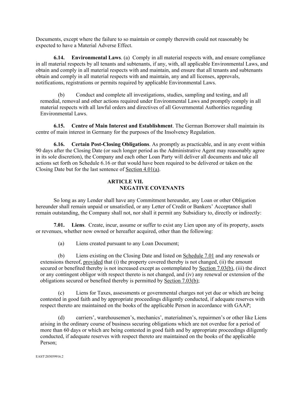 Documents, except where the failure to so maintain or comply therewith could not reasonably be expected to have a Material Adverse Effect. 6.14. Environmental Laws. (a) Comply in all material respects with, and ensure compliance in all material respects by all tenants and subtenants, if any, with, all applicable Environmental Laws, and obtain and comply in all material respects with and maintain, and ensure that all tenants and subtenants obtain and comply in all material respects with and maintain, any and all licenses, approvals, notifications, registrations or permits required by applicable Environmental Laws. (b) Conduct and complete all investigations, studies, sampling and testing, and all remedial, removal and other actions required under Environmental Laws and promptly comply in all material respects with all lawful orders and directives of all Governmental Authorities regarding Environmental Laws. 6.15. Centre of Main Interest and Establishment. The German Borrower shall maintain its centre of main interest in Germany for the purposes of the Insolvency Regulation. 6.16. Certain Post-Closing Obligations. As promptly as practicable, and in any event within 90 days after the Closing Date (or such longer period as the Administrative Agent may reasonably agree in its sole discretion), the Company and each other Loan Party will deliver all documents and take all actions set forth on Schedule 6.16 or that would have been required to be delivered or taken on the Closing Date but for the last sentence of Section 4.01(a). ARTICLE VII. NEGATIVE COVENANTS So long as any Lender shall have any Commitment hereunder, any Loan or other Obligation hereunder shall remain unpaid or unsatisfied, or any Letter of Credit or Bankers’ Acceptance shall remain outstanding, the Company shall not, nor shall it permit any Subsidiary to, directly or indirectly: 7.01. Liens. Create, incur, assume or suffer to exist any Lien upon any of its property, assets or revenues, whether now owned or hereafter acquired, other than the following: (a) Liens created pursuant to any Loan Document; (b) Liens existing on the Closing Date and listed on Schedule 7.01 and any renewals or extensions thereof, provided that (i) the property covered thereby is not changed, (ii) the amount secured or benefited thereby is not increased except as contemplated by Section 7.03(b), (iii) the direct or any contingent obligor with respect thereto is not changed, and (iv) any renewal or extension of the obligations secured or benefited thereby is permitted by Section 7.03(b); (c) Liens for Taxes, assessments or governmental charges not yet due or which are being contested in good faith and by appropriate proceedings diligently conducted, if adequate reserves with respect thereto are maintained on the books of the applicable Person in accordance with GAAP; (d) carriers’, warehousemen’s, mechanics’, materialmen’s, repairmen’s or other like Liens arising in the ordinary course of business securing obligations which are not overdue for a period of more than 60 days or which are being contested in good faith and by appropriate proceedings diligently conducted, if adequate reserves with respect thereto are maintained on the books of the applicable Person; EAST\203059916.2