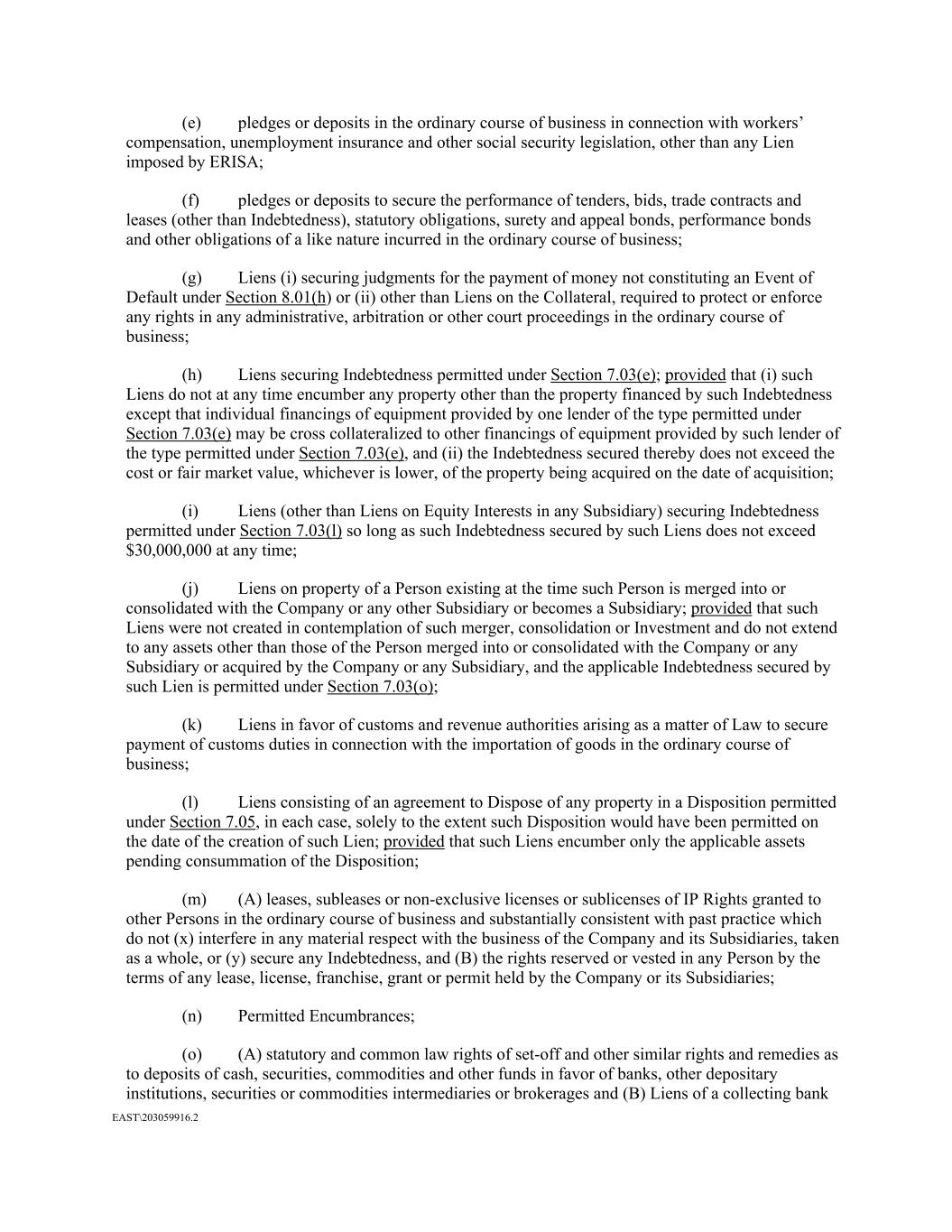 (e) pledges or deposits in the ordinary course of business in connection with workers’ compensation, unemployment insurance and other social security legislation, other than any Lien imposed by ERISA; (f) pledges or deposits to secure the performance of tenders, bids, trade contracts and leases (other than Indebtedness), statutory obligations, surety and appeal bonds, performance bonds and other obligations of a like nature incurred in the ordinary course of business; (g) Liens (i) securing judgments for the payment of money not constituting an Event of Default under Section 8.01(h) or (ii) other than Liens on the Collateral, required to protect or enforce any rights in any administrative, arbitration or other court proceedings in the ordinary course of business; (h) Liens securing Indebtedness permitted under Section 7.03(e); provided that (i) such Liens do not at any time encumber any property other than the property financed by such Indebtedness except that individual financings of equipment provided by one lender of the type permitted under Section 7.03(e) may be cross collateralized to other financings of equipment provided by such lender of the type permitted under Section 7.03(e), and (ii) the Indebtedness secured thereby does not exceed the cost or fair market value, whichever is lower, of the property being acquired on the date of acquisition; (i) Liens (other than Liens on Equity Interests in any Subsidiary) securing Indebtedness permitted under Section 7.03(l) so long as such Indebtedness secured by such Liens does not exceed $30,000,000 at any time; (j) Liens on property of a Person existing at the time such Person is merged into or consolidated with the Company or any other Subsidiary or becomes a Subsidiary; provided that such Liens were not created in contemplation of such merger, consolidation or Investment and do not extend to any assets other than those of the Person merged into or consolidated with the Company or any Subsidiary or acquired by the Company or any Subsidiary, and the applicable Indebtedness secured by such Lien is permitted under Section 7.03(o); (k) Liens in favor of customs and revenue authorities arising as a matter of Law to secure payment of customs duties in connection with the importation of goods in the ordinary course of business; (l) Liens consisting of an agreement to Dispose of any property in a Disposition permitted under Section 7.05, in each case, solely to the extent such Disposition would have been permitted on the date of the creation of such Lien; provided that such Liens encumber only the applicable assets pending consummation of the Disposition; (m) (A) leases, subleases or non-exclusive licenses or sublicenses of IP Rights granted to other Persons in the ordinary course of business and substantially consistent with past practice which do not (x) interfere in any material respect with the business of the Company and its Subsidiaries, taken as a whole, or (y) secure any Indebtedness, and (B) the rights reserved or vested in any Person by the terms of any lease, license, franchise, grant or permit held by the Company or its Subsidiaries; (n) Permitted Encumbrances; (o) (A) statutory and common law rights of set-off and other similar rights and remedies as to deposits of cash, securities, commodities and other funds in favor of banks, other depositary institutions, securities or commodities intermediaries or brokerages and (B) Liens of a collecting bank EAST\203059916.2