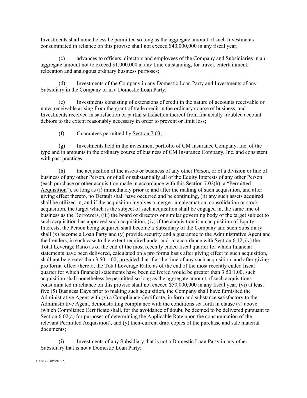 Investments shall nonetheless be permitted so long as the aggregate amount of such Investments consummated in reliance on this proviso shall not exceed $40,000,000 in any fiscal year; (c) advances to officers, directors and employees of the Company and Subsidiaries in an aggregate amount not to exceed $1,000,000 at any time outstanding, for travel, entertainment, relocation and analogous ordinary business purposes; (d) Investments of the Company in any Domestic Loan Party and Investments of any Subsidiary in the Company or in a Domestic Loan Party; (e) Investments consisting of extensions of credit in the nature of accounts receivable or notes receivable arising from the grant of trade credit in the ordinary course of business, and Investments received in satisfaction or partial satisfaction thereof from financially troubled account debtors to the extent reasonably necessary in order to prevent or limit loss; (f) Guarantees permitted by Section 7.03; (g) Investments held in the investment portfolio of CM Insurance Company, Inc. of the type and in amounts in the ordinary course of business of CM Insurance Company, Inc. and consistent with past practices; (h) the acquisition of the assets or business of any other Person, or of a division or line of business of any other Person, or of all or substantially all of the Equity Interests of any other Person (each purchase or other acquisition made in accordance with this Section 7.02(h), a “Permitted Acquisition”), so long as (i) immediately prior to and after the making of such acquisition, and after giving effect thereto, no Default shall have occurred and be continuing, (ii) any such assets acquired shall be utilized in, and if the acquisition involves a merger, amalgamation, consolidation or stock acquisition, the target which is the subject of such acquisition shall be engaged in, the same line of business as the Borrowers, (iii) the board of directors or similar governing body of the target subject to such acquisition has approved such acquisition, (iv) if the acquisition is an acquisition of Equity Interests, the Person being acquired shall become a Subsidiary of the Company and such Subsidiary shall (x) become a Loan Party and (y) provide security and a guarantee to the Administrative Agent and the Lenders, in each case to the extent required under and in accordance with Section 6.12, (v) the Total Leverage Ratio as of the end of the most recently ended fiscal quarter for which financial statements have been delivered, calculated on a pro forma basis after giving effect to such acquisition, shall not be greater than 3.50:1.00; provided that if at the time of any such acquisition, and after giving pro forma effect thereto, the Total Leverage Ratio as of the end of the most recently ended fiscal quarter for which financial statements have been delivered would be greater than 3.50:1.00, such acquisition shall nonetheless be permitted so long as the aggregate amount of such acquisitions consummated in reliance on this proviso shall not exceed $50,000,000 in any fiscal year, (vi) at least five (5) Business Days prior to making such acquisition, the Company shall have furnished the Administrative Agent with (x) a Compliance Certificate, in form and substance satisfactory to the Administrative Agent, demonstrating compliance with the conditions set forth in clause (v) above (which Compliance Certificate shall, for the avoidance of doubt, be deemed to be delivered pursuant to Section 6.02(a) for purposes of determining the Applicable Rate upon the consummation of the relevant Permitted Acquisition), and (y) then-current draft copies of the purchase and sale material documents; (i) Investments of any Subsidiary that is not a Domestic Loan Party in any other Subsidiary that is not a Domestic Loan Party; EAST\203059916.2
