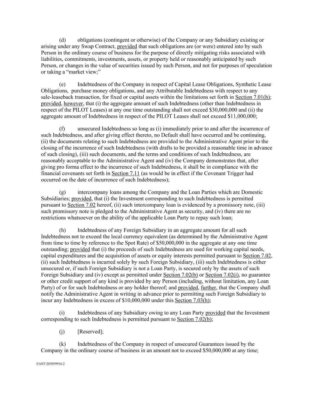 (d) obligations (contingent or otherwise) of the Company or any Subsidiary existing or arising under any Swap Contract, provided that such obligations are (or were) entered into by such Person in the ordinary course of business for the purpose of directly mitigating risks associated with liabilities, commitments, investments, assets, or property held or reasonably anticipated by such Person, or changes in the value of securities issued by such Person, and not for purposes of speculation or taking a “market view;” (e) Indebtedness of the Company in respect of Capital Lease Obligations, Synthetic Lease Obligations, purchase money obligations, and any Attributable Indebtedness with respect to any sale-leaseback transaction, for fixed or capital assets within the limitations set forth in Section 7.01(h); provided, however, that (i) the aggregate amount of such Indebtedness (other than Indebtedness in respect of the PILOT Leases) at any one time outstanding shall not exceed $30,000,000 and (ii) the aggregate amount of Indebtedness in respect of the PILOT Leases shall not exceed $11,000,000; (f) unsecured Indebtedness so long as (i) immediately prior to and after the incurrence of such Indebtedness, and after giving effect thereto, no Default shall have occurred and be continuing, (ii) the documents relating to such Indebtedness are provided to the Administrative Agent prior to the closing of the incurrence of such Indebtedness (with drafts to be provided a reasonable time in advance of such closing), (iii) such documents, and the terms and conditions of such Indebtedness, are reasonably acceptable to the Administrative Agent and (iv) the Company demonstrates that, after giving pro forma effect to the incurrence of such Indebtedness, it shall be in compliance with the financial covenants set forth in Section 7.11 (as would be in effect if the Covenant Trigger had occurred on the date of incurrence of such Indebtedness); (g) intercompany loans among the Company and the Loan Parties which are Domestic Subsidiaries; provided, that (i) the Investment corresponding to such Indebtedness is permitted pursuant to Section 7.02 hereof, (ii) such intercompany loan is evidenced by a promissory note, (iii) such promissory note is pledged to the Administrative Agent as security, and (iv) there are no restrictions whatsoever on the ability of the applicable Loan Party to repay such loan; (h) Indebtedness of any Foreign Subsidiary in an aggregate amount for all such Indebtedness not to exceed the local currency equivalent (as determined by the Administrative Agent from time to time by reference to the Spot Rate) of $50,000,000 in the aggregate at any one time outstanding; provided that (i) the proceeds of such Indebtedness are used for working capital needs, capital expenditures and the acquisition of assets or equity interests permitted pursuant to Section 7.02, (ii) such Indebtedness is incurred solely by such Foreign Subsidiary, (iii) such Indebtedness is either unsecured or, if such Foreign Subsidiary is not a Loan Party, is secured only by the assets of such Foreign Subsidiary and (iv) except as permitted under Section 7.02(b) or Section 7.02(i), no guarantee or other credit support of any kind is provided by any Person (including, without limitation, any Loan Party) of or for such Indebtedness or any holder thereof; and provided, further, that the Company shall notify the Administrative Agent in writing in advance prior to permitting such Foreign Subsidiary to incur any Indebtedness in excess of $10,000,000 under this Section 7.03(h); (i) Indebtedness of any Subsidiary owing to any Loan Party provided that the Investment corresponding to such Indebtedness is permitted pursuant to Section 7.02(b); (j) [Reserved]; (k) Indebtedness of the Company in respect of unsecured Guarantees issued by the Company in the ordinary course of business in an amount not to exceed $50,000,000 at any time; EAST\203059916.2