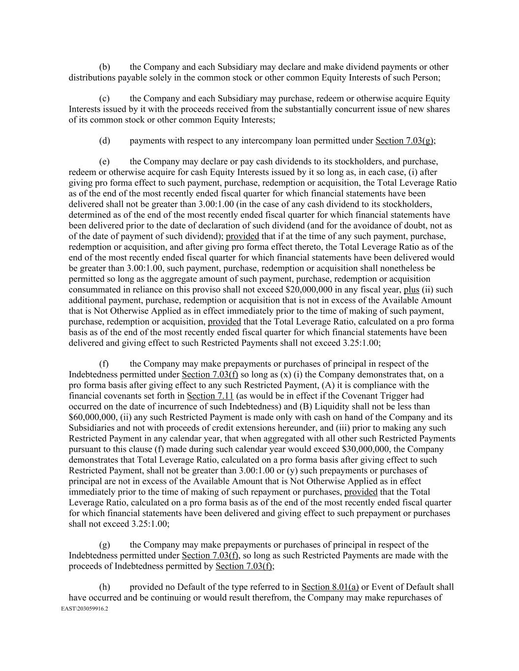 (b) the Company and each Subsidiary may declare and make dividend payments or other distributions payable solely in the common stock or other common Equity Interests of such Person; (c) the Company and each Subsidiary may purchase, redeem or otherwise acquire Equity Interests issued by it with the proceeds received from the substantially concurrent issue of new shares of its common stock or other common Equity Interests; (d) payments with respect to any intercompany loan permitted under Section 7.03(g); (e) the Company may declare or pay cash dividends to its stockholders, and purchase, redeem or otherwise acquire for cash Equity Interests issued by it so long as, in each case, (i) after giving pro forma effect to such payment, purchase, redemption or acquisition, the Total Leverage Ratio as of the end of the most recently ended fiscal quarter for which financial statements have been delivered shall not be greater than 3.00:1.00 (in the case of any cash dividend to its stockholders, determined as of the end of the most recently ended fiscal quarter for which financial statements have been delivered prior to the date of declaration of such dividend (and for the avoidance of doubt, not as of the date of payment of such dividend); provided that if at the time of any such payment, purchase, redemption or acquisition, and after giving pro forma effect thereto, the Total Leverage Ratio as of the end of the most recently ended fiscal quarter for which financial statements have been delivered would be greater than 3.00:1.00, such payment, purchase, redemption or acquisition shall nonetheless be permitted so long as the aggregate amount of such payment, purchase, redemption or acquisition consummated in reliance on this proviso shall not exceed $20,000,000 in any fiscal year, plus (ii) such additional payment, purchase, redemption or acquisition that is not in excess of the Available Amount that is Not Otherwise Applied as in effect immediately prior to the time of making of such payment, purchase, redemption or acquisition, provided that the Total Leverage Ratio, calculated on a pro forma basis as of the end of the most recently ended fiscal quarter for which financial statements have been delivered and giving effect to such Restricted Payments shall not exceed 3.25:1.00; (f) the Company may make prepayments or purchases of principal in respect of the Indebtedness permitted under Section 7.03(f) so long as (x) (i) the Company demonstrates that, on a pro forma basis after giving effect to any such Restricted Payment, (A) it is compliance with the financial covenants set forth in Section 7.11 (as would be in effect if the Covenant Trigger had occurred on the date of incurrence of such Indebtedness) and (B) Liquidity shall not be less than $60,000,000, (ii) any such Restricted Payment is made only with cash on hand of the Company and its Subsidiaries and not with proceeds of credit extensions hereunder, and (iii) prior to making any such Restricted Payment in any calendar year, that when aggregated with all other such Restricted Payments pursuant to this clause (f) made during such calendar year would exceed $30,000,000, the Company demonstrates that Total Leverage Ratio, calculated on a pro forma basis after giving effect to such Restricted Payment, shall not be greater than 3.00:1.00 or (y) such prepayments or purchases of principal are not in excess of the Available Amount that is Not Otherwise Applied as in effect immediately prior to the time of making of such repayment or purchases, provided that the Total Leverage Ratio, calculated on a pro forma basis as of the end of the most recently ended fiscal quarter for which financial statements have been delivered and giving effect to such prepayment or purchases shall not exceed 3.25:1.00; (g) the Company may make prepayments or purchases of principal in respect of the Indebtedness permitted under Section 7.03(f), so long as such Restricted Payments are made with the proceeds of Indebtedness permitted by Section 7.03(f); (h) provided no Default of the type referred to in Section 8.01(a) or Event of Default shall have occurred and be continuing or would result therefrom, the Company may make repurchases of EAST\203059916.2