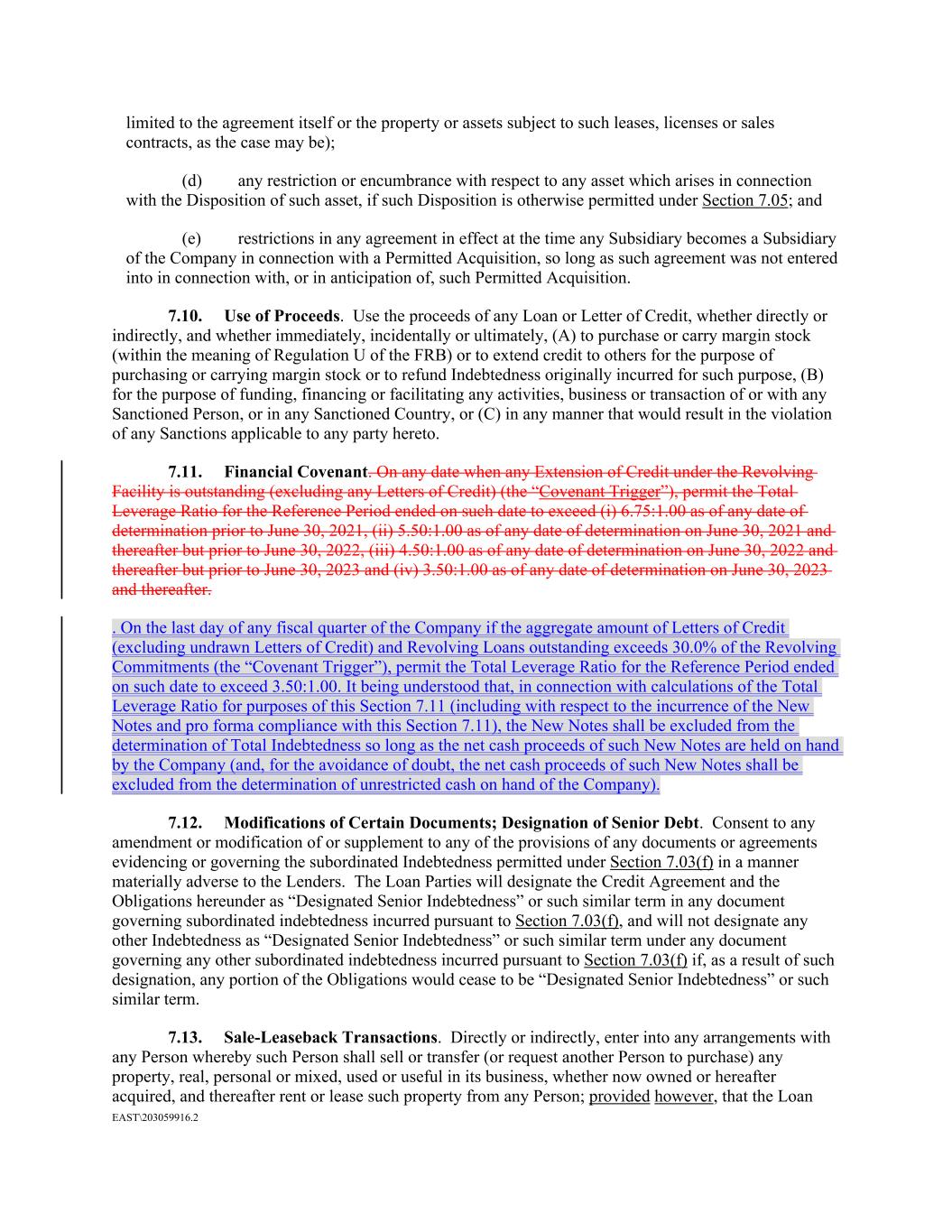 limited to the agreement itself or the property or assets subject to such leases, licenses or sales contracts, as the case may be); (d) any restriction or encumbrance with respect to any asset which arises in connection with the Disposition of such asset, if such Disposition is otherwise permitted under Section 7.05; and (e) restrictions in any agreement in effect at the time any Subsidiary becomes a Subsidiary of the Company in connection with a Permitted Acquisition, so long as such agreement was not entered into in connection with, or in anticipation of, such Permitted Acquisition. 7.10. Use of Proceeds. Use the proceeds of any Loan or Letter of Credit, whether directly or indirectly, and whether immediately, incidentally or ultimately, (A) to purchase or carry margin stock (within the meaning of Regulation U of the FRB) or to extend credit to others for the purpose of purchasing or carrying margin stock or to refund Indebtedness originally incurred for such purpose, (B) for the purpose of funding, financing or facilitating any activities, business or transaction of or with any Sanctioned Person, or in any Sanctioned Country, or (C) in any manner that would result in the violation of any Sanctions applicable to any party hereto. 7.11. Financial Covenant. On any date when any Extension of Credit under the Revolving Facility is outstanding (excluding any Letters of Credit) (the “Covenant Trigger”), permit the Total Leverage Ratio for the Reference Period ended on such date to exceed (i) 6.75:1.00 as of any date of determination prior to June 30, 2021, (ii) 5.50:1.00 as of any date of determination on June 30, 2021 and thereafter but prior to June 30, 2022, (iii) 4.50:1.00 as of any date of determination on June 30, 2022 and thereafter but prior to June 30, 2023 and (iv) 3.50:1.00 as of any date of determination on June 30, 2023 and thereafter. . On the last day of any fiscal quarter of the Company if the aggregate amount of Letters of Credit (excluding undrawn Letters of Credit) and Revolving Loans outstanding exceeds 30.0% of the Revolving Commitments (the “Covenant Trigger”), permit the Total Leverage Ratio for the Reference Period ended on such date to exceed 3.50:1.00. It being understood that, in connection with calculations of the Total Leverage Ratio for purposes of this Section 7.11 (including with respect to the incurrence of the New Notes and pro forma compliance with this Section 7.11), the New Notes shall be excluded from the determination of Total Indebtedness so long as the net cash proceeds of such New Notes are held on hand by the Company (and, for the avoidance of doubt, the net cash proceeds of such New Notes shall be excluded from the determination of unrestricted cash on hand of the Company). 7.12. Modifications of Certain Documents; Designation of Senior Debt. Consent to any amendment or modification of or supplement to any of the provisions of any documents or agreements evidencing or governing the subordinated Indebtedness permitted under Section 7.03(f) in a manner materially adverse to the Lenders. The Loan Parties will designate the Credit Agreement and the Obligations hereunder as “Designated Senior Indebtedness” or such similar term in any document governing subordinated indebtedness incurred pursuant to Section 7.03(f), and will not designate any other Indebtedness as “Designated Senior Indebtedness” or such similar term under any document governing any other subordinated indebtedness incurred pursuant to Section 7.03(f) if, as a result of such designation, any portion of the Obligations would cease to be “Designated Senior Indebtedness” or such similar term. 7.13. Sale-Leaseback Transactions. Directly or indirectly, enter into any arrangements with any Person whereby such Person shall sell or transfer (or request another Person to purchase) any property, real, personal or mixed, used or useful in its business, whether now owned or hereafter acquired, and thereafter rent or lease such property from any Person; provided however, that the Loan EAST\203059916.2