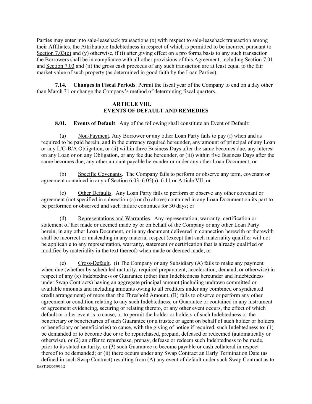 Parties may enter into sale-leaseback transactions (x) with respect to sale-leaseback transaction among their Affiliates, the Attributable Indebtedness in respect of which is permitted to be incurred pursuant to Section 7.03(e) and (y) otherwise, if (i) after giving effect on a pro forma basis to any such transaction the Borrowers shall be in compliance with all other provisions of this Agreement, including Section 7.01 and Section 7.03 and (ii) the gross cash proceeds of any such transaction are at least equal to the fair market value of such property (as determined in good faith by the Loan Parties). 7.14. Changes in Fiscal Periods. Permit the fiscal year of the Company to end on a day other than March 31 or change the Company’s method of determining fiscal quarters. ARTICLE VIII. EVENTS OF DEFAULT AND REMEDIES 8.01. Events of Default. Any of the following shall constitute an Event of Default: (a) Non-Payment. Any Borrower or any other Loan Party fails to pay (i) when and as required to be paid herein, and in the currency required hereunder, any amount of principal of any Loan or any L/C-B/A Obligation, or (ii) within three Business Days after the same becomes due, any interest on any Loan or on any Obligation, or any fee due hereunder, or (iii) within five Business Days after the same becomes due, any other amount payable hereunder or under any other Loan Document; or (b) Specific Covenants. The Company fails to perform or observe any term, covenant or agreement contained in any of Section 6.03, 6.05(a), 6.11 or Article VII; or (c) Other Defaults. Any Loan Party fails to perform or observe any other covenant or agreement (not specified in subsection (a) or (b) above) contained in any Loan Document on its part to be performed or observed and such failure continues for 30 days; or (d) Representations and Warranties. Any representation, warranty, certification or statement of fact made or deemed made by or on behalf of the Company or any other Loan Party herein, in any other Loan Document, or in any document delivered in connection herewith or therewith shall be incorrect or misleading in any material respect (except that such materiality qualifier will not be applicable to any representation, warranty, statement or certification that is already qualified or modified by materiality in the text thereof) when made or deemed made; or (e) Cross-Default. (i) The Company or any Subsidiary (A) fails to make any payment when due (whether by scheduled maturity, required prepayment, acceleration, demand, or otherwise) in respect of any (x) Indebtedness or Guarantee (other than Indebtedness hereunder and Indebtedness under Swap Contracts) having an aggregate principal amount (including undrawn committed or available amounts and including amounts owing to all creditors under any combined or syndicated credit arrangement) of more than the Threshold Amount, (B) fails to observe or perform any other agreement or condition relating to any such Indebtedness, or Guarantee or contained in any instrument or agreement evidencing, securing or relating thereto, or any other event occurs, the effect of which default or other event is to cause, or to permit the holder or holders of such Indebtedness or the beneficiary or beneficiaries of such Guarantee (or a trustee or agent on behalf of such holder or holders or beneficiary or beneficiaries) to cause, with the giving of notice if required, such Indebtedness to: (1) be demanded or to become due or to be repurchased, prepaid, defeased or redeemed (automatically or otherwise), or (2) an offer to repurchase, prepay, defease or redeem such Indebtedness to be made, prior to its stated maturity, or (3) such Guarantee to become payable or cash collateral in respect thereof to be demanded; or (ii) there occurs under any Swap Contract an Early Termination Date (as defined in such Swap Contract) resulting from (A) any event of default under such Swap Contract as to EAST\203059916.2