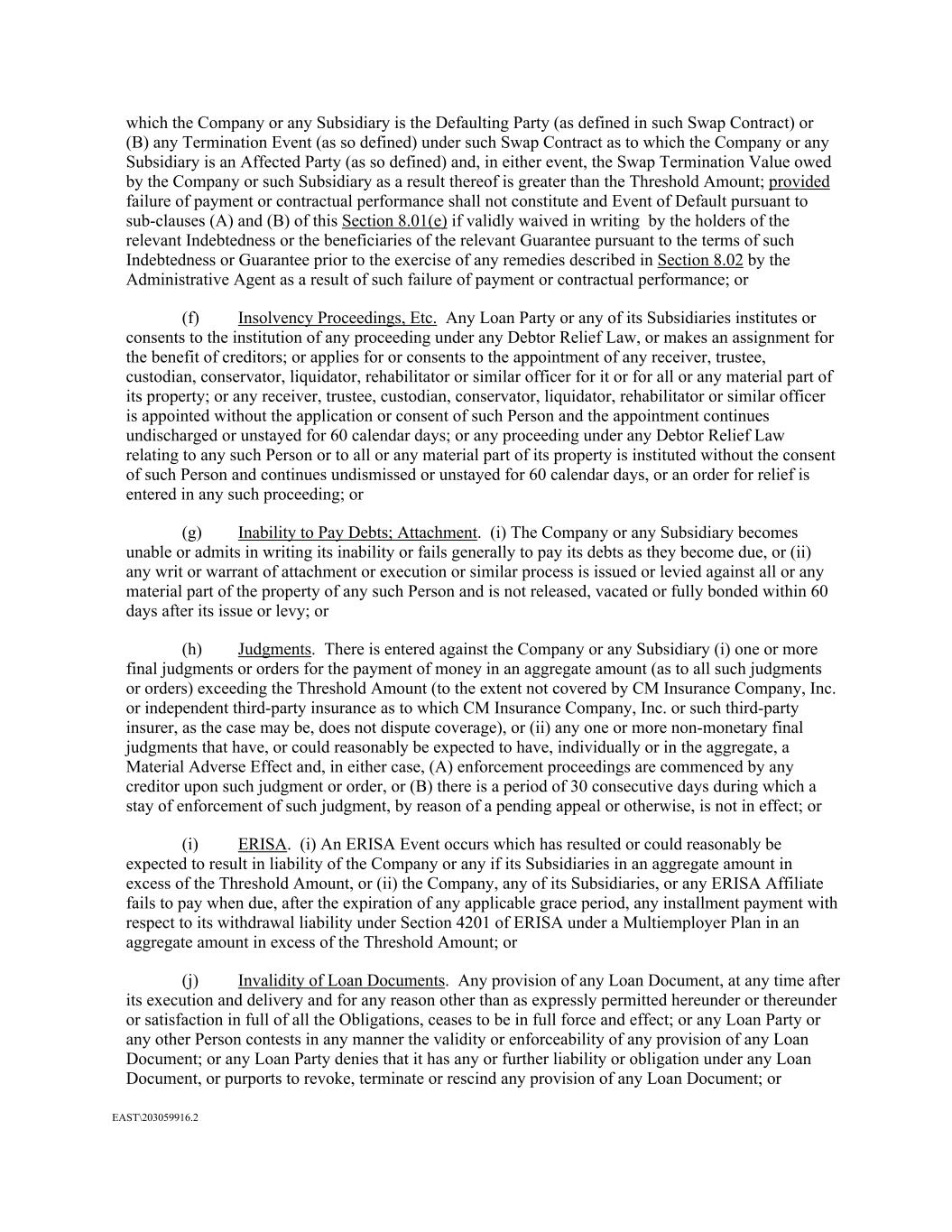 which the Company or any Subsidiary is the Defaulting Party (as defined in such Swap Contract) or (B) any Termination Event (as so defined) under such Swap Contract as to which the Company or any Subsidiary is an Affected Party (as so defined) and, in either event, the Swap Termination Value owed by the Company or such Subsidiary as a result thereof is greater than the Threshold Amount; provided failure of payment or contractual performance shall not constitute and Event of Default pursuant to sub-clauses (A) and (B) of this Section 8.01(e) if validly waived in writing by the holders of the relevant Indebtedness or the beneficiaries of the relevant Guarantee pursuant to the terms of such Indebtedness or Guarantee prior to the exercise of any remedies described in Section 8.02 by the Administrative Agent as a result of such failure of payment or contractual performance; or (f) Insolvency Proceedings, Etc. Any Loan Party or any of its Subsidiaries institutes or consents to the institution of any proceeding under any Debtor Relief Law, or makes an assignment for the benefit of creditors; or applies for or consents to the appointment of any receiver, trustee, custodian, conservator, liquidator, rehabilitator or similar officer for it or for all or any material part of its property; or any receiver, trustee, custodian, conservator, liquidator, rehabilitator or similar officer is appointed without the application or consent of such Person and the appointment continues undischarged or unstayed for 60 calendar days; or any proceeding under any Debtor Relief Law relating to any such Person or to all or any material part of its property is instituted without the consent of such Person and continues undismissed or unstayed for 60 calendar days, or an order for relief is entered in any such proceeding; or (g) Inability to Pay Debts; Attachment. (i) The Company or any Subsidiary becomes unable or admits in writing its inability or fails generally to pay its debts as they become due, or (ii) any writ or warrant of attachment or execution or similar process is issued or levied against all or any material part of the property of any such Person and is not released, vacated or fully bonded within 60 days after its issue or levy; or (h) Judgments. There is entered against the Company or any Subsidiary (i) one or more final judgments or orders for the payment of money in an aggregate amount (as to all such judgments or orders) exceeding the Threshold Amount (to the extent not covered by CM Insurance Company, Inc. or independent third-party insurance as to which CM Insurance Company, Inc. or such third-party insurer, as the case may be, does not dispute coverage), or (ii) any one or more non-monetary final judgments that have, or could reasonably be expected to have, individually or in the aggregate, a Material Adverse Effect and, in either case, (A) enforcement proceedings are commenced by any creditor upon such judgment or order, or (B) there is a period of 30 consecutive days during which a stay of enforcement of such judgment, by reason of a pending appeal or otherwise, is not in effect; or (i) ERISA. (i) An ERISA Event occurs which has resulted or could reasonably be expected to result in liability of the Company or any if its Subsidiaries in an aggregate amount in excess of the Threshold Amount, or (ii) the Company, any of its Subsidiaries, or any ERISA Affiliate fails to pay when due, after the expiration of any applicable grace period, any installment payment with respect to its withdrawal liability under Section 4201 of ERISA under a Multiemployer Plan in an aggregate amount in excess of the Threshold Amount; or (j) Invalidity of Loan Documents. Any provision of any Loan Document, at any time after its execution and delivery and for any reason other than as expressly permitted hereunder or thereunder or satisfaction in full of all the Obligations, ceases to be in full force and effect; or any Loan Party or any other Person contests in any manner the validity or enforceability of any provision of any Loan Document; or any Loan Party denies that it has any or further liability or obligation under any Loan Document, or purports to revoke, terminate or rescind any provision of any Loan Document; or EAST\203059916.2