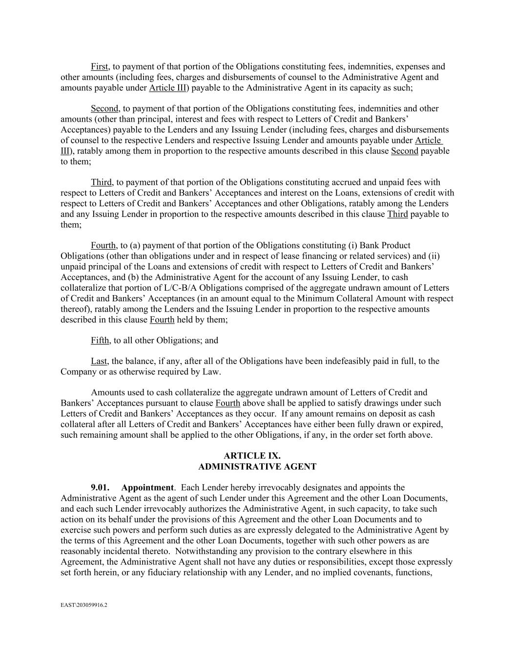 First, to payment of that portion of the Obligations constituting fees, indemnities, expenses and other amounts (including fees, charges and disbursements of counsel to the Administrative Agent and amounts payable under Article III) payable to the Administrative Agent in its capacity as such; Second, to payment of that portion of the Obligations constituting fees, indemnities and other amounts (other than principal, interest and fees with respect to Letters of Credit and Bankers’ Acceptances) payable to the Lenders and any Issuing Lender (including fees, charges and disbursements of counsel to the respective Lenders and respective Issuing Lender and amounts payable under Article III), ratably among them in proportion to the respective amounts described in this clause Second payable to them; Third, to payment of that portion of the Obligations constituting accrued and unpaid fees with respect to Letters of Credit and Bankers’ Acceptances and interest on the Loans, extensions of credit with respect to Letters of Credit and Bankers’ Acceptances and other Obligations, ratably among the Lenders and any Issuing Lender in proportion to the respective amounts described in this clause Third payable to them; Fourth, to (a) payment of that portion of the Obligations constituting (i) Bank Product Obligations (other than obligations under and in respect of lease financing or related services) and (ii) unpaid principal of the Loans and extensions of credit with respect to Letters of Credit and Bankers’ Acceptances, and (b) the Administrative Agent for the account of any Issuing Lender, to cash collateralize that portion of L/C-B/A Obligations comprised of the aggregate undrawn amount of Letters of Credit and Bankers’ Acceptances (in an amount equal to the Minimum Collateral Amount with respect thereof), ratably among the Lenders and the Issuing Lender in proportion to the respective amounts described in this clause Fourth held by them; Fifth, to all other Obligations; and Last, the balance, if any, after all of the Obligations have been indefeasibly paid in full, to the Company or as otherwise required by Law. Amounts used to cash collateralize the aggregate undrawn amount of Letters of Credit and Bankers’ Acceptances pursuant to clause Fourth above shall be applied to satisfy drawings under such Letters of Credit and Bankers’ Acceptances as they occur. If any amount remains on deposit as cash collateral after all Letters of Credit and Bankers’ Acceptances have either been fully drawn or expired, such remaining amount shall be applied to the other Obligations, if any, in the order set forth above. ARTICLE IX. ADMINISTRATIVE AGENT 9.01. Appointment. Each Lender hereby irrevocably designates and appoints the Administrative Agent as the agent of such Lender under this Agreement and the other Loan Documents, and each such Lender irrevocably authorizes the Administrative Agent, in such capacity, to take such action on its behalf under the provisions of this Agreement and the other Loan Documents and to exercise such powers and perform such duties as are expressly delegated to the Administrative Agent by the terms of this Agreement and the other Loan Documents, together with such other powers as are reasonably incidental thereto. Notwithstanding any provision to the contrary elsewhere in this Agreement, the Administrative Agent shall not have any duties or responsibilities, except those expressly set forth herein, or any fiduciary relationship with any Lender, and no implied covenants, functions, EAST\203059916.2