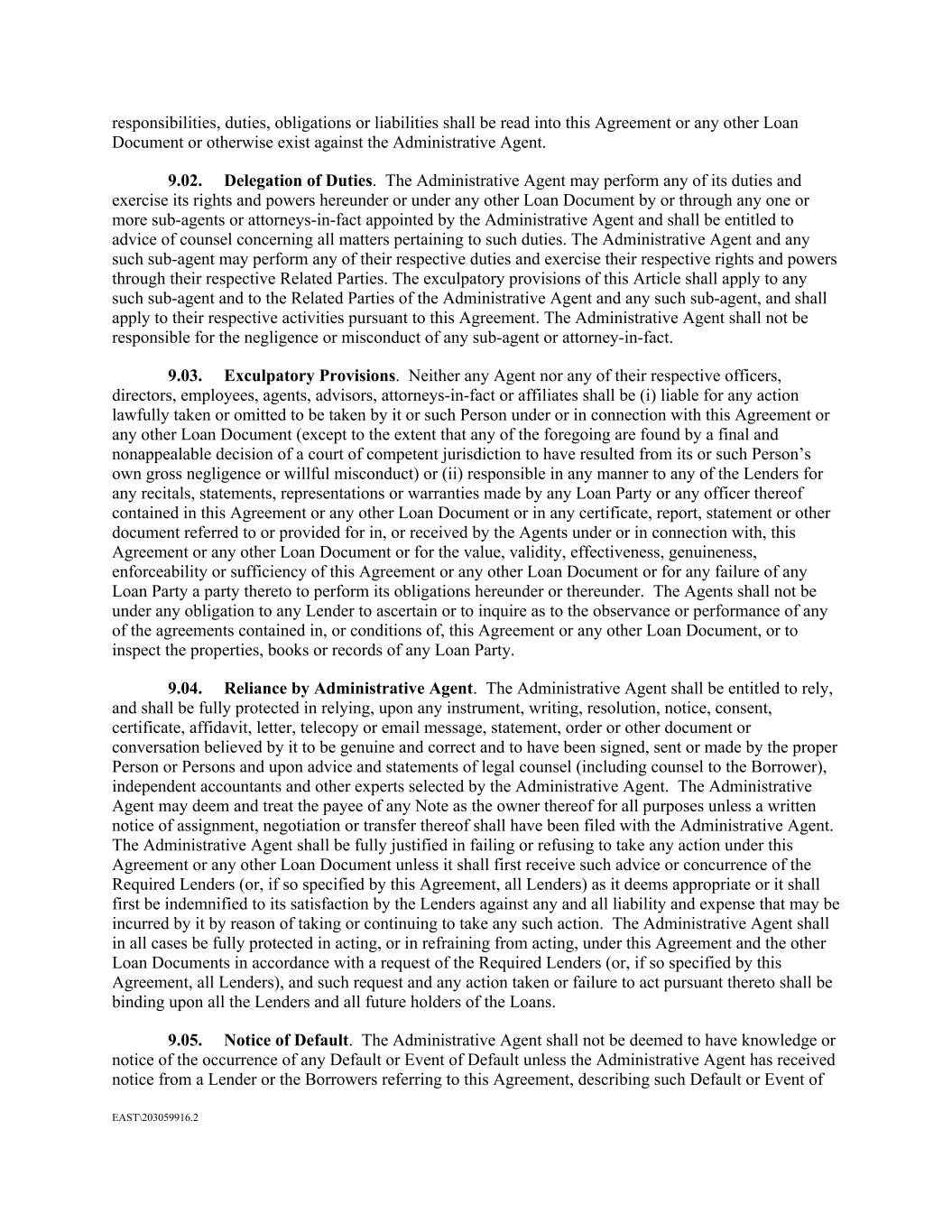 responsibilities, duties, obligations or liabilities shall be read into this Agreement or any other Loan Document or otherwise exist against the Administrative Agent. 9.02. Delegation of Duties. The Administrative Agent may perform any of its duties and exercise its rights and powers hereunder or under any other Loan Document by or through any one or more sub-agents or attorneys-in-fact appointed by the Administrative Agent and shall be entitled to advice of counsel concerning all matters pertaining to such duties. The Administrative Agent and any such sub-agent may perform any of their respective duties and exercise their respective rights and powers through their respective Related Parties. The exculpatory provisions of this Article shall apply to any such sub-agent and to the Related Parties of the Administrative Agent and any such sub-agent, and shall apply to their respective activities pursuant to this Agreement. The Administrative Agent shall not be responsible for the negligence or misconduct of any sub-agent or attorney-in-fact. 9.03. Exculpatory Provisions. Neither any Agent nor any of their respective officers, directors, employees, agents, advisors, attorneys-in-fact or affiliates shall be (i) liable for any action lawfully taken or omitted to be taken by it or such Person under or in connection with this Agreement or any other Loan Document (except to the extent that any of the foregoing are found by a final and nonappealable decision of a court of competent jurisdiction to have resulted from its or such Person’s own gross negligence or willful misconduct) or (ii) responsible in any manner to any of the Lenders for any recitals, statements, representations or warranties made by any Loan Party or any officer thereof contained in this Agreement or any other Loan Document or in any certificate, report, statement or other document referred to or provided for in, or received by the Agents under or in connection with, this Agreement or any other Loan Document or for the value, validity, effectiveness, genuineness, enforceability or sufficiency of this Agreement or any other Loan Document or for any failure of any Loan Party a party thereto to perform its obligations hereunder or thereunder. The Agents shall not be under any obligation to any Lender to ascertain or to inquire as to the observance or performance of any of the agreements contained in, or conditions of, this Agreement or any other Loan Document, or to inspect the properties, books or records of any Loan Party. 9.04. Reliance by Administrative Agent. The Administrative Agent shall be entitled to rely, and shall be fully protected in relying, upon any instrument, writing, resolution, notice, consent, certificate, affidavit, letter, telecopy or email message, statement, order or other document or conversation believed by it to be genuine and correct and to have been signed, sent or made by the proper Person or Persons and upon advice and statements of legal counsel (including counsel to the Borrower), independent accountants and other experts selected by the Administrative Agent. The Administrative Agent may deem and treat the payee of any Note as the owner thereof for all purposes unless a written notice of assignment, negotiation or transfer thereof shall have been filed with the Administrative Agent. The Administrative Agent shall be fully justified in failing or refusing to take any action under this Agreement or any other Loan Document unless it shall first receive such advice or concurrence of the Required Lenders (or, if so specified by this Agreement, all Lenders) as it deems appropriate or it shall first be indemnified to its satisfaction by the Lenders against any and all liability and expense that may be incurred by it by reason of taking or continuing to take any such action. The Administrative Agent shall in all cases be fully protected in acting, or in refraining from acting, under this Agreement and the other Loan Documents in accordance with a request of the Required Lenders (or, if so specified by this Agreement, all Lenders), and such request and any action taken or failure to act pursuant thereto shall be binding upon all the Lenders and all future holders of the Loans. 9.05. Notice of Default. The Administrative Agent shall not be deemed to have knowledge or notice of the occurrence of any Default or Event of Default unless the Administrative Agent has received notice from a Lender or the Borrowers referring to this Agreement, describing such Default or Event of EAST\203059916.2