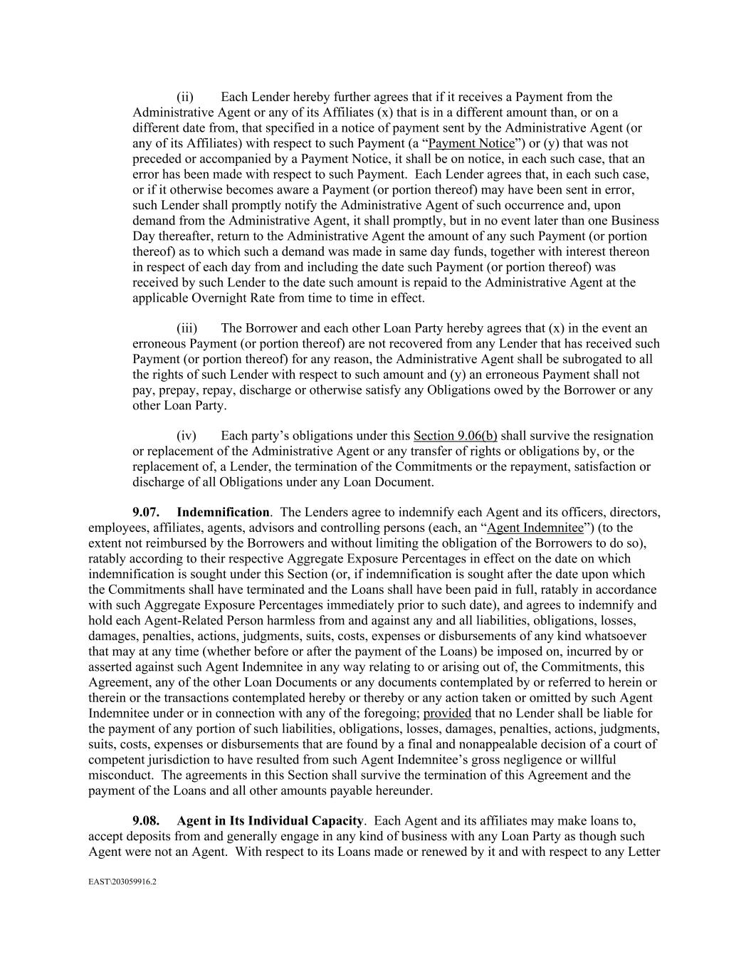 (ii) Each Lender hereby further agrees that if it receives a Payment from the Administrative Agent or any of its Affiliates (x) that is in a different amount than, or on a different date from, that specified in a notice of payment sent by the Administrative Agent (or any of its Affiliates) with respect to such Payment (a “Payment Notice”) or (y) that was not preceded or accompanied by a Payment Notice, it shall be on notice, in each such case, that an error has been made with respect to such Payment. Each Lender agrees that, in each such case, or if it otherwise becomes aware a Payment (or portion thereof) may have been sent in error, such Lender shall promptly notify the Administrative Agent of such occurrence and, upon demand from the Administrative Agent, it shall promptly, but in no event later than one Business Day thereafter, return to the Administrative Agent the amount of any such Payment (or portion thereof) as to which such a demand was made in same day funds, together with interest thereon in respect of each day from and including the date such Payment (or portion thereof) was received by such Lender to the date such amount is repaid to the Administrative Agent at the applicable Overnight Rate from time to time in effect. (iii) The Borrower and each other Loan Party hereby agrees that (x) in the event an erroneous Payment (or portion thereof) are not recovered from any Lender that has received such Payment (or portion thereof) for any reason, the Administrative Agent shall be subrogated to all the rights of such Lender with respect to such amount and (y) an erroneous Payment shall not pay, prepay, repay, discharge or otherwise satisfy any Obligations owed by the Borrower or any other Loan Party. (iv) Each party’s obligations under this Section 9.06(b) shall survive the resignation or replacement of the Administrative Agent or any transfer of rights or obligations by, or the replacement of, a Lender, the termination of the Commitments or the repayment, satisfaction or discharge of all Obligations under any Loan Document. 9.07. Indemnification. The Lenders agree to indemnify each Agent and its officers, directors, employees, affiliates, agents, advisors and controlling persons (each, an “Agent Indemnitee”) (to the extent not reimbursed by the Borrowers and without limiting the obligation of the Borrowers to do so), ratably according to their respective Aggregate Exposure Percentages in effect on the date on which indemnification is sought under this Section (or, if indemnification is sought after the date upon which the Commitments shall have terminated and the Loans shall have been paid in full, ratably in accordance with such Aggregate Exposure Percentages immediately prior to such date), and agrees to indemnify and hold each Agent-Related Person harmless from and against any and all liabilities, obligations, losses, damages, penalties, actions, judgments, suits, costs, expenses or disbursements of any kind whatsoever that may at any time (whether before or after the payment of the Loans) be imposed on, incurred by or asserted against such Agent Indemnitee in any way relating to or arising out of, the Commitments, this Agreement, any of the other Loan Documents or any documents contemplated by or referred to herein or therein or the transactions contemplated hereby or thereby or any action taken or omitted by such Agent Indemnitee under or in connection with any of the foregoing; provided that no Lender shall be liable for the payment of any portion of such liabilities, obligations, losses, damages, penalties, actions, judgments, suits, costs, expenses or disbursements that are found by a final and nonappealable decision of a court of competent jurisdiction to have resulted from such Agent Indemnitee’s gross negligence or willful misconduct. The agreements in this Section shall survive the termination of this Agreement and the payment of the Loans and all other amounts payable hereunder. 9.08. Agent in Its Individual Capacity. Each Agent and its affiliates may make loans to, accept deposits from and generally engage in any kind of business with any Loan Party as though such Agent were not an Agent. With respect to its Loans made or renewed by it and with respect to any Letter EAST\203059916.2