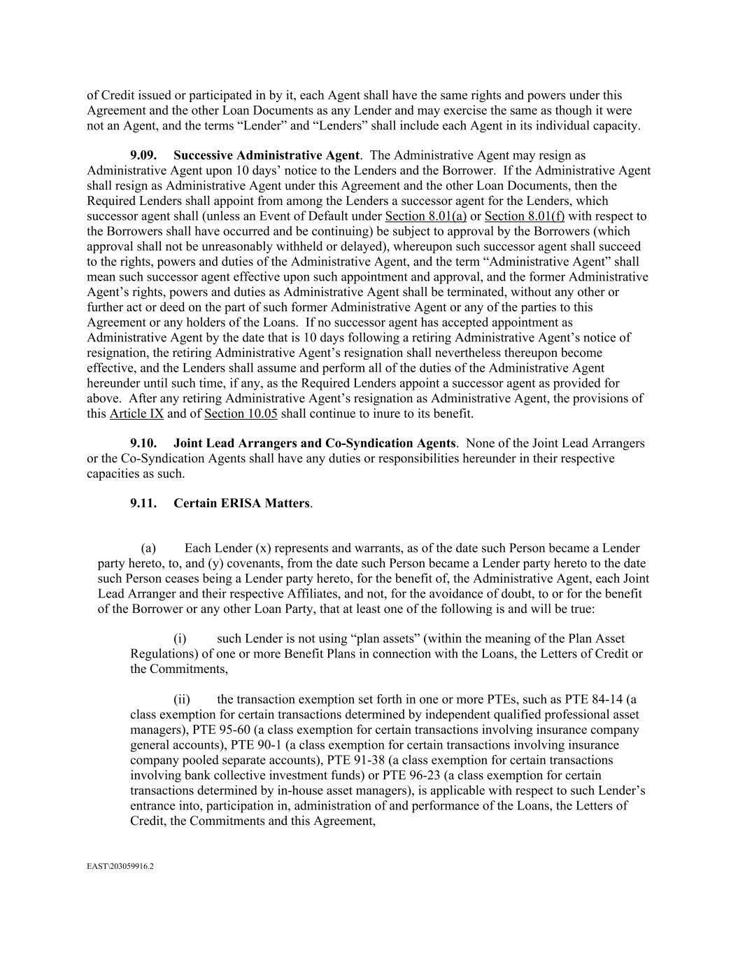 of Credit issued or participated in by it, each Agent shall have the same rights and powers under this Agreement and the other Loan Documents as any Lender and may exercise the same as though it were not an Agent, and the terms “Lender” and “Lenders” shall include each Agent in its individual capacity. 9.09. Successive Administrative Agent. The Administrative Agent may resign as Administrative Agent upon 10 days’ notice to the Lenders and the Borrower. If the Administrative Agent shall resign as Administrative Agent under this Agreement and the other Loan Documents, then the Required Lenders shall appoint from among the Lenders a successor agent for the Lenders, which successor agent shall (unless an Event of Default under Section 8.01(a) or Section 8.01(f) with respect to the Borrowers shall have occurred and be continuing) be subject to approval by the Borrowers (which approval shall not be unreasonably withheld or delayed), whereupon such successor agent shall succeed to the rights, powers and duties of the Administrative Agent, and the term “Administrative Agent” shall mean such successor agent effective upon such appointment and approval, and the former Administrative Agent’s rights, powers and duties as Administrative Agent shall be terminated, without any other or further act or deed on the part of such former Administrative Agent or any of the parties to this Agreement or any holders of the Loans. If no successor agent has accepted appointment as Administrative Agent by the date that is 10 days following a retiring Administrative Agent’s notice of resignation, the retiring Administrative Agent’s resignation shall nevertheless thereupon become effective, and the Lenders shall assume and perform all of the duties of the Administrative Agent hereunder until such time, if any, as the Required Lenders appoint a successor agent as provided for above. After any retiring Administrative Agent’s resignation as Administrative Agent, the provisions of this Article IX and of Section 10.05 shall continue to inure to its benefit. 9.10. Joint Lead Arrangers and Co-Syndication Agents. None of the Joint Lead Arrangers or the Co-Syndication Agents shall have any duties or responsibilities hereunder in their respective capacities as such. 9.11. Certain ERISA Matters. (a) Each Lender (x) represents and warrants, as of the date such Person became a Lender party hereto, to, and (y) covenants, from the date such Person became a Lender party hereto to the date such Person ceases being a Lender party hereto, for the benefit of, the Administrative Agent, each Joint Lead Arranger and their respective Affiliates, and not, for the avoidance of doubt, to or for the benefit of the Borrower or any other Loan Party, that at least one of the following is and will be true: (i) such Lender is not using “plan assets” (within the meaning of the Plan Asset Regulations) of one or more Benefit Plans in connection with the Loans, the Letters of Credit or the Commitments, (ii) the transaction exemption set forth in one or more PTEs, such as PTE 84-14 (a class exemption for certain transactions determined by independent qualified professional asset managers), PTE 95-60 (a class exemption for certain transactions involving insurance company general accounts), PTE 90-1 (a class exemption for certain transactions involving insurance company pooled separate accounts), PTE 91-38 (a class exemption for certain transactions involving bank collective investment funds) or PTE 96-23 (a class exemption for certain transactions determined by in-house asset managers), is applicable with respect to such Lender’s entrance into, participation in, administration of and performance of the Loans, the Letters of Credit, the Commitments and this Agreement, EAST\203059916.2