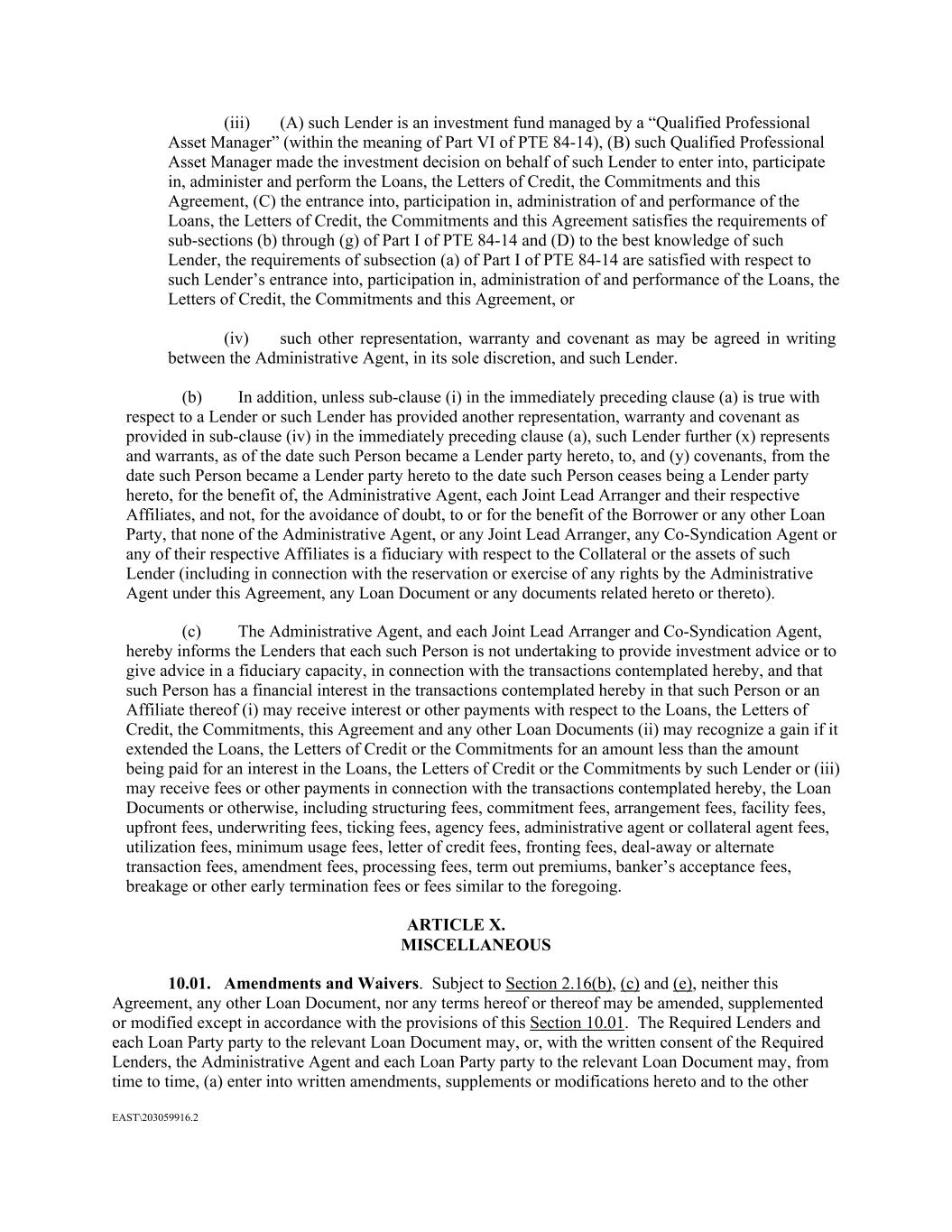 (iii) (A) such Lender is an investment fund managed by a “Qualified Professional Asset Manager” (within the meaning of Part VI of PTE 84-14), (B) such Qualified Professional Asset Manager made the investment decision on behalf of such Lender to enter into, participate in, administer and perform the Loans, the Letters of Credit, the Commitments and this Agreement, (C) the entrance into, participation in, administration of and performance of the Loans, the Letters of Credit, the Commitments and this Agreement satisfies the requirements of sub-sections (b) through (g) of Part I of PTE 84-14 and (D) to the best knowledge of such Lender, the requirements of subsection (a) of Part I of PTE 84-14 are satisfied with respect to such Lender’s entrance into, participation in, administration of and performance of the Loans, the Letters of Credit, the Commitments and this Agreement, or (iv) such other representation, warranty and covenant as may be agreed in writing between the Administrative Agent, in its sole discretion, and such Lender. (b) In addition, unless sub-clause (i) in the immediately preceding clause (a) is true with respect to a Lender or such Lender has provided another representation, warranty and covenant as provided in sub-clause (iv) in the immediately preceding clause (a), such Lender further (x) represents and warrants, as of the date such Person became a Lender party hereto, to, and (y) covenants, from the date such Person became a Lender party hereto to the date such Person ceases being a Lender party hereto, for the benefit of, the Administrative Agent, each Joint Lead Arranger and their respective Affiliates, and not, for the avoidance of doubt, to or for the benefit of the Borrower or any other Loan Party, that none of the Administrative Agent, or any Joint Lead Arranger, any Co-Syndication Agent or any of their respective Affiliates is a fiduciary with respect to the Collateral or the assets of such Lender (including in connection with the reservation or exercise of any rights by the Administrative Agent under this Agreement, any Loan Document or any documents related hereto or thereto). (c) The Administrative Agent, and each Joint Lead Arranger and Co-Syndication Agent, hereby informs the Lenders that each such Person is not undertaking to provide investment advice or to give advice in a fiduciary capacity, in connection with the transactions contemplated hereby, and that such Person has a financial interest in the transactions contemplated hereby in that such Person or an Affiliate thereof (i) may receive interest or other payments with respect to the Loans, the Letters of Credit, the Commitments, this Agreement and any other Loan Documents (ii) may recognize a gain if it extended the Loans, the Letters of Credit or the Commitments for an amount less than the amount being paid for an interest in the Loans, the Letters of Credit or the Commitments by such Lender or (iii) may receive fees or other payments in connection with the transactions contemplated hereby, the Loan Documents or otherwise, including structuring fees, commitment fees, arrangement fees, facility fees, upfront fees, underwriting fees, ticking fees, agency fees, administrative agent or collateral agent fees, utilization fees, minimum usage fees, letter of credit fees, fronting fees, deal-away or alternate transaction fees, amendment fees, processing fees, term out premiums, banker’s acceptance fees, breakage or other early termination fees or fees similar to the foregoing. ARTICLE X. MISCELLANEOUS 10.01. Amendments and Waivers. Subject to Section 2.16(b), (c) and (e), neither this Agreement, any other Loan Document, nor any terms hereof or thereof may be amended, supplemented or modified except in accordance with the provisions of this Section 10.01. The Required Lenders and each Loan Party party to the relevant Loan Document may, or, with the written consent of the Required Lenders, the Administrative Agent and each Loan Party party to the relevant Loan Document may, from time to time, (a) enter into written amendments, supplements or modifications hereto and to the other EAST\203059916.2