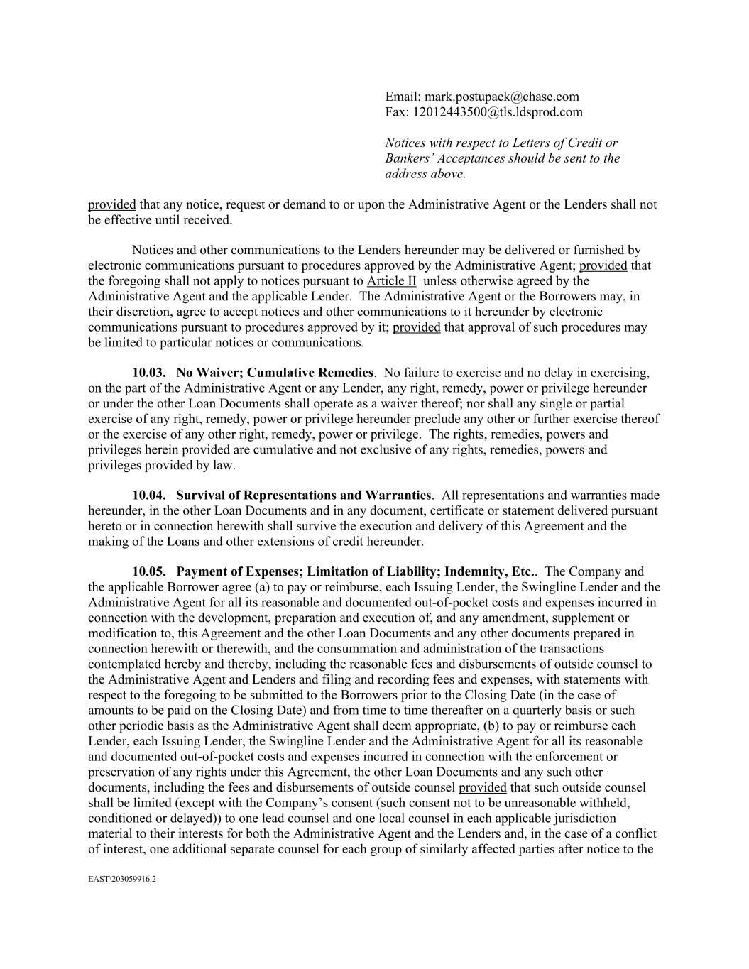 EAST\203059916.2 Notices with respect to Letters of Credit or Bankers’ Acceptances should be sent to the address above. provided that any notice, request or demand to or upon the Administrative Agent or the Lenders shall not be effective until received. Notices and other communications to the Lenders hereunder may be delivered or furnished by electronic communications pursuant to procedures approved by the Administrative Agent; provided that the foregoing shall not apply to notices pursuant to Article II unless otherwise agreed by the Administrative Agent and the applicable Lender. The Administrative Agent or the Borrowers may, in their discretion, agree to accept notices and other communications to it hereunder by electronic communications pursuant to procedures approved by it; provided that approval of such procedures may be limited to particular notices or communications. 10.03. No Waiver; Cumulative Remedies. No failure to exercise and no delay in exercising, on the part of the Administrative Agent or any Lender, any right, remedy, power or privilege hereunder or under the other Loan Documents shall operate as a waiver thereof; nor shall any single or partial exercise of any right, remedy, power or privilege hereunder preclude any other or further exercise thereof or the exercise of any other right, remedy, power or privilege. The rights, remedies, powers and privileges herein provided are cumulative and not exclusive of any rights, remedies, powers and privileges provided by law. 10.04. Survival of Representations and Warranties. All representations and warranties made hereunder, in the other Loan Documents and in any document, certificate or statement delivered pursuant hereto or in connection herewith shall survive the execution and delivery of this Agreement and the making of the Loans and other extensions of credit hereunder. 10.05. Payment of Expenses; Limitation of Liability; Indemnity, Etc.. The Company and the applicable Borrower agree (a) to pay or reimburse, each Issuing Lender, the Swingline Lender and the Administrative Agent for all its reasonable and documented out-of-pocket costs and expenses incurred in connection with the development, preparation and execution of, and any amendment, supplement or modification to, this Agreement and the other Loan Documents and any other documents prepared in connection herewith or therewith, and the consummation and administration of the transactions contemplated hereby and thereby, including the reasonable fees and disbursements of outside counsel to the Administrative Agent and Lenders and filing and recording fees and expenses, with statements with respect to the foregoing to be submitted to the Borrowers prior to the Closing Date (in the case of amounts to be paid on the Closing Date) and from time to time thereafter on a quarterly basis or such other periodic basis as the Administrative Agent shall deem appropriate, (b) to pay or reimburse each Lender, each Issuing Lender, the Swingline Lender and the Administrative Agent for all its reasonable and documented out-of-pocket costs and expenses incurred in connection with the enforcement or preservation of any rights under this Agreement, the other Loan Documents and any such other documents, including the fees and disbursements of outside counsel provided that such outside counsel shall be limited (except with the Company’s consent (such consent not to be unreasonable withheld, conditioned or delayed)) to one lead counsel and one local counsel in each applicable jurisdiction material to their interests for both the Administrative Agent and the Lenders and, in the case of a conflict of interest, one additional separate counsel for each group of similarly affected parties after notice to the Email: mark.postupack@chase.com Fax: 12012443500@tls.ldsprod.com