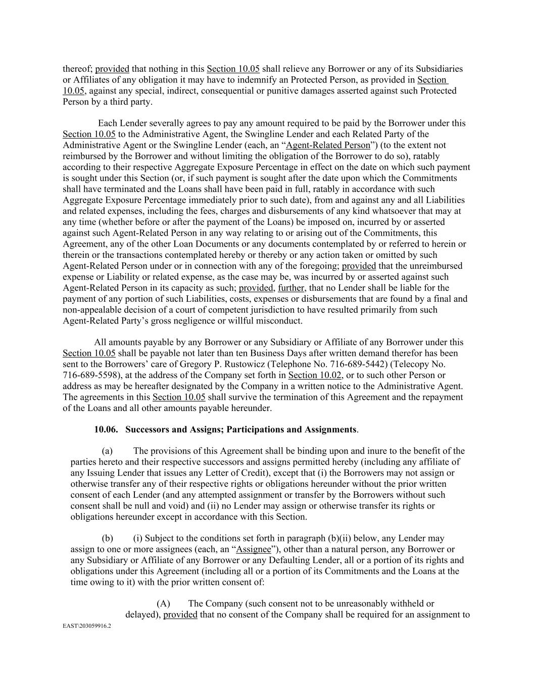 thereof; provided that nothing in this Section 10.05 shall relieve any Borrower or any of its Subsidiaries or Affiliates of any obligation it may have to indemnify an Protected Person, as provided in Section 10.05, against any special, indirect, consequential or punitive damages asserted against such Protected Person by a third party. Each Lender severally agrees to pay any amount required to be paid by the Borrower under this Section 10.05 to the Administrative Agent, the Swingline Lender and each Related Party of the Administrative Agent or the Swingline Lender (each, an “Agent-Related Person”) (to the extent not reimbursed by the Borrower and without limiting the obligation of the Borrower to do so), ratably according to their respective Aggregate Exposure Percentage in effect on the date on which such payment is sought under this Section (or, if such payment is sought after the date upon which the Commitments shall have terminated and the Loans shall have been paid in full, ratably in accordance with such Aggregate Exposure Percentage immediately prior to such date), from and against any and all Liabilities and related expenses, including the fees, charges and disbursements of any kind whatsoever that may at any time (whether before or after the payment of the Loans) be imposed on, incurred by or asserted against such Agent-Related Person in any way relating to or arising out of the Commitments, this Agreement, any of the other Loan Documents or any documents contemplated by or referred to herein or therein or the transactions contemplated hereby or thereby or any action taken or omitted by such Agent-Related Person under or in connection with any of the foregoing; provided that the unreimbursed expense or Liability or related expense, as the case may be, was incurred by or asserted against such Agent-Related Person in its capacity as such; provided, further, that no Lender shall be liable for the payment of any portion of such Liabilities, costs, expenses or disbursements that are found by a final and non-appealable decision of a court of competent jurisdiction to have resulted primarily from such Agent-Related Party’s gross negligence or willful misconduct. All amounts payable by any Borrower or any Subsidiary or Affiliate of any Borrower under this Section 10.05 shall be payable not later than ten Business Days after written demand therefor has been sent to the Borrowers’ care of Gregory P. Rustowicz (Telephone No. 716-689-5442) (Telecopy No. 716-689-5598), at the address of the Company set forth in Section 10.02, or to such other Person or address as may be hereafter designated by the Company in a written notice to the Administrative Agent. The agreements in this Section 10.05 shall survive the termination of this Agreement and the repayment of the Loans and all other amounts payable hereunder. 10.06. Successors and Assigns; Participations and Assignments. (a) The provisions of this Agreement shall be binding upon and inure to the benefit of the parties hereto and their respective successors and assigns permitted hereby (including any affiliate of any Issuing Lender that issues any Letter of Credit), except that (i) the Borrowers may not assign or otherwise transfer any of their respective rights or obligations hereunder without the prior written consent of each Lender (and any attempted assignment or transfer by the Borrowers without such consent shall be null and void) and (ii) no Lender may assign or otherwise transfer its rights or obligations hereunder except in accordance with this Section. (b) (i) Subject to the conditions set forth in paragraph (b)(ii) below, any Lender may assign to one or more assignees (each, an “Assignee”), other than a natural person, any Borrower or any Subsidiary or Affiliate of any Borrower or any Defaulting Lender, all or a portion of its rights and obligations under this Agreement (including all or a portion of its Commitments and the Loans at the time owing to it) with the prior written consent of: (A) The Company (such consent not to be unreasonably withheld or delayed), provided that no consent of the Company shall be required for an assignment to EAST\203059916.2
