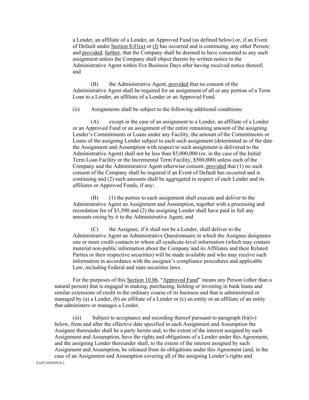 a Lender, an affiliate of a Lender, an Approved Fund (as defined below) or, if an Event of Default under Section 8.01(a) or (f) has occurred and is continuing, any other Person; and provided, further, that the Company shall be deemed to have consented to any such assignment unless the Company shall object thereto by written notice to the Administrative Agent within five Business Days after having received notice thereof; and (B) the Administrative Agent, provided that no consent of the Administrative Agent shall be required for an assignment of all or any portion of a Term Loan to a Lender, an affiliate of a Lender or an Approved Fund. (ii) Assignments shall be subject to the following additional conditions: (A) except in the case of an assignment to a Lender, an affiliate of a Lender or an Approved Fund or an assignment of the entire remaining amount of the assigning Lender’s Commitments or Loans under any Facility, the amount of the Commitments or Loans of the assigning Lender subject to each such assignment (determined as of the date the Assignment and Assumption with respect to such assignment is delivered to the Administrative Agent) shall not be less than $5,000,000 (or, in the case of the Initial Term Loan Facility or the Incremental Term Facility, $500,000) unless each of the Company and the Administrative Agent otherwise consent, provided that (1) no such consent of the Company shall be required if an Event of Default has occurred and is continuing and (2) such amounts shall be aggregated in respect of each Lender and its affiliates or Approved Funds, if any; (B) (1) the parties to each assignment shall execute and deliver to the Administrative Agent an Assignment and Assumption, together with a processing and recordation fee of $3,500 and (2) the assigning Lender shall have paid in full any amounts owing by it to the Administrative Agent; and (C) the Assignee, if it shall not be a Lender, shall deliver to the Administrative Agent an Administrative Questionnaire in which the Assignee designates one or more credit contacts to whom all syndicate-level information (which may contain material non-public information about the Company and its Affiliates and their Related Parties or their respective securities) will be made available and who may receive such information in accordance with the assignee’s compliance procedures and applicable Law, including Federal and state securities laws. For the purposes of this Section 10.06, “Approved Fund” means any Person (other than a natural person) that is engaged in making, purchasing, holding or investing in bank loans and similar extensions of credit in the ordinary course of its business and that is administered or managed by (a) a Lender, (b) an affiliate of a Lender or (c) an entity or an affiliate of an entity that administers or manages a Lender. (iii) Subject to acceptance and recording thereof pursuant to paragraph (b)(iv) below, from and after the effective date specified in each Assignment and Assumption the Assignee thereunder shall be a party hereto and, to the extent of the interest assigned by such Assignment and Assumption, have the rights and obligations of a Lender under this Agreement, and the assigning Lender thereunder shall, to the extent of the interest assigned by such Assignment and Assumption, be released from its obligations under this Agreement (and, in the case of an Assignment and Assumption covering all of the assigning Lender’s rights and EAST\203059916.2