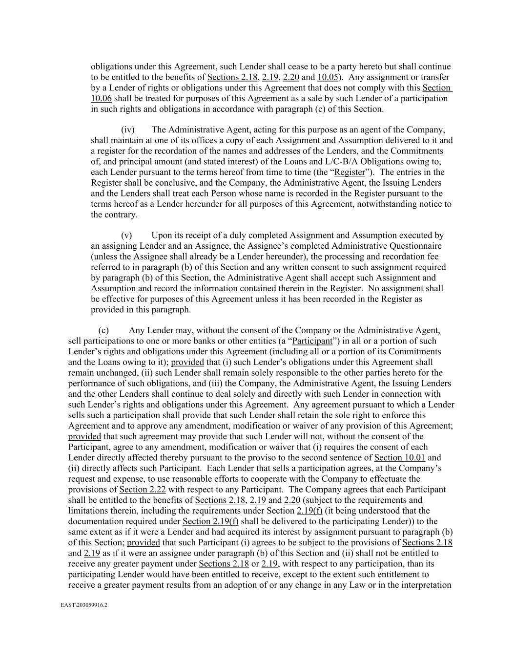 obligations under this Agreement, such Lender shall cease to be a party hereto but shall continue to be entitled to the benefits of Sections 2.18, 2.19, 2.20 and 10.05). Any assignment or transfer by a Lender of rights or obligations under this Agreement that does not comply with this Section 10.06 shall be treated for purposes of this Agreement as a sale by such Lender of a participation in such rights and obligations in accordance with paragraph (c) of this Section. (iv) The Administrative Agent, acting for this purpose as an agent of the Company, shall maintain at one of its offices a copy of each Assignment and Assumption delivered to it and a register for the recordation of the names and addresses of the Lenders, and the Commitments of, and principal amount (and stated interest) of the Loans and L/C-B/A Obligations owing to, each Lender pursuant to the terms hereof from time to time (the “Register”). The entries in the Register shall be conclusive, and the Company, the Administrative Agent, the Issuing Lenders and the Lenders shall treat each Person whose name is recorded in the Register pursuant to the terms hereof as a Lender hereunder for all purposes of this Agreement, notwithstanding notice to the contrary. (v) Upon its receipt of a duly completed Assignment and Assumption executed by an assigning Lender and an Assignee, the Assignee’s completed Administrative Questionnaire (unless the Assignee shall already be a Lender hereunder), the processing and recordation fee referred to in paragraph (b) of this Section and any written consent to such assignment required by paragraph (b) of this Section, the Administrative Agent shall accept such Assignment and Assumption and record the information contained therein in the Register. No assignment shall be effective for purposes of this Agreement unless it has been recorded in the Register as provided in this paragraph. (c) Any Lender may, without the consent of the Company or the Administrative Agent, sell participations to one or more banks or other entities (a “Participant”) in all or a portion of such Lender’s rights and obligations under this Agreement (including all or a portion of its Commitments and the Loans owing to it); provided that (i) such Lender’s obligations under this Agreement shall remain unchanged, (ii) such Lender shall remain solely responsible to the other parties hereto for the performance of such obligations, and (iii) the Company, the Administrative Agent, the Issuing Lenders and the other Lenders shall continue to deal solely and directly with such Lender in connection with such Lender’s rights and obligations under this Agreement. Any agreement pursuant to which a Lender sells such a participation shall provide that such Lender shall retain the sole right to enforce this Agreement and to approve any amendment, modification or waiver of any provision of this Agreement; provided that such agreement may provide that such Lender will not, without the consent of the Participant, agree to any amendment, modification or waiver that (i) requires the consent of each Lender directly affected thereby pursuant to the proviso to the second sentence of Section 10.01 and (ii) directly affects such Participant. Each Lender that sells a participation agrees, at the Company’s request and expense, to use reasonable efforts to cooperate with the Company to effectuate the provisions of Section 2.22 with respect to any Participant. The Company agrees that each Participant shall be entitled to the benefits of Sections 2.18, 2.19 and 2.20 (subject to the requirements and limitations therein, including the requirements under Section 2.19(f) (it being understood that the documentation required under Section 2.19(f) shall be delivered to the participating Lender)) to the same extent as if it were a Lender and had acquired its interest by assignment pursuant to paragraph (b) of this Section; provided that such Participant (i) agrees to be subject to the provisions of Sections 2.18 and 2.19 as if it were an assignee under paragraph (b) of this Section and (ii) shall not be entitled to receive any greater payment under Sections 2.18 or 2.19, with respect to any participation, than its participating Lender would have been entitled to receive, except to the extent such entitlement to receive a greater payment results from an adoption of or any change in any Law or in the interpretation EAST\203059916.2