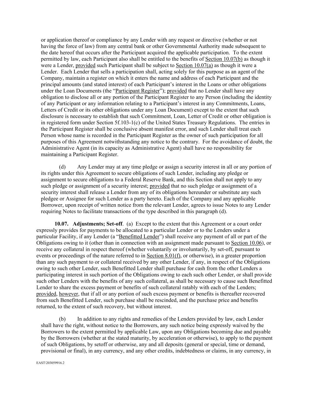 or application thereof or compliance by any Lender with any request or directive (whether or not having the force of law) from any central bank or other Governmental Authority made subsequent to the date hereof that occurs after the Participant acquired the applicable participation. To the extent permitted by law, each Participant also shall be entitled to the benefits of Section 10.07(b) as though it were a Lender, provided such Participant shall be subject to Section 10.07(a) as though it were a Lender. Each Lender that sells a participation shall, acting solely for this purpose as an agent of the Company, maintain a register on which it enters the name and address of each Participant and the principal amounts (and stated interest) of each Participant’s interest in the Loans or other obligations under the Loan Documents (the “Participant Register”); provided that no Lender shall have any obligation to disclose all or any portion of the Participant Register to any Person (including the identity of any Participant or any information relating to a Participant’s interest in any Commitments, Loans, Letters of Credit or its other obligations under any Loan Document) except to the extent that such disclosure is necessary to establish that such Commitment, Loan, Letter of Credit or other obligation is in registered form under Section 5f.103-1(c) of the United States Treasury Regulations. The entries in the Participant Register shall be conclusive absent manifest error, and such Lender shall treat each Person whose name is recorded in the Participant Register as the owner of such participation for all purposes of this Agreement notwithstanding any notice to the contrary. For the avoidance of doubt, the Administrative Agent (in its capacity as Administrative Agent) shall have no responsibility for maintaining a Participant Register. (d) Any Lender may at any time pledge or assign a security interest in all or any portion of its rights under this Agreement to secure obligations of such Lender, including any pledge or assignment to secure obligations to a Federal Reserve Bank, and this Section shall not apply to any such pledge or assignment of a security interest; provided that no such pledge or assignment of a security interest shall release a Lender from any of its obligations hereunder or substitute any such pledgee or Assignee for such Lender as a party hereto. Each of the Company and any applicable Borrower, upon receipt of written notice from the relevant Lender, agrees to issue Notes to any Lender requiring Notes to facilitate transactions of the type described in this paragraph (d). 10.07. Adjustments; Set-off. (a) Except to the extent that this Agreement or a court order expressly provides for payments to be allocated to a particular Lender or to the Lenders under a particular Facility, if any Lender (a “Benefitted Lender”) shall receive any payment of all or part of the Obligations owing to it (other than in connection with an assignment made pursuant to Section 10.06), or receive any collateral in respect thereof (whether voluntarily or involuntarily, by set-off, pursuant to events or proceedings of the nature referred to in Section 8.01(f), or otherwise), in a greater proportion than any such payment to or collateral received by any other Lender, if any, in respect of the Obligations owing to such other Lender, such Benefitted Lender shall purchase for cash from the other Lenders a participating interest in such portion of the Obligations owing to each such other Lender, or shall provide such other Lenders with the benefits of any such collateral, as shall be necessary to cause such Benefitted Lender to share the excess payment or benefits of such collateral ratably with each of the Lenders; provided, however, that if all or any portion of such excess payment or benefits is thereafter recovered from such Benefitted Lender, such purchase shall be rescinded, and the purchase price and benefits returned, to the extent of such recovery, but without interest. (b) In addition to any rights and remedies of the Lenders provided by law, each Lender shall have the right, without notice to the Borrowers, any such notice being expressly waived by the Borrowers to the extent permitted by applicable Law, upon any Obligations becoming due and payable by the Borrowers (whether at the stated maturity, by acceleration or otherwise), to apply to the payment of such Obligations, by setoff or otherwise, any and all deposits (general or special, time or demand, provisional or final), in any currency, and any other credits, indebtedness or claims, in any currency, in EAST\203059916.2