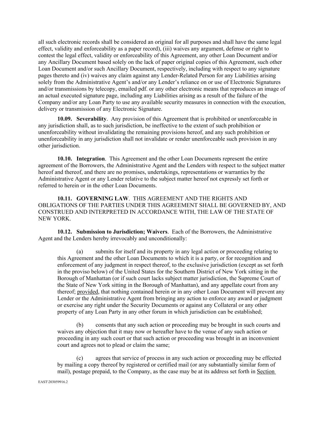 all such electronic records shall be considered an original for all purposes and shall have the same legal effect, validity and enforceability as a paper record), (iii) waives any argument, defense or right to contest the legal effect, validity or enforceability of this Agreement, any other Loan Document and/or any Ancillary Document based solely on the lack of paper original copies of this Agreement, such other Loan Document and/or such Ancillary Document, respectively, including with respect to any signature pages thereto and (iv) waives any claim against any Lender-Related Person for any Liabilities arising solely from the Administrative Agent’s and/or any Lender’s reliance on or use of Electronic Signatures and/or transmissions by telecopy, emailed pdf. or any other electronic means that reproduces an image of an actual executed signature page, including any Liabilities arising as a result of the failure of the Company and/or any Loan Party to use any available security measures in connection with the execution, delivery or transmission of any Electronic Signature. 10.09. Severability. Any provision of this Agreement that is prohibited or unenforceable in any jurisdiction shall, as to such jurisdiction, be ineffective to the extent of such prohibition or unenforceability without invalidating the remaining provisions hereof, and any such prohibition or unenforceability in any jurisdiction shall not invalidate or render unenforceable such provision in any other jurisdiction. 10.10. Integration. This Agreement and the other Loan Documents represent the entire agreement of the Borrowers, the Administrative Agent and the Lenders with respect to the subject matter hereof and thereof, and there are no promises, undertakings, representations or warranties by the Administrative Agent or any Lender relative to the subject matter hereof not expressly set forth or referred to herein or in the other Loan Documents. 10.11. GOVERNING LAW. THIS AGREEMENT AND THE RIGHTS AND OBLIGATIONS OF THE PARTIES UNDER THIS AGREEMENT SHALL BE GOVERNED BY, AND CONSTRUED AND INTERPRETED IN ACCORDANCE WITH, THE LAW OF THE STATE OF NEW YORK. 10.12. Submission to Jurisdiction; Waivers. Each of the Borrowers, the Administrative Agent and the Lenders hereby irrevocably and unconditionally: (a) submits for itself and its property in any legal action or proceeding relating to this Agreement and the other Loan Documents to which it is a party, or for recognition and enforcement of any judgment in respect thereof, to the exclusive jurisdiction (except as set forth in the proviso below) of the United States for the Southern District of New York sitting in the Borough of Manhattan (or if such court lacks subject matter jurisdiction, the Supreme Court of the State of New York sitting in the Borough of Manhattan), and any appellate court from any thereof; provided, that nothing contained herein or in any other Loan Document will prevent any Lender or the Administrative Agent from bringing any action to enforce any award or judgment or exercise any right under the Security Documents or against any Collateral or any other property of any Loan Party in any other forum in which jurisdiction can be established; (b) consents that any such action or proceeding may be brought in such courts and waives any objection that it may now or hereafter have to the venue of any such action or proceeding in any such court or that such action or proceeding was brought in an inconvenient court and agrees not to plead or claim the same; (c) agrees that service of process in any such action or proceeding may be effected by mailing a copy thereof by registered or certified mail (or any substantially similar form of mail), postage prepaid, to the Company, as the case may be at its address set forth in Section EAST\203059916.2