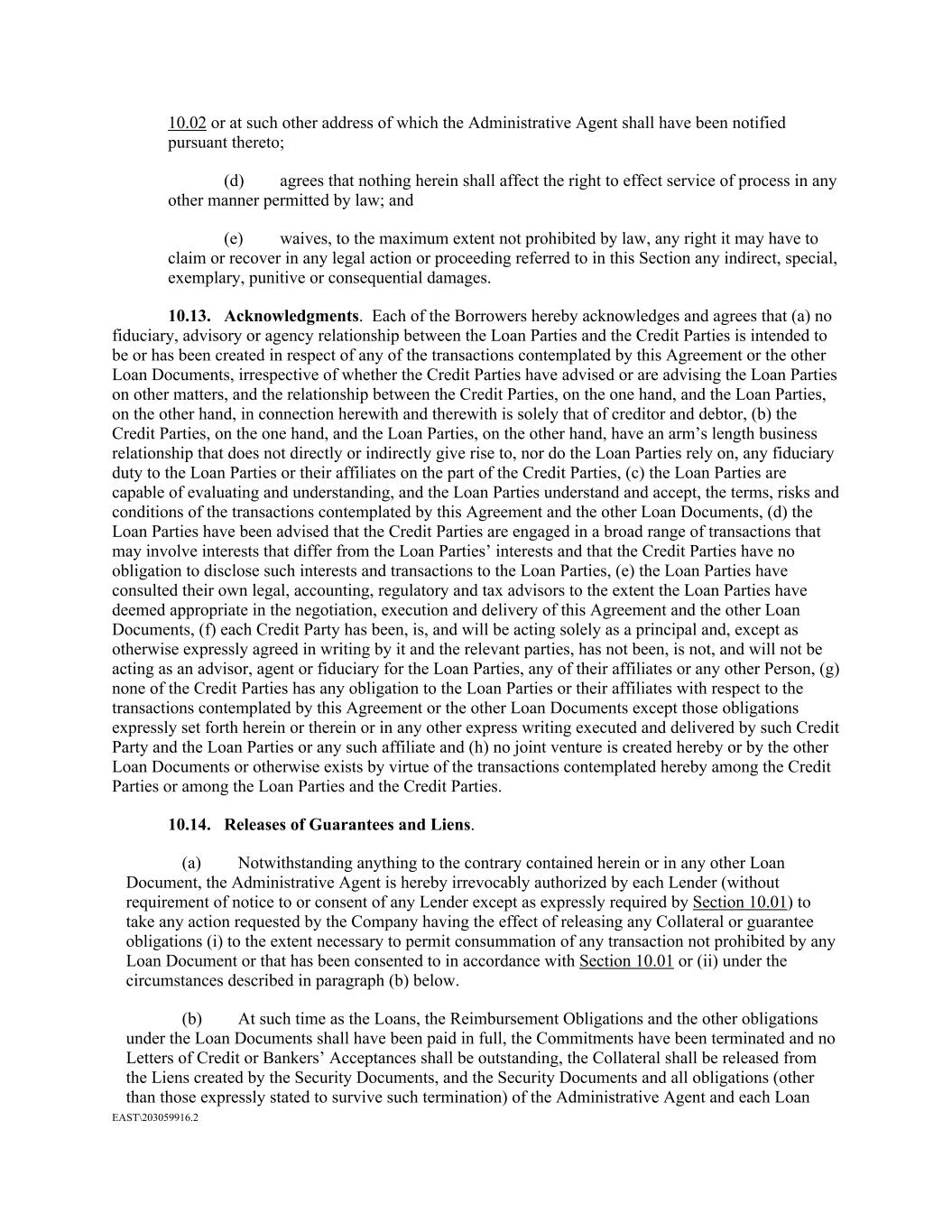 10.02 or at such other address of which the Administrative Agent shall have been notified pursuant thereto; (d) agrees that nothing herein shall affect the right to effect service of process in any other manner permitted by law; and (e) waives, to the maximum extent not prohibited by law, any right it may have to claim or recover in any legal action or proceeding referred to in this Section any indirect, special, exemplary, punitive or consequential damages. 10.13. Acknowledgments. Each of the Borrowers hereby acknowledges and agrees that (a) no fiduciary, advisory or agency relationship between the Loan Parties and the Credit Parties is intended to be or has been created in respect of any of the transactions contemplated by this Agreement or the other Loan Documents, irrespective of whether the Credit Parties have advised or are advising the Loan Parties on other matters, and the relationship between the Credit Parties, on the one hand, and the Loan Parties, on the other hand, in connection herewith and therewith is solely that of creditor and debtor, (b) the Credit Parties, on the one hand, and the Loan Parties, on the other hand, have an arm’s length business relationship that does not directly or indirectly give rise to, nor do the Loan Parties rely on, any fiduciary duty to the Loan Parties or their affiliates on the part of the Credit Parties, (c) the Loan Parties are capable of evaluating and understanding, and the Loan Parties understand and accept, the terms, risks and conditions of the transactions contemplated by this Agreement and the other Loan Documents, (d) the Loan Parties have been advised that the Credit Parties are engaged in a broad range of transactions that may involve interests that differ from the Loan Parties’ interests and that the Credit Parties have no obligation to disclose such interests and transactions to the Loan Parties, (e) the Loan Parties have consulted their own legal, accounting, regulatory and tax advisors to the extent the Loan Parties have deemed appropriate in the negotiation, execution and delivery of this Agreement and the other Loan Documents, (f) each Credit Party has been, is, and will be acting solely as a principal and, except as otherwise expressly agreed in writing by it and the relevant parties, has not been, is not, and will not be acting as an advisor, agent or fiduciary for the Loan Parties, any of their affiliates or any other Person, (g) none of the Credit Parties has any obligation to the Loan Parties or their affiliates with respect to the transactions contemplated by this Agreement or the other Loan Documents except those obligations expressly set forth herein or therein or in any other express writing executed and delivered by such Credit Party and the Loan Parties or any such affiliate and (h) no joint venture is created hereby or by the other Loan Documents or otherwise exists by virtue of the transactions contemplated hereby among the Credit Parties or among the Loan Parties and the Credit Parties. 10.14. Releases of Guarantees and Liens. (a) Notwithstanding anything to the contrary contained herein or in any other Loan Document, the Administrative Agent is hereby irrevocably authorized by each Lender (without requirement of notice to or consent of any Lender except as expressly required by Section 10.01) to take any action requested by the Company having the effect of releasing any Collateral or guarantee obligations (i) to the extent necessary to permit consummation of any transaction not prohibited by any Loan Document or that has been consented to in accordance with Section 10.01 or (ii) under the circumstances described in paragraph (b) below. (b) At such time as the Loans, the Reimbursement Obligations and the other obligations under the Loan Documents shall have been paid in full, the Commitments have been terminated and no Letters of Credit or Bankers’ Acceptances shall be outstanding, the Collateral shall be released from the Liens created by the Security Documents, and the Security Documents and all obligations (other than those expressly stated to survive such termination) of the Administrative Agent and each Loan EAST\203059916.2