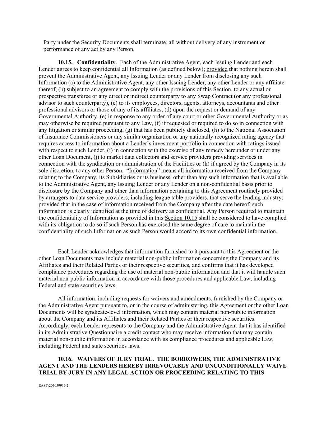 Party under the Security Documents shall terminate, all without delivery of any instrument or performance of any act by any Person. 10.15. Confidentiality. Each of the Administrative Agent, each Issuing Lender and each Lender agrees to keep confidential all Information (as defined below); provided that nothing herein shall prevent the Administrative Agent, any Issuing Lender or any Lender from disclosing any such Information (a) to the Administrative Agent, any other Issuing Lender, any other Lender or any affiliate thereof, (b) subject to an agreement to comply with the provisions of this Section, to any actual or prospective transferee or any direct or indirect counterparty to any Swap Contract (or any professional advisor to such counterparty), (c) to its employees, directors, agents, attorneys, accountants and other professional advisors or those of any of its affiliates, (d) upon the request or demand of any Governmental Authority, (e) in response to any order of any court or other Governmental Authority or as may otherwise be required pursuant to any Law, (f) if requested or required to do so in connection with any litigation or similar proceeding, (g) that has been publicly disclosed, (h) to the National Association of Insurance Commissioners or any similar organization or any nationally recognized rating agency that requires access to information about a Lender’s investment portfolio in connection with ratings issued with respect to such Lender, (i) in connection with the exercise of any remedy hereunder or under any other Loan Document, (j) to market data collectors and service providers providing services in connection with the syndication or administration of the Facilities or (k) if agreed by the Company in its sole discretion, to any other Person. “Information” means all information received from the Company relating to the Company, its Subsidiaries or its business, other than any such information that is available to the Administrative Agent, any Issuing Lender or any Lender on a non-confidential basis prior to disclosure by the Company and other than information pertaining to this Agreement routinely provided by arrangers to data service providers, including league table providers, that serve the lending industry; provided that in the case of information received from the Company after the date hereof, such information is clearly identified at the time of delivery as confidential. Any Person required to maintain the confidentiality of Information as provided in this Section 10.15 shall be considered to have complied with its obligation to do so if such Person has exercised the same degree of care to maintain the confidentiality of such Information as such Person would accord to its own confidential information. Each Lender acknowledges that information furnished to it pursuant to this Agreement or the other Loan Documents may include material non-public information concerning the Company and its Affiliates and their Related Parties or their respective securities, and confirms that it has developed compliance procedures regarding the use of material non-public information and that it will handle such material non-public information in accordance with those procedures and applicable Law, including Federal and state securities laws. All information, including requests for waivers and amendments, furnished by the Company or the Administrative Agent pursuant to, or in the course of administering, this Agreement or the other Loan Documents will be syndicate-level information, which may contain material non-public information about the Company and its Affiliates and their Related Parties or their respective securities. Accordingly, each Lender represents to the Company and the Administrative Agent that it has identified in its Administrative Questionnaire a credit contact who may receive information that may contain material non-public information in accordance with its compliance procedures and applicable Law, including Federal and state securities laws. 10.16. WAIVERS OF JURY TRIAL. THE BORROWERS, THE ADMINISTRATIVE AGENT AND THE LENDERS HEREBY IRREVOCABLY AND UNCONDITIONALLY WAIVE TRIAL BY JURY IN ANY LEGAL ACTION OR PROCEEDING RELATING TO THIS EAST\203059916.2
