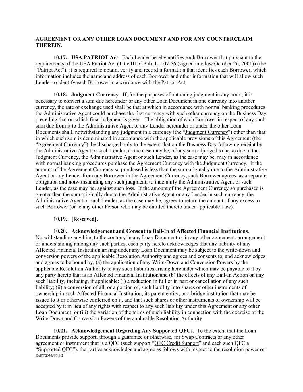 AGREEMENT OR ANY OTHER LOAN DOCUMENT AND FOR ANY COUNTERCLAIM THEREIN. 10.17. USA PATRIOT Act. Each Lender hereby notifies each Borrower that pursuant to the requirements of the USA Patriot Act (Title III of Pub. L. 107-56 (signed into law October 26, 2001)) (the “Patriot Act”), it is required to obtain, verify and record information that identifies each Borrower, which information includes the name and address of each Borrower and other information that will allow such Lender to identify each Borrower in accordance with the Patriot Act. 10.18. Judgment Currency. If, for the purposes of obtaining judgment in any court, it is necessary to convert a sum due hereunder or any other Loan Document in one currency into another currency, the rate of exchange used shall be that at which in accordance with normal banking procedures the Administrative Agent could purchase the first currency with such other currency on the Business Day preceding that on which final judgment is given. The obligation of each Borrower in respect of any such sum due from it to the Administrative Agent or any Lender hereunder or under the other Loan Documents shall, notwithstanding any judgment in a currency (the “Judgment Currency”) other than that in which such sum is denominated in accordance with the applicable provisions of this Agreement (the “Agreement Currency”), be discharged only to the extent that on the Business Day following receipt by the Administrative Agent or such Lender, as the case may be, of any sum adjudged to be so due in the Judgment Currency, the Administrative Agent or such Lender, as the case may be, may in accordance with normal banking procedures purchase the Agreement Currency with the Judgment Currency. If the amount of the Agreement Currency so purchased is less than the sum originally due to the Administrative Agent or any Lender from any Borrower in the Agreement Currency, such Borrower agrees, as a separate obligation and notwithstanding any such judgment, to indemnify the Administrative Agent or such Lender, as the case may be, against such loss. If the amount of the Agreement Currency so purchased is greater than the sum originally due to the Administrative Agent or any Lender in such currency, the Administrative Agent or such Lender, as the case may be, agrees to return the amount of any excess to such Borrower (or to any other Person who may be entitled thereto under applicable Law). 10.19. [Reserved]. 10.20. Acknowledgement and Consent to Bail-In of Affected Financial Institutions. Notwithstanding anything to the contrary in any Loan Document or in any other agreement, arrangement or understanding among any such parties, each party hereto acknowledges that any liability of any Affected Financial Institution arising under any Loan Document may be subject to the write-down and conversion powers of the applicable Resolution Authority and agrees and consents to, and acknowledges and agrees to be bound by, (a) the application of any Write-Down and Conversion Powers by the applicable Resolution Authority to any such liabilities arising hereunder which may be payable to it by any party hereto that is an Affected Financial Institution and (b) the effects of any Bail-In Action on any such liability, including, if applicable: (i) a reduction in full or in part or cancellation of any such liability; (ii) a conversion of all, or a portion of, such liability into shares or other instruments of ownership in such Affected Financial Institution, its parent entity, or a bridge institution that may be issued to it or otherwise conferred on it, and that such shares or other instruments of ownership will be accepted by it in lieu of any rights with respect to any such liability under this Agreement or any other Loan Document; or (iii) the variation of the terms of such liability in connection with the exercise of the Write-Down and Conversion Powers of the applicable Resolution Authority. 10.21. Acknowledgement Regarding Any Supported QFCs. To the extent that the Loan Documents provide support, through a guarantee or otherwise, for Swap Contracts or any other agreement or instrument that is a QFC (such support “QFC Credit Support” and each such QFC a “Supported QFC”), the parties acknowledge and agree as follows with respect to the resolution power of EAST\203059916.2