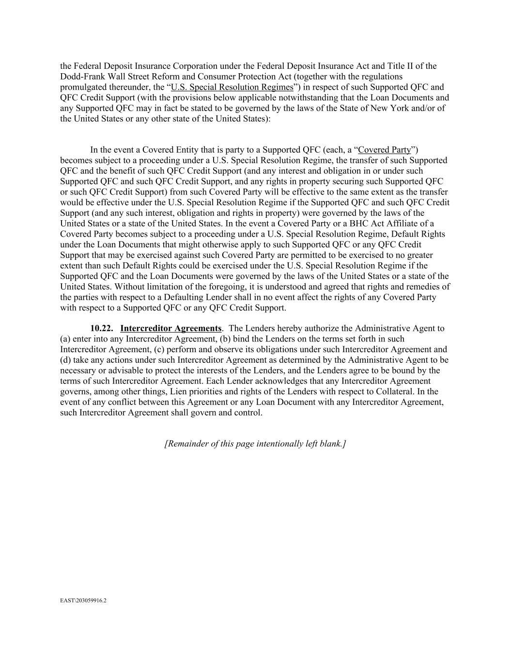 the Federal Deposit Insurance Corporation under the Federal Deposit Insurance Act and Title II of the Dodd-Frank Wall Street Reform and Consumer Protection Act (together with the regulations promulgated thereunder, the “U.S. Special Resolution Regimes”) in respect of such Supported QFC and QFC Credit Support (with the provisions below applicable notwithstanding that the Loan Documents and any Supported QFC may in fact be stated to be governed by the laws of the State of New York and/or of the United States or any other state of the United States): In the event a Covered Entity that is party to a Supported QFC (each, a “Covered Party”) becomes subject to a proceeding under a U.S. Special Resolution Regime, the transfer of such Supported QFC and the benefit of such QFC Credit Support (and any interest and obligation in or under such Supported QFC and such QFC Credit Support, and any rights in property securing such Supported QFC or such QFC Credit Support) from such Covered Party will be effective to the same extent as the transfer would be effective under the U.S. Special Resolution Regime if the Supported QFC and such QFC Credit Support (and any such interest, obligation and rights in property) were governed by the laws of the United States or a state of the United States. In the event a Covered Party or a BHC Act Affiliate of a Covered Party becomes subject to a proceeding under a U.S. Special Resolution Regime, Default Rights under the Loan Documents that might otherwise apply to such Supported QFC or any QFC Credit Support that may be exercised against such Covered Party are permitted to be exercised to no greater extent than such Default Rights could be exercised under the U.S. Special Resolution Regime if the Supported QFC and the Loan Documents were governed by the laws of the United States or a state of the United States. Without limitation of the foregoing, it is understood and agreed that rights and remedies of the parties with respect to a Defaulting Lender shall in no event affect the rights of any Covered Party with respect to a Supported QFC or any QFC Credit Support. 10.22. Intercreditor Agreements. The Lenders hereby authorize the Administrative Agent to (a) enter into any Intercreditor Agreement, (b) bind the Lenders on the terms set forth in such Intercreditor Agreement, (c) perform and observe its obligations under such Intercreditor Agreement and (d) take any actions under such Intercreditor Agreement as determined by the Administrative Agent to be necessary or advisable to protect the interests of the Lenders, and the Lenders agree to be bound by the terms of such Intercreditor Agreement. Each Lender acknowledges that any Intercreditor Agreement governs, among other things, Lien priorities and rights of the Lenders with respect to Collateral. In the event of any conflict between this Agreement or any Loan Document with any Intercreditor Agreement, such Intercreditor Agreement shall govern and control. [Remainder of this page intentionally left blank.] EAST\203059916.2