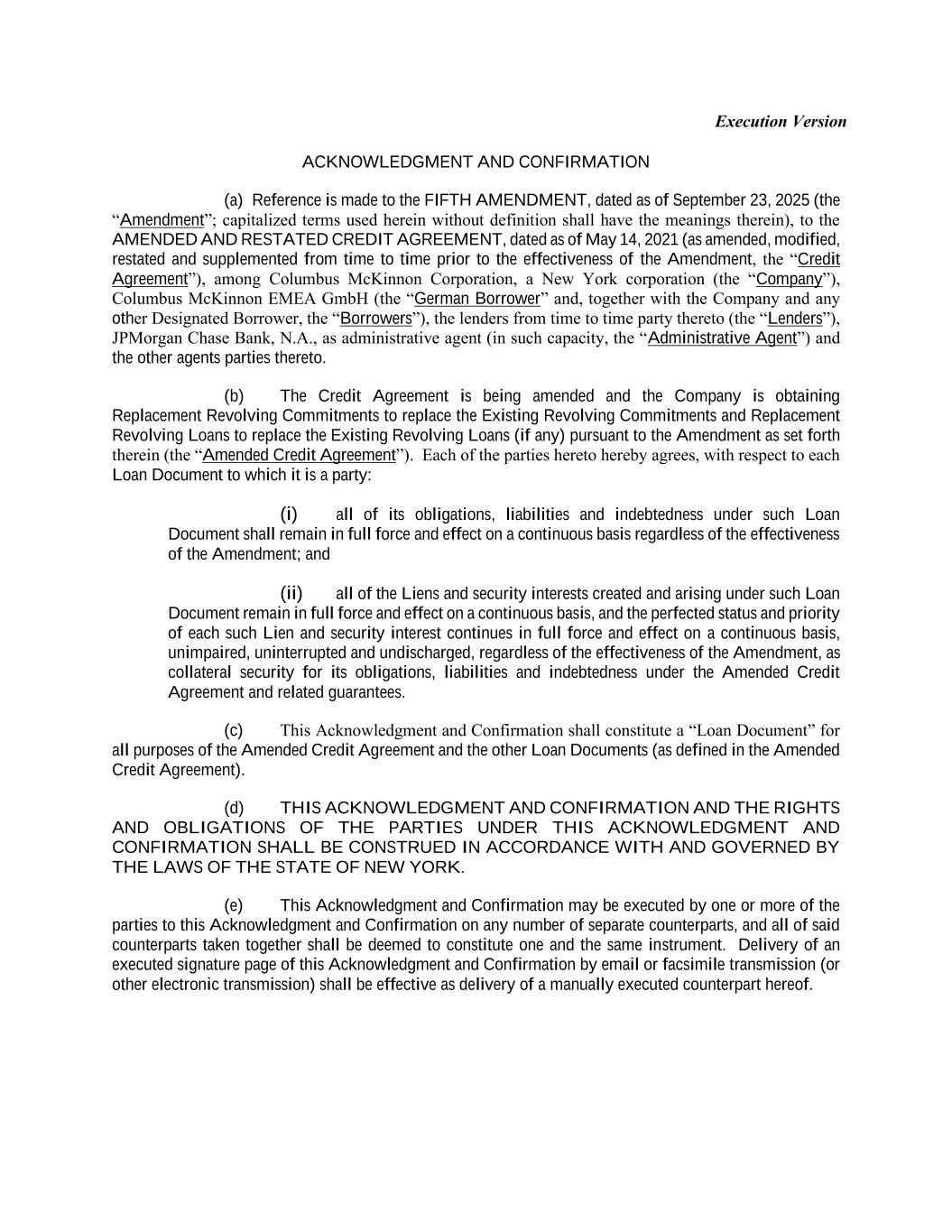 Execution Version ACKNOWLEDGMENT AND CONFIRMATION (a) Reference is made to the FIFTH AMENDMENT, dated as of September 23, 2025 (the “Amendment”; capitalized terms used herein without definition shall have the meanings therein), to the AMENDED AND RESTATED CREDIT AGREEMENT, dated as of May 14, 2021 (as amended, modified, restated and supplemented from time to time prior to the effectiveness of the Amendment, the “Credit Agreement”), among Columbus McKinnon Corporation, a New York corporation (the “Company”), Columbus McKinnon EMEA GmbH (the “German Borrower” and, together with the Company and any other Designated Borrower, the “Borrowers”), the lenders from time to time party thereto (the “Lenders”), JPMorgan Chase Bank, N.A., as administrative agent (in such capacity, the “Administrative Agent”) and the other agents parties thereto. (b) The Credit Agreement is being amended and the Company is obtaining Replacement Revolving Commitments to replace the Existing Revolving Commitments and Replacement Revolving Loans to replace the Existing Revolving Loans (if any) pursuant to the Amendment as set forth therein (the “Amended Credit Agreement”). Each of the parties hereto hereby agrees, with respect to each Loan Document to which it is a party: (i) all of its obligations, liabilities and indebtedness under such Loan Document shall remain in full force and effect on a continuous basis regardless of the effectiveness of the Amendment; and (ii) all of the Liens and security interests created and arising under such Loan Document remain in full force and effect on a continuous basis, and the perfected status and priority of each such Lien and security interest continues in full force and effect on a continuous basis, unimpaired, uninterrupted and undischarged, regardless of the effectiveness of the Amendment, as collateral security for its obligations, liabilities and indebtedness under the Amended Credit Agreement and related guarantees. (c) This Acknowledgment and Confirmation shall constitute a “Loan Document” for all purposes of the Amended Credit Agreement and the other Loan Documents (as defined in the Amended Credit Agreement). (d) THIS ACKNOWLEDGMENT AND CONFIRMATION AND THE RIGHTS AND OBLIGATIONS OF THE PARTIES UNDER THIS ACKNOWLEDGMENT AND CONFIRMATION SHALL BE CONSTRUED IN ACCORDANCE WITH AND GOVERNED BY THE LAWS OF THE STATE OF NEW YORK. (e) This Acknowledgment and Confirmation may be executed by one or more of the parties to this Acknowledgment and Confirmation on any number of separate counterparts, and all of said counterparts taken together shall be deemed to constitute one and the same instrument. Delivery of an executed signature page of this Acknowledgment and Confirmation by email or facsimile transmission (or other electronic transmission) shall be effective as delivery of a manually executed counterpart hereof.
