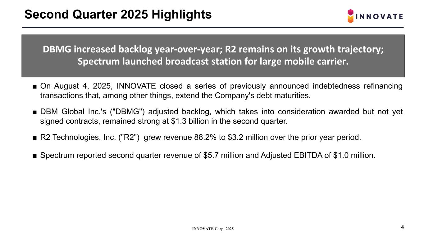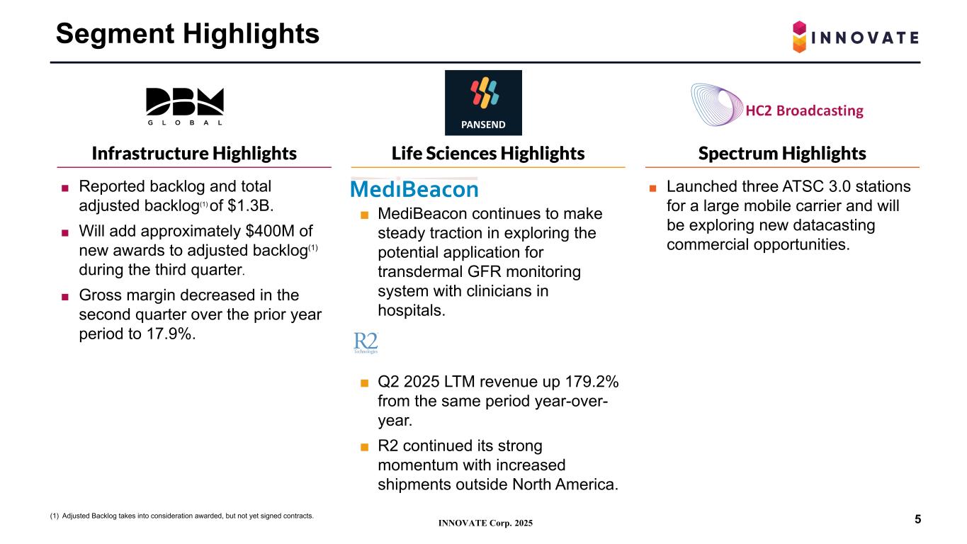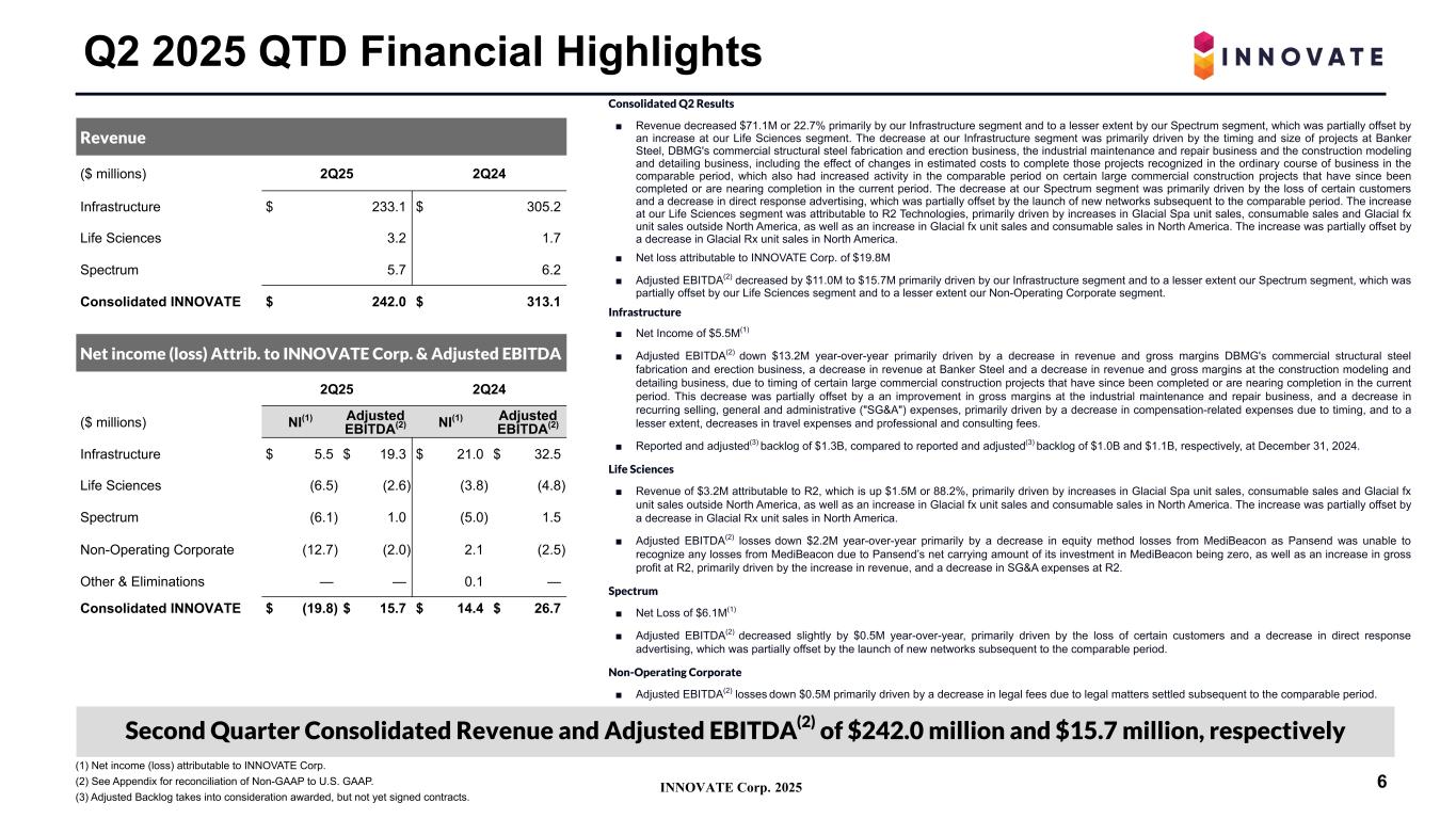 「イノベートは今期も、特に規律ある執行の維持と、長期的な価値創造を支える戦略的機会の追求において、事業部門全体で力強い前進を続けました。最近の借り換え取引により、戦略的計画の実行に集中することができます。「インフラ部門の第2四半期の調整後受注残高は13億ドルと好調を維持し、長期的な成長を確実にする新規プロジェクトの獲得に継続的に取り組んでいるチームを誇りに思います。ライフサイエンス分野では、1月に発表されたメディビーコンのTGFRシステムのFDA承認を受けて関心が大幅に高まっており、R2も力強い成長軌道を維持しています。スペクトラム部門は前年同期比で若干業績が落ち込みましたが、これは上半期の市場が厳しく変化していたことを物語っています。"