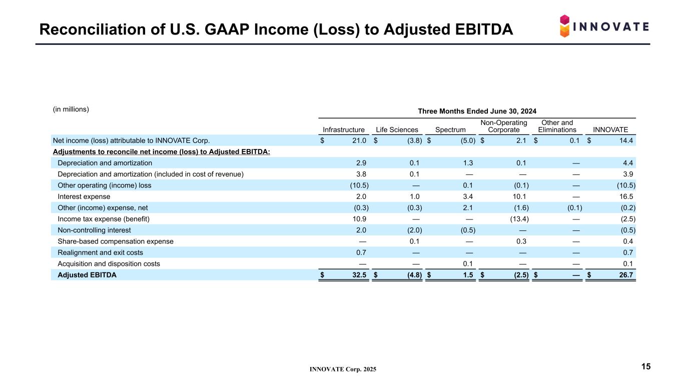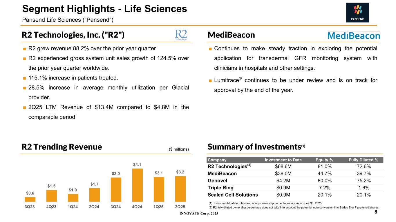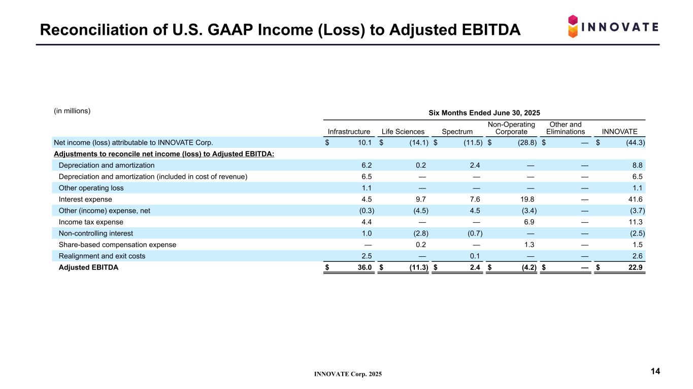 「イノベートは今期も、特に規律ある執行の維持と、長期的な価値創造を支える戦略的機会の追求において、事業部門全体で力強い前進を続けました。最近の借り換え取引により、戦略的計画の実行に集中することができます。「インフラ部門の第2四半期の調整後受注残高は13億ドルと好調を維持し、長期的な成長を確実にする新規プロジェクトの獲得に継続的に取り組んでいるチームを誇りに思います。ライフサイエンス分野では、1月に発表されたメディビーコンのTGFRシステムのFDA承認を受けて関心が大幅に高まっており、R2も力強い成長軌道を維持しています。スペクトラム部門は前年同期比で若干業績が落ち込みましたが、これは上半期の市場が厳しく変化していたことを物語っています。"