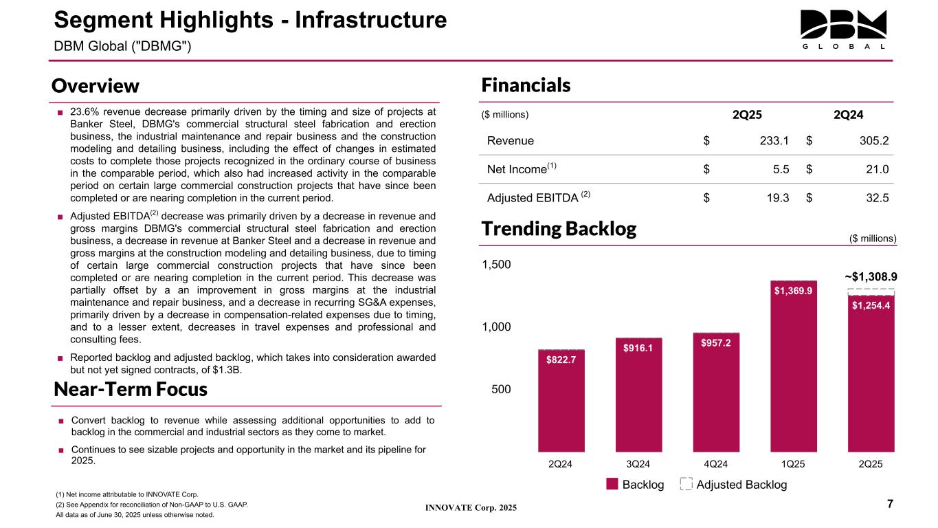 -DBMグローバル(以下「DBMG」)の2025年度第2四半期の売上高は、前年同期の3億520万ドルに対し23.6%減の2億3,310万ドルとなった。INNOVATEに帰属する純利益は、前年同期の2,100万ドルに対し550万ドル。調整後EBITDAは前年同期の3,250万ドルから1,930万ドルに減少した。