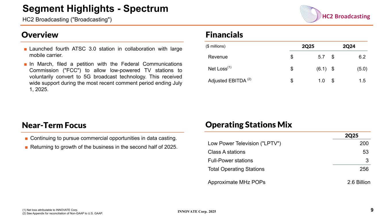 -放送事業の2025年度第2四半期の売上は、前年同期の620万ドルに対し570万ドル。INNOVATEに帰属する純損失は610万ドル(前年同期は500万ドル)。調整後EBITDAは前年同期の150万ドルに対し、100万ドル。
