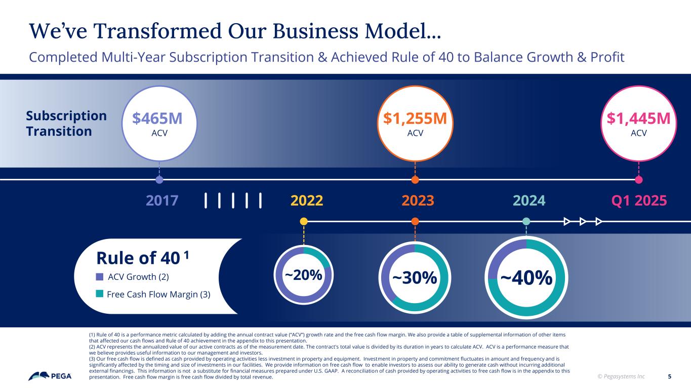 © Pegasystems Inc 4 To Ask a Question... Email pegainvestorrelations@pega.com peter.welburn@pega.com on the PHONE in the ROOM Raise your hand1 Please state your name and the firm you are with3 Wait for the microphone2 ? ?