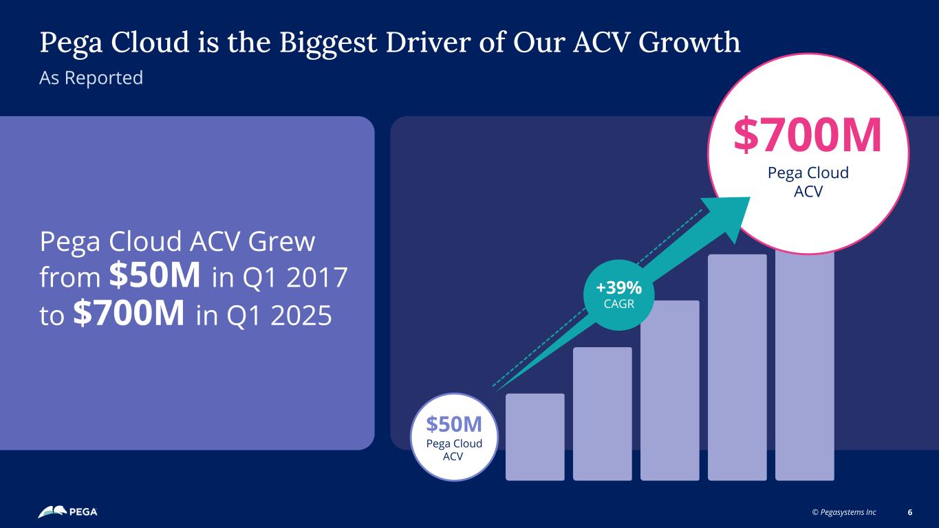 © Pegasystems Inc 5 Completed Multi-Year Subscription Transition & Achieved Rule of 40 to Balance Growth & Profit (1) Rule of 40 is a performance metric calculated by adding the annual contract value (“ACV”) growth rate and the free cash flow margin. We also provide a table of supplemental information of other items that affected our cash flows and Rule of 40 achievement in the appendix to this presentation. (2) ACV represents the annualized value of our active contracts as of the measurement date. The contract's total value is divided by its duration in years to calculate ACV. ACV is a performance measure that we believe provides useful information to our management and investors. (3) Our free cash flow is defined as cash provided by operating activities less investment in property and equipment. Investment in property and commitment fluctuates in amount and frequency and is significantly affected by the timing and size of investments in our facilities. We provide information on free cash flow to enable investors to assess our ability to generate cash without incurring additional external financings. This information is not a substitute for financial measures prepared under U.S. GAAP. A reconciliation of cash provided by operating activities to free cash flow is in the appendix to this presentation. Free cash flow margin is free cash flow divided by total revenue. We’ve Transformed Our Business Model... Rule of 40 1 ACV Growth (2) Free Cash Flow Margin (3) Subscription Transition 20242022 20232017 Q1 2025 ~40%~20% ~30% $465M ACV $1,255M ACV $1,445M ACV
