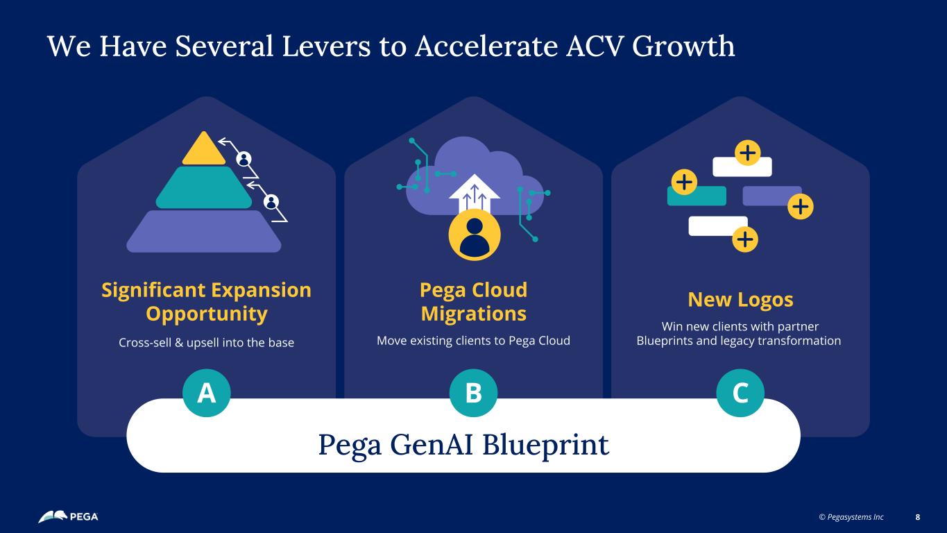 © Pegasystems Inc 7 Our ACV Growth is Durable ACV Increased 13 Percent Year Over Year from 3/31/24 to 3/31/25 (as reported) High Retention Rates, Strong Customer Loyalty Pega GenAI BlueprintTM Best-in-class solutions Technology Leadership Big Market Opportunity Enterprise clients moving to the cloud to digitally transform mission critical- use cases in key verticals Usage-Based Pricing Model Case-based pricing approach – expands with usage