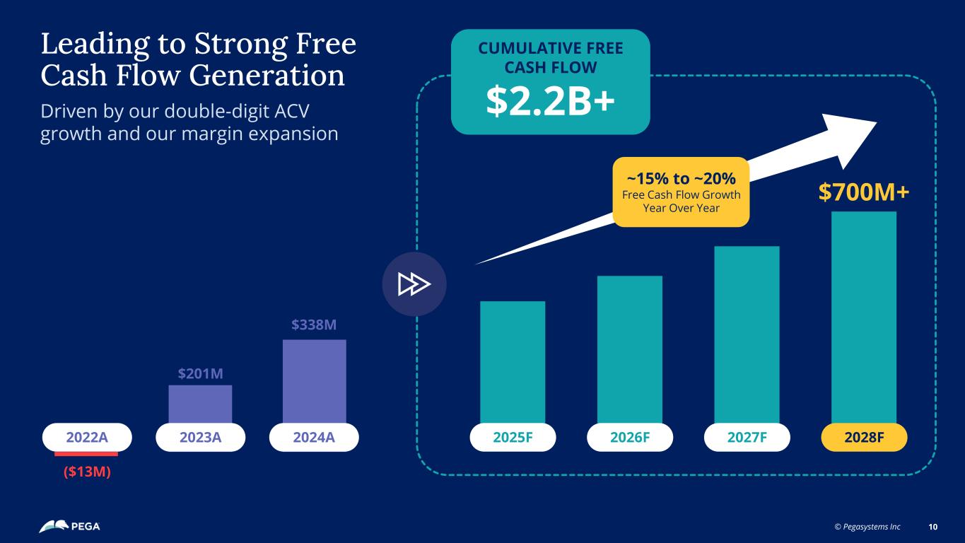 © Pegasystems Inc 9 Long-term financial model (progress since last year) And Our Margins Have Been Improving Over Time From… To 2027/ 2028 Target 2022 % of revenue 2023 2024 80%74%Gross Margin 1 76% 76% 30%43%Sales & Marketing 1 35% 32% 17%20% Research & Development 1 18% 18% LONG-TERM MODEL TIMELINE (1) Financial metrics (other than revenue) presented are non-GAAP. For additional information, including a reconciliation of GAAP and non-GAAP measures, refer to the schedules at the end of this document.