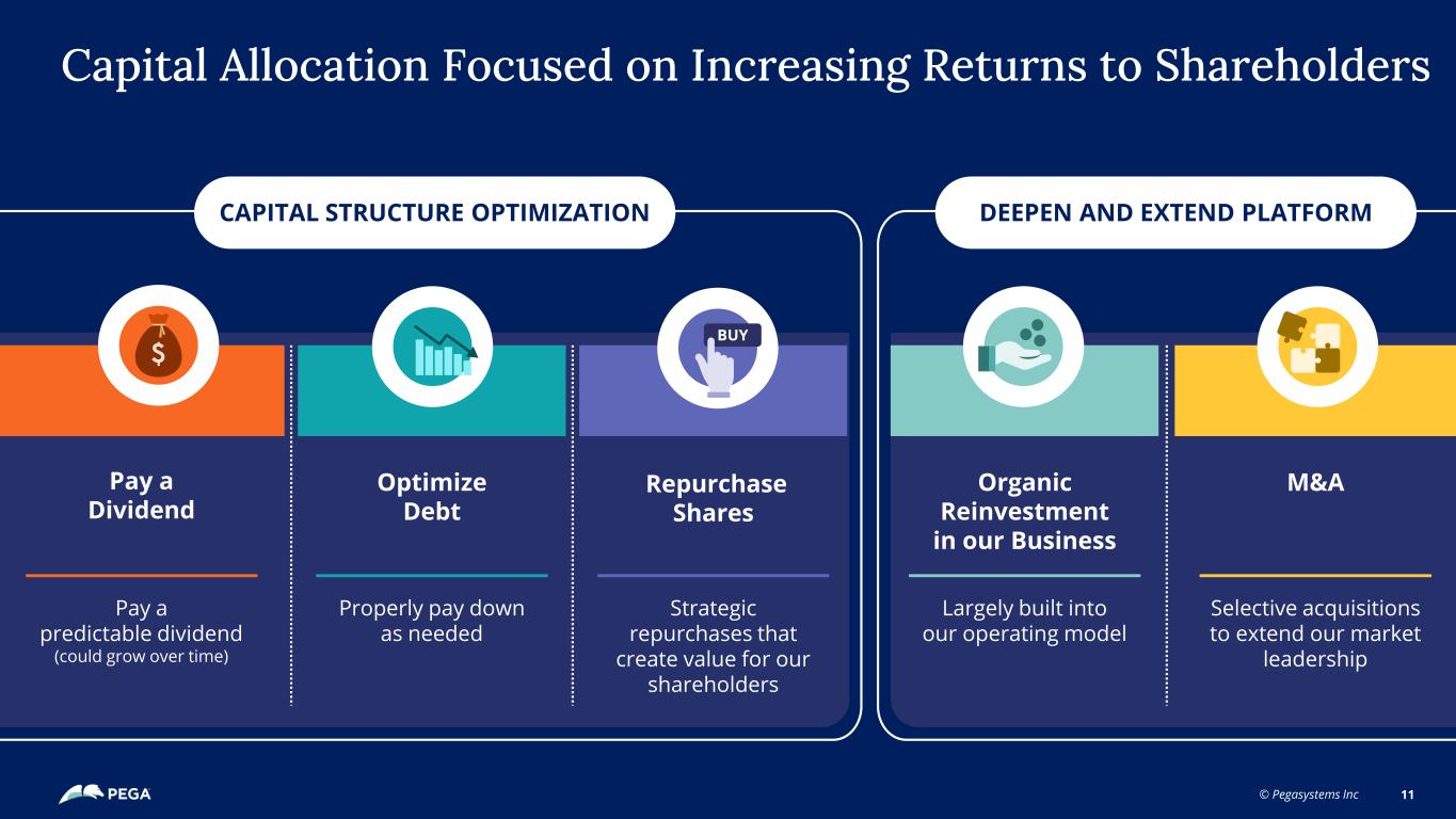 © Pegasystems Inc 10 Driven by our double-digit ACV growth and our margin expansion Leading to Strong Free Cash Flow Generation 2022A 2023A 2024A ($13M) $201M $338M 2025F 2026F 2027F 2028F CUMULATIVE FREE CASH FLOW $2.2B+ $700M+ ~15% to ~20% Free Cash Flow Growth Year Over Year