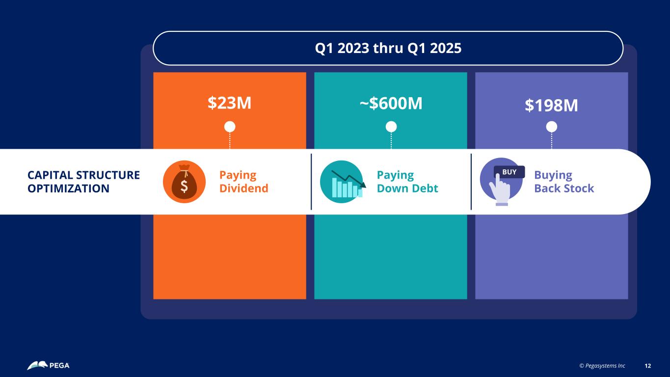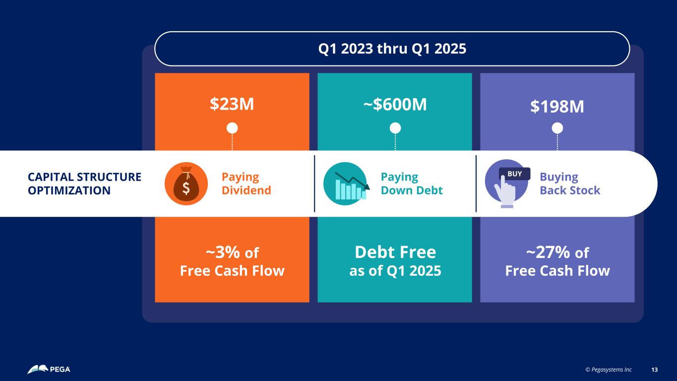 © Pegasystems Inc $198M~$600M$23M BUY Buying Back Stock Paying Dividend Paying Down Debt CAPITAL STRUCTURE OPTIMIZATION Q1 2023 thru Q1 2025 12