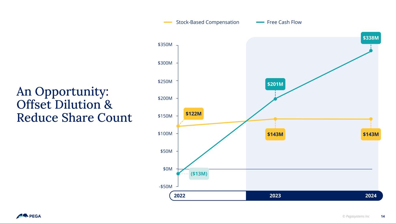 © Pegasystems Inc Q1 2023 thru Q1 2025 $198M~$600M$23M 13 BUY Buying Back Stock Paying Dividend Paying Down Debt CAPITAL STRUCTURE OPTIMIZATION ~3% of Free Cash Flow ~27% of Free Cash Flow Debt Free as of Q1 2025